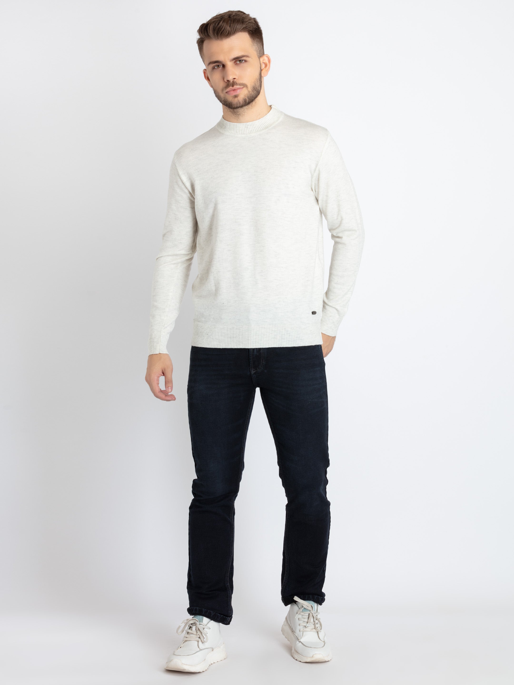 ECRU MEL. Solid Sweater has Turtle Neck, Full Sleeves.