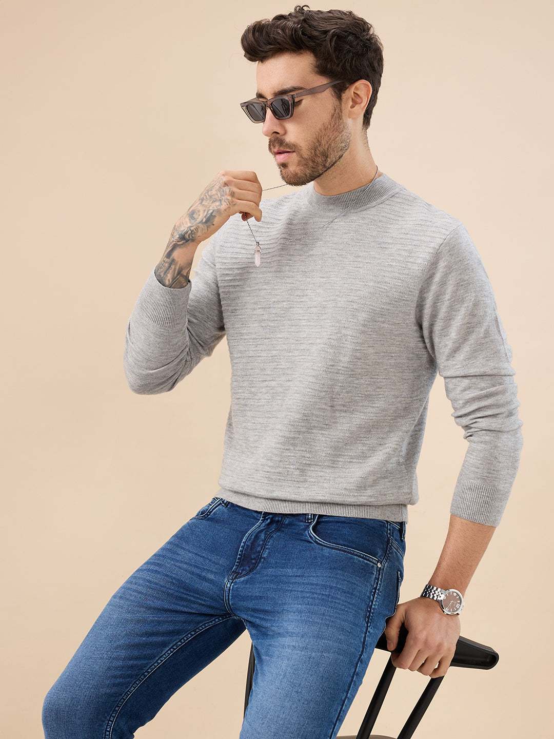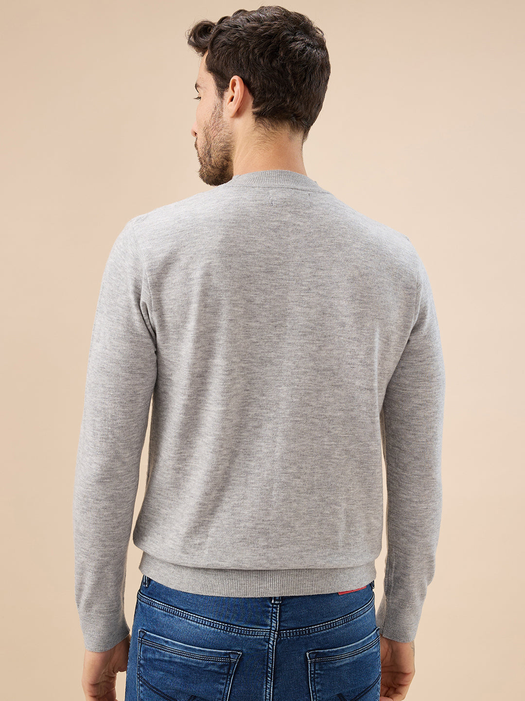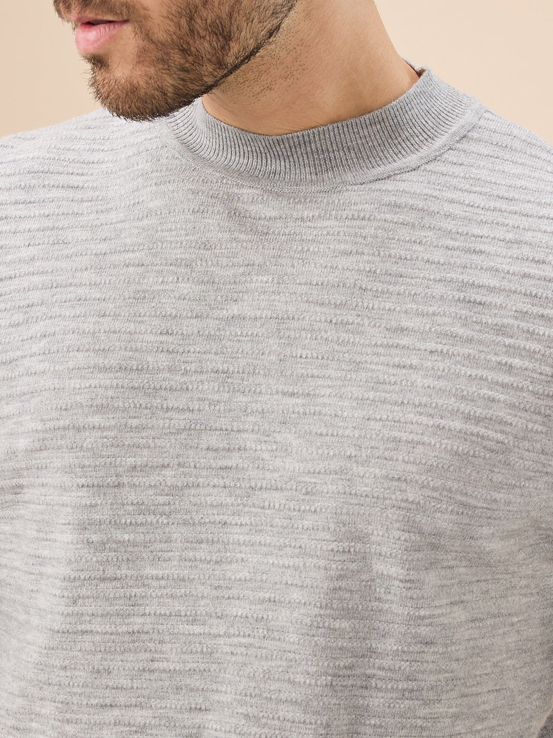 GREY MEL Men's Solid Textured Full Sleeves Round Neck Regular Fit Fleece Sweater
