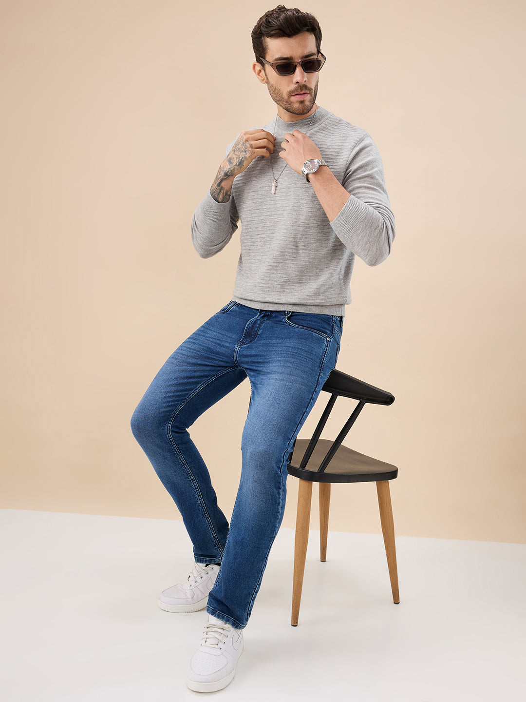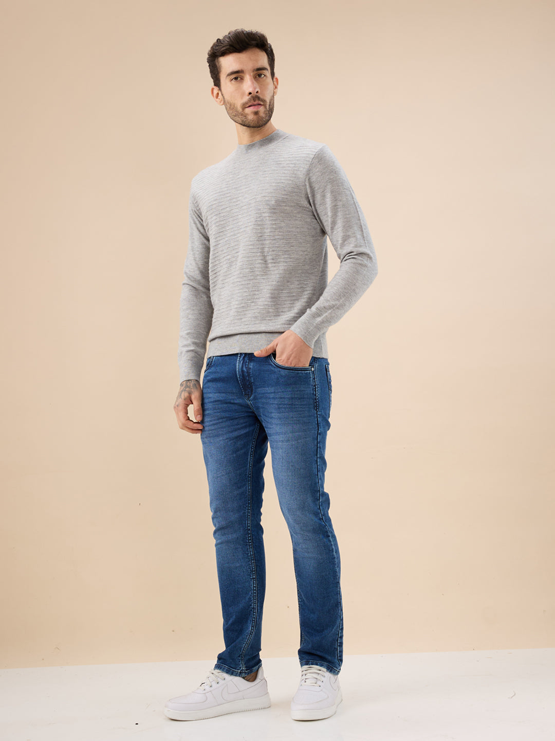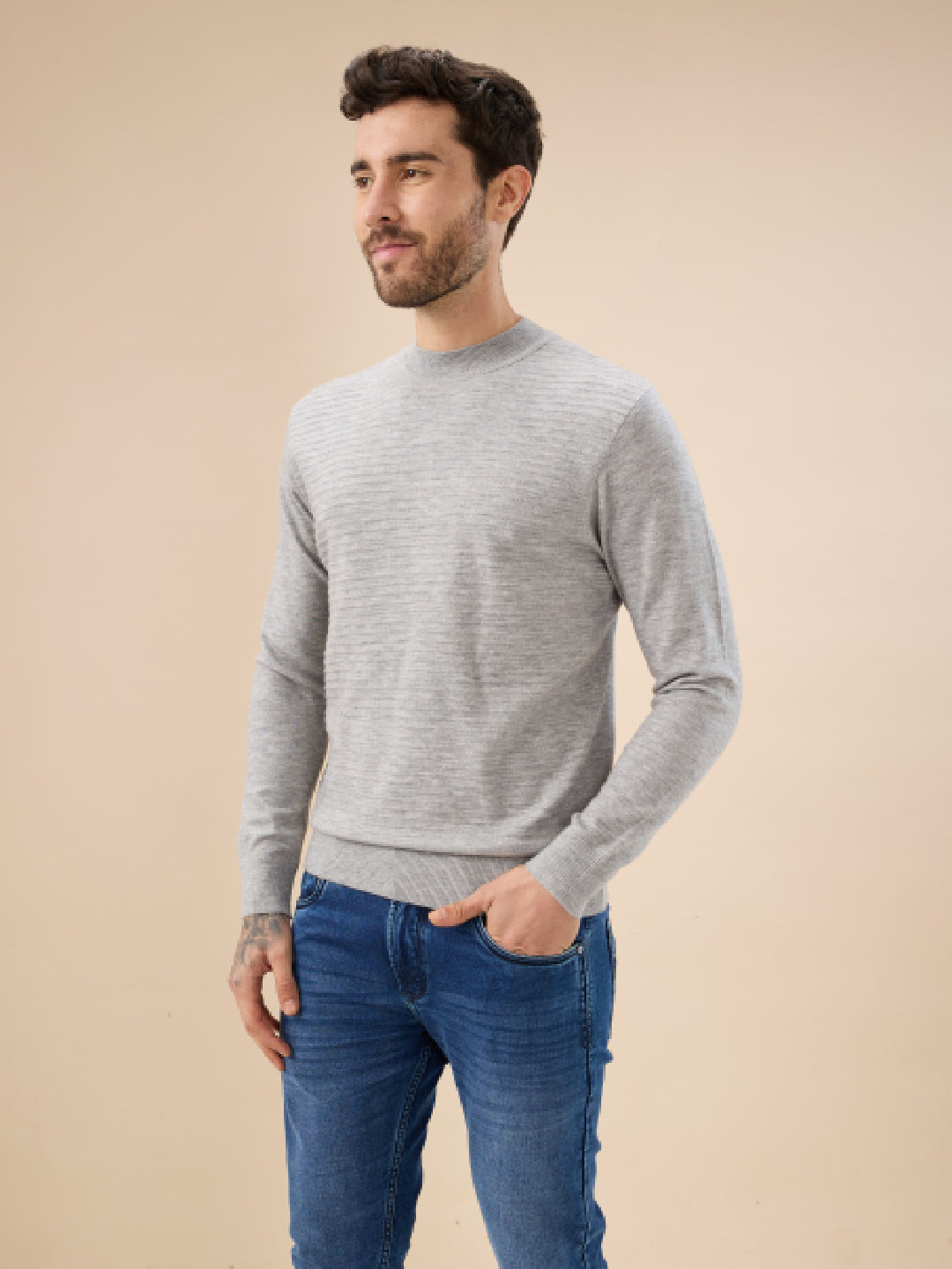 GREY MEL Men's Solid Textured Full Sleeves Round Neck Regular Fit Fleece Sweater
