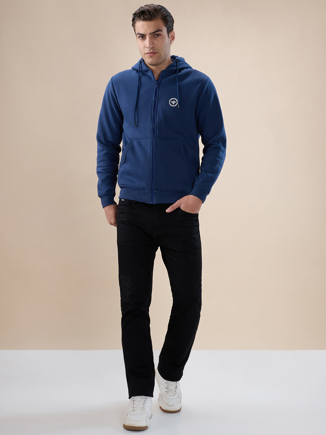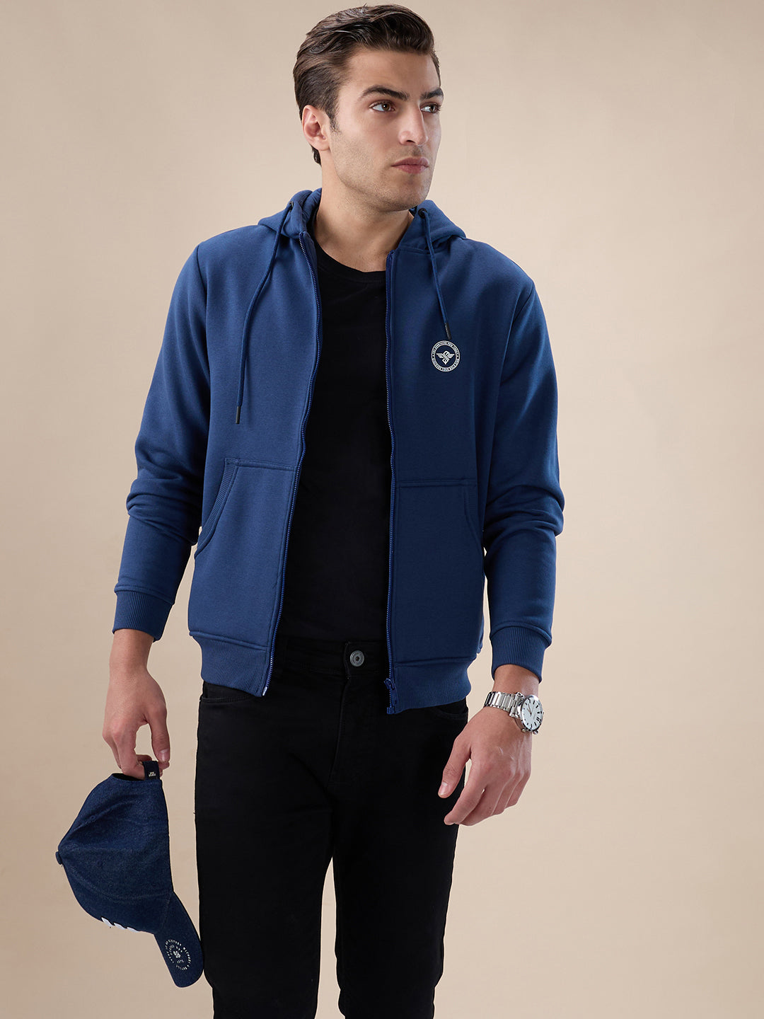 DENIM Men's Chest Brand Logo Printed Regular Fit Hooded Fleece Zip Up Sweatshirt