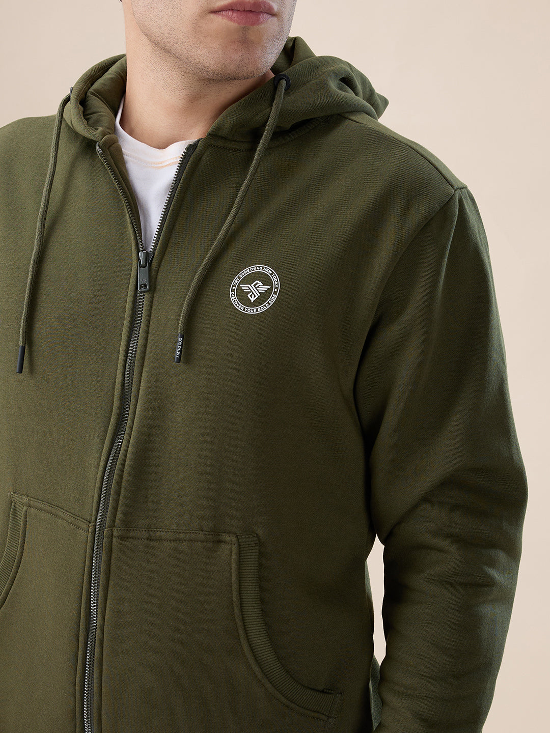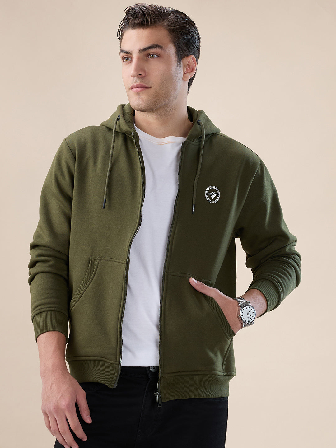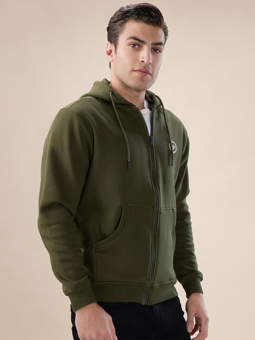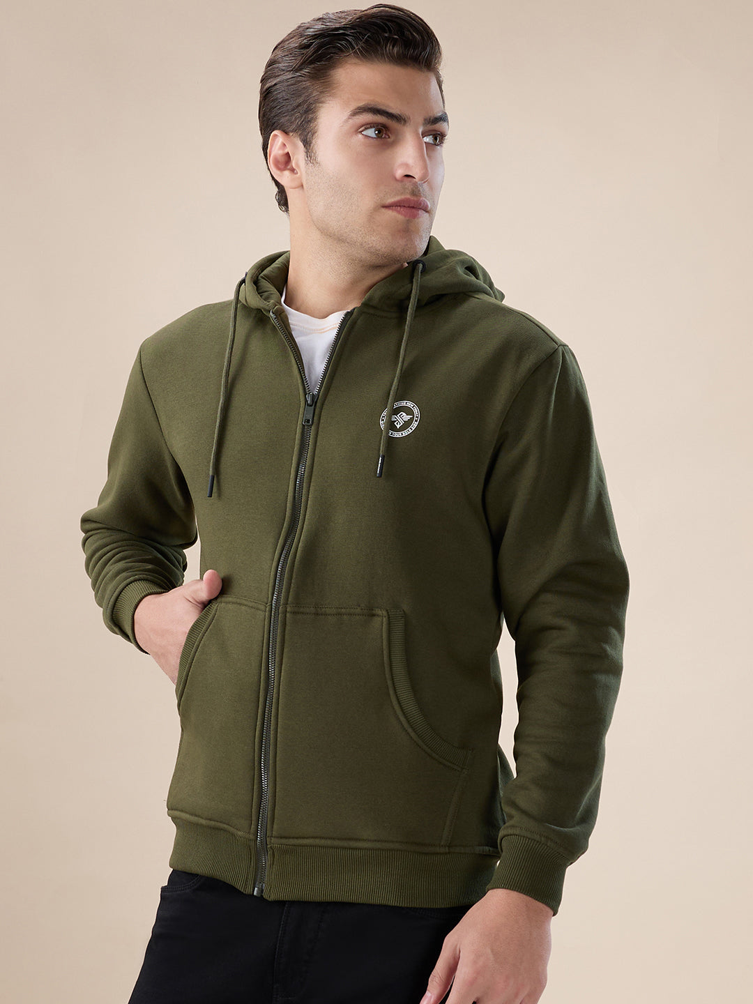 OLIVE Men's Chest Brand Logo Printed Regular Fit Hooded Fleece Zip Up Sweatshirt