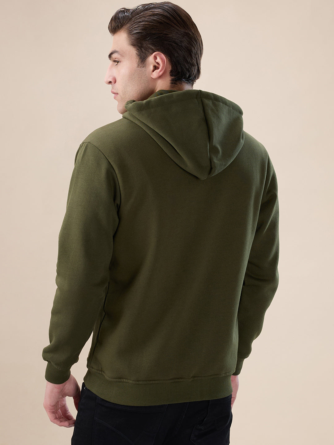 OLIVE Men's Chest Brand Logo Printed Regular Fit Hooded Fleece Zip Up Sweatshirt