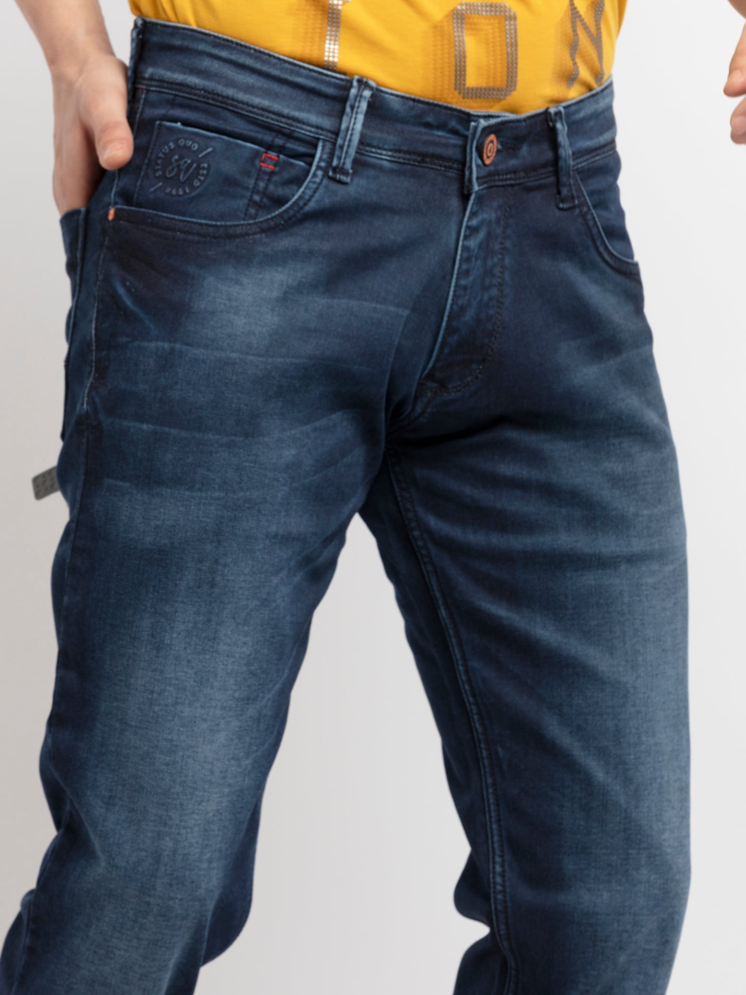 Navy Men's Slim Fit Denim Jeans has Dark Indigo Wash, Pattern 5 Pockets, Slim Fit