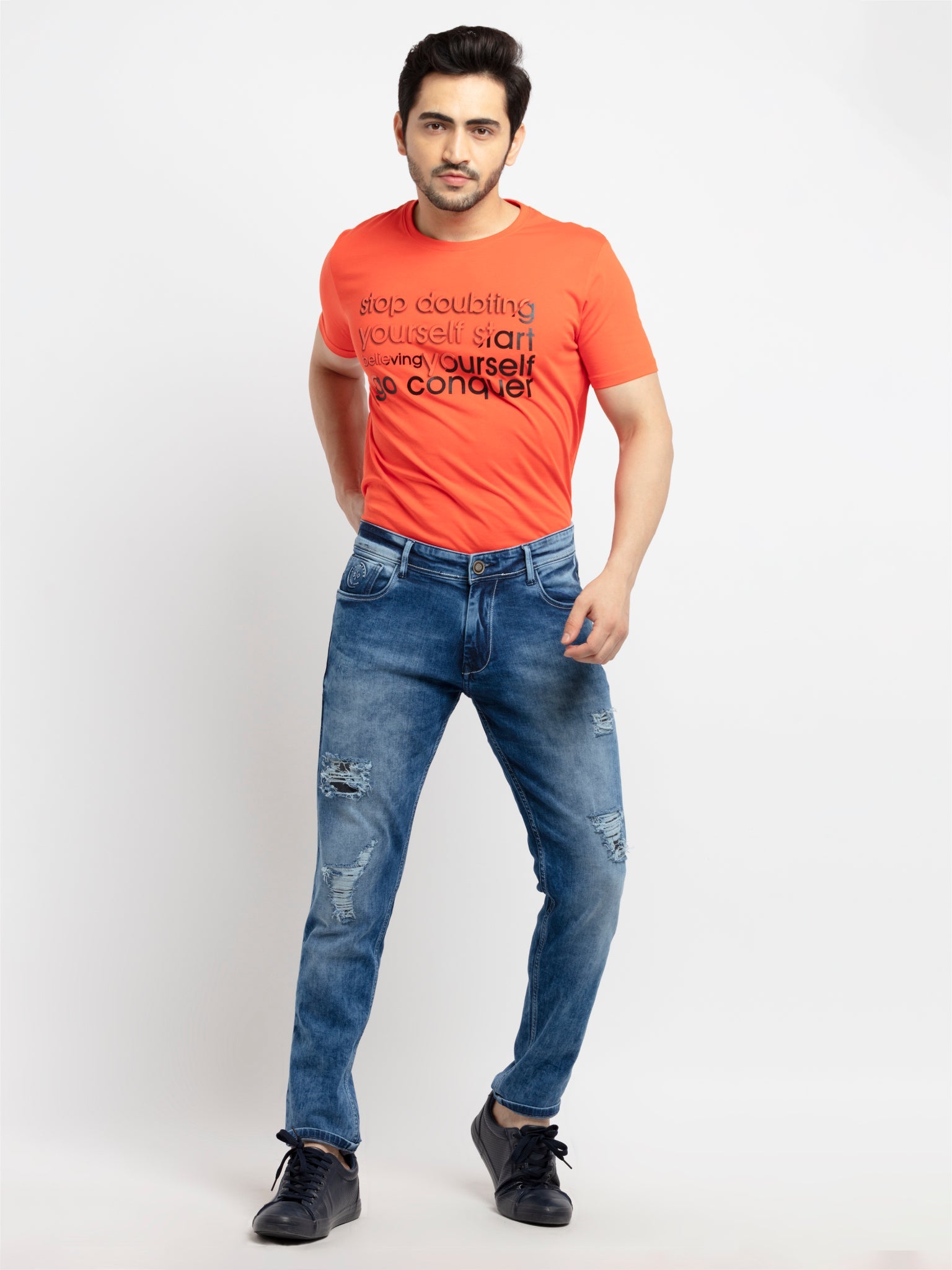 Blue Men's Slim Fit Denim Jeans has Light Blue With Tearing Effects Wash, Pattern 5 Pockets, Slim Fit