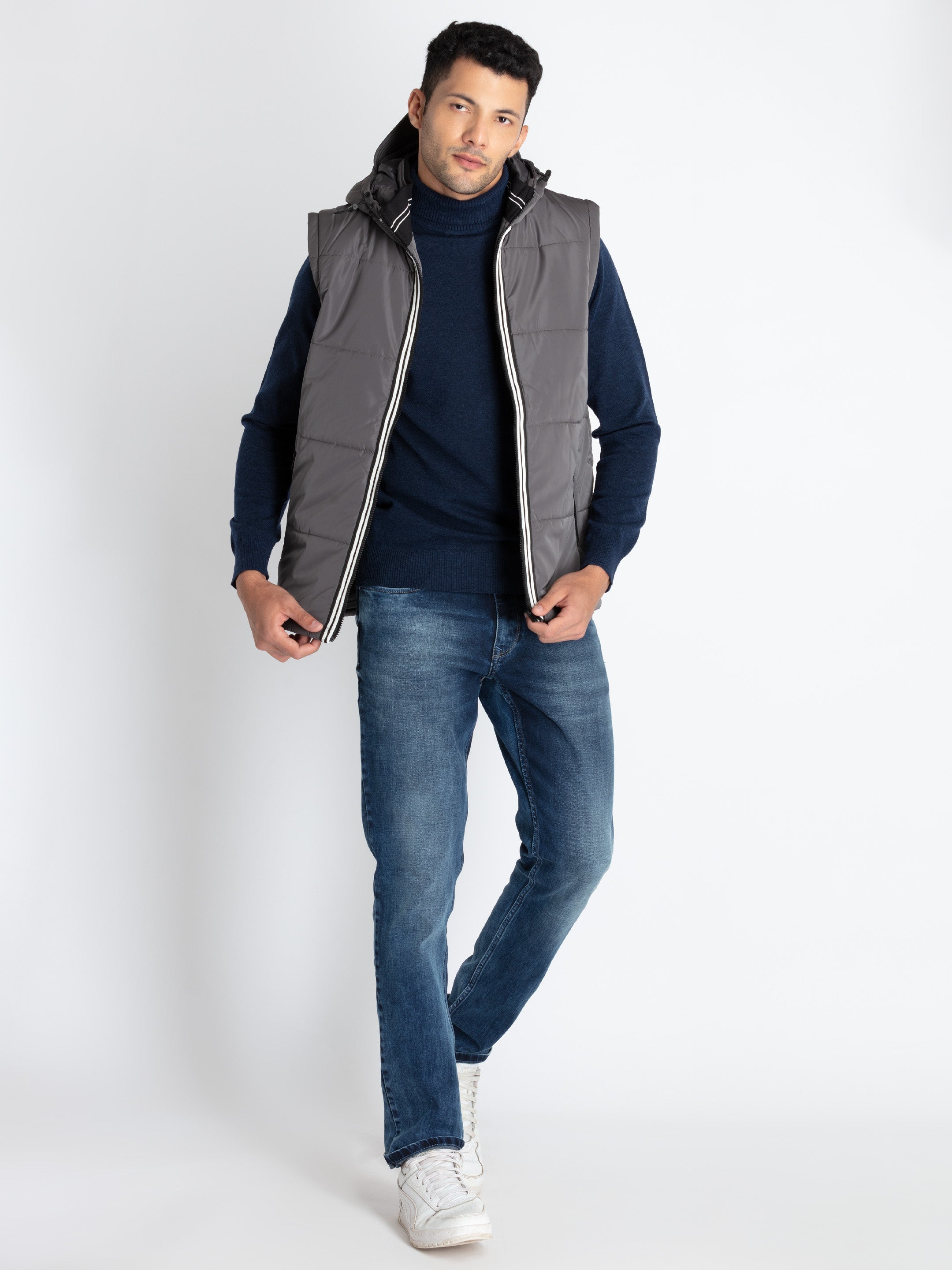 GREY Jacket has Hooded Neck, Full Sleeves