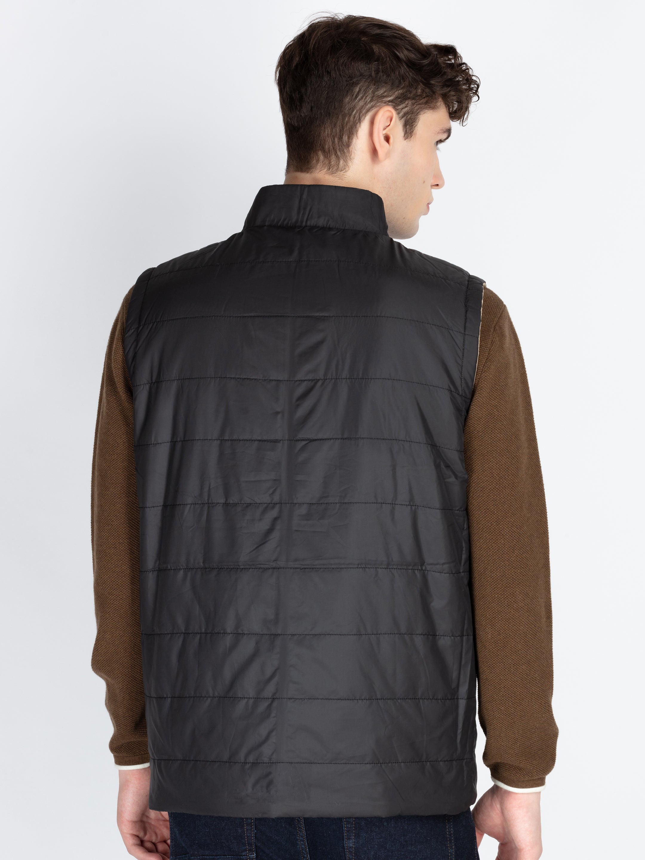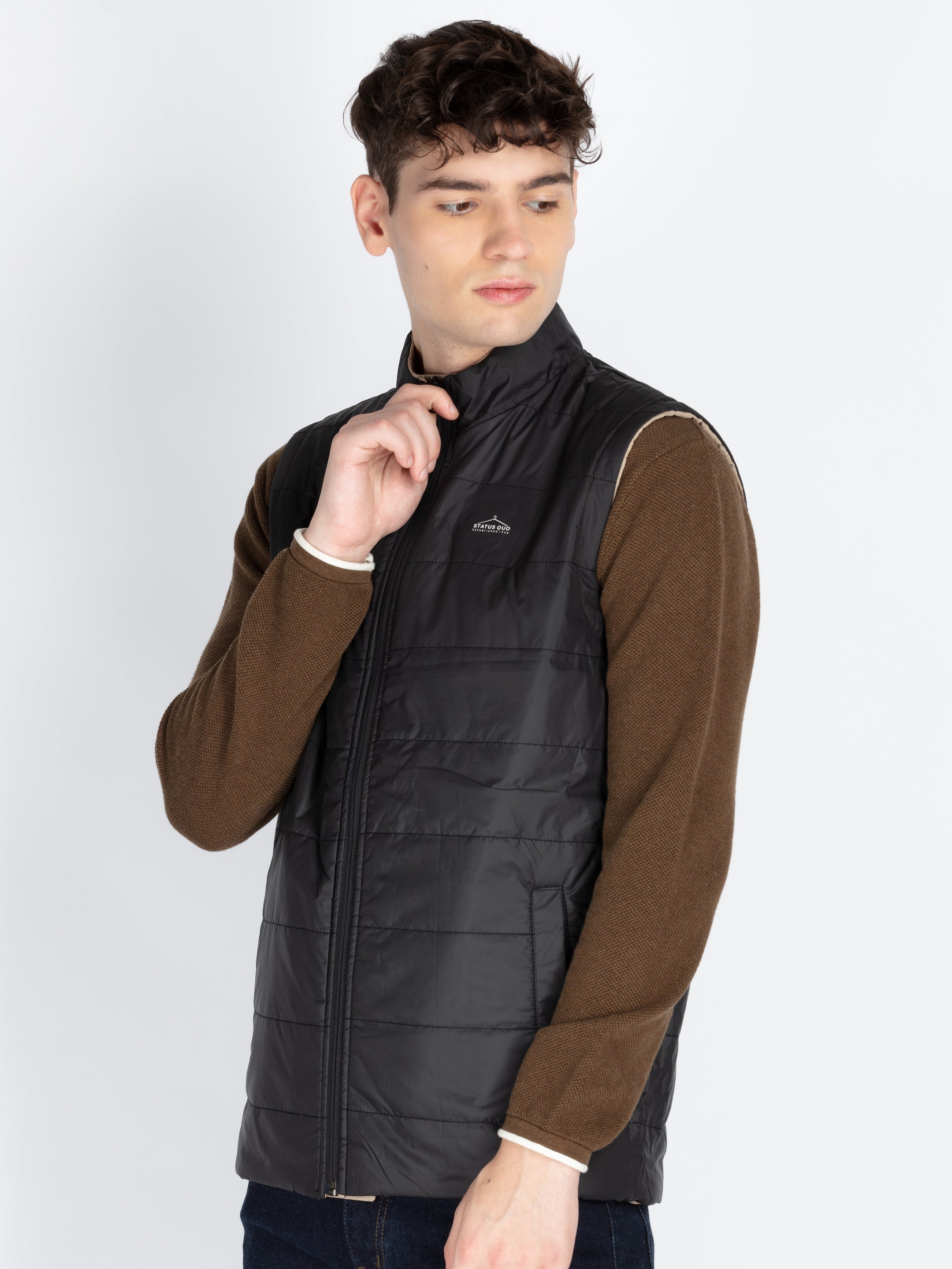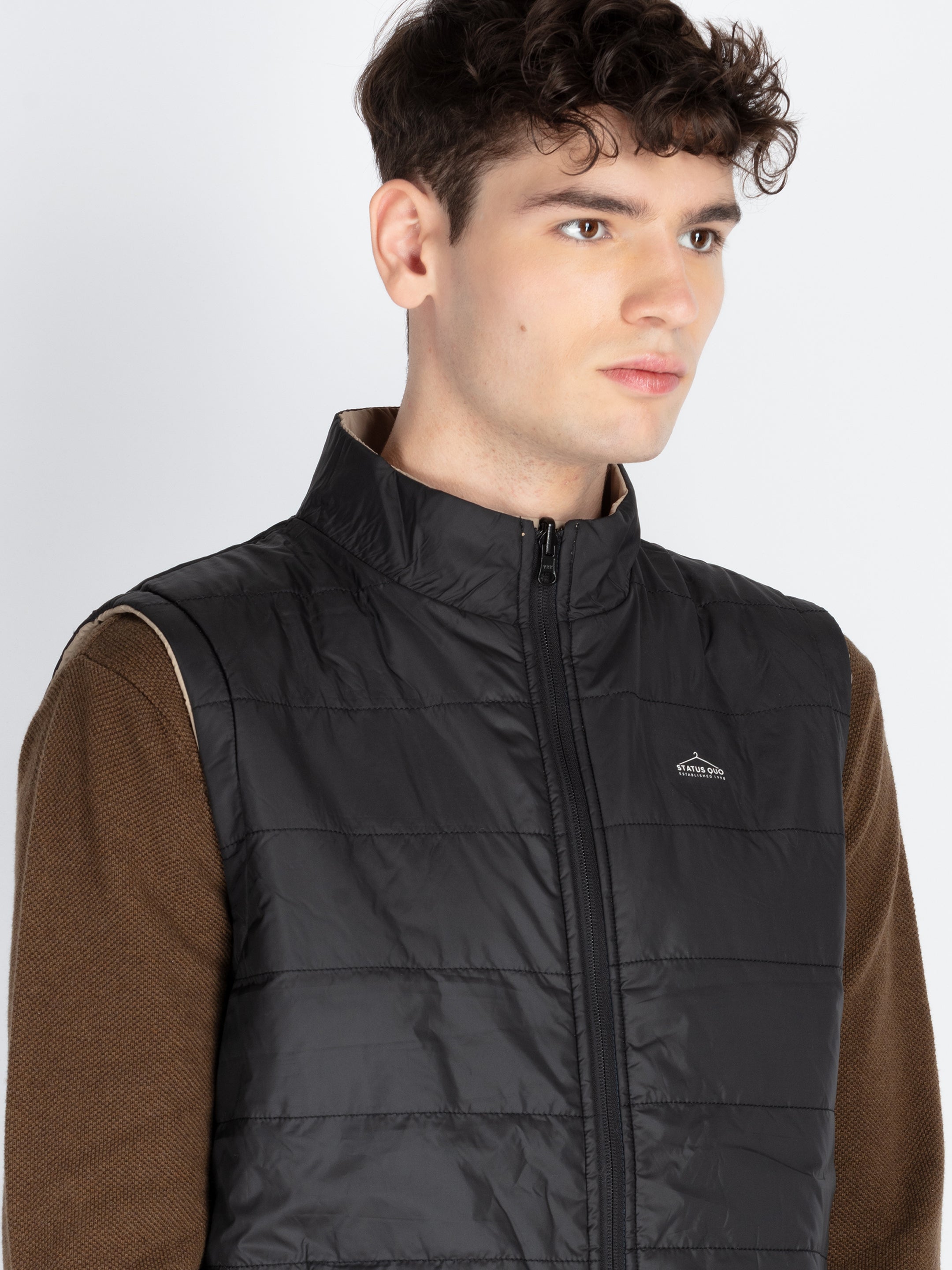 Khaki/Black Mens Sleeveless Reversible Puffer Jacket Has High Neck with Sleeveless.