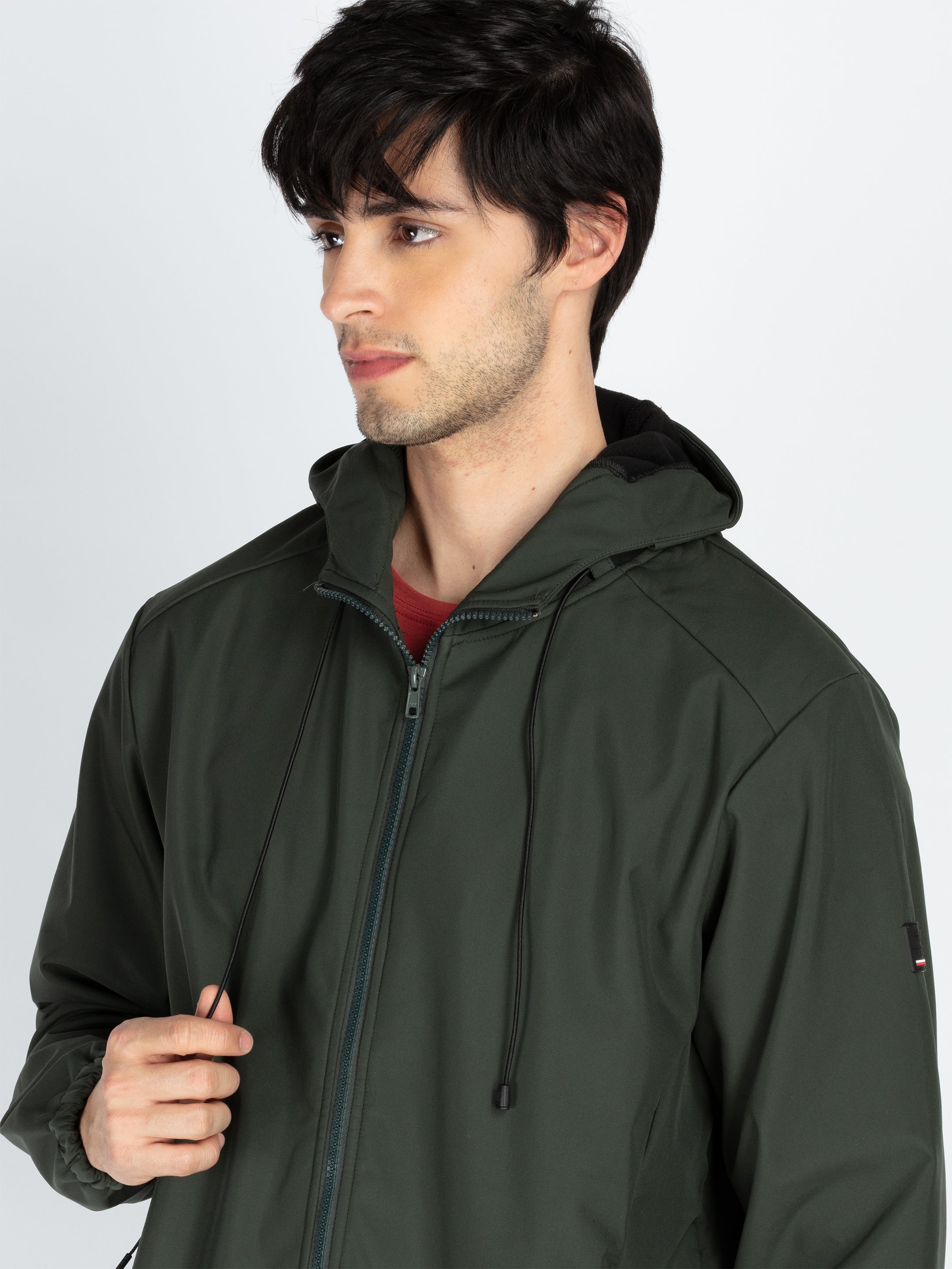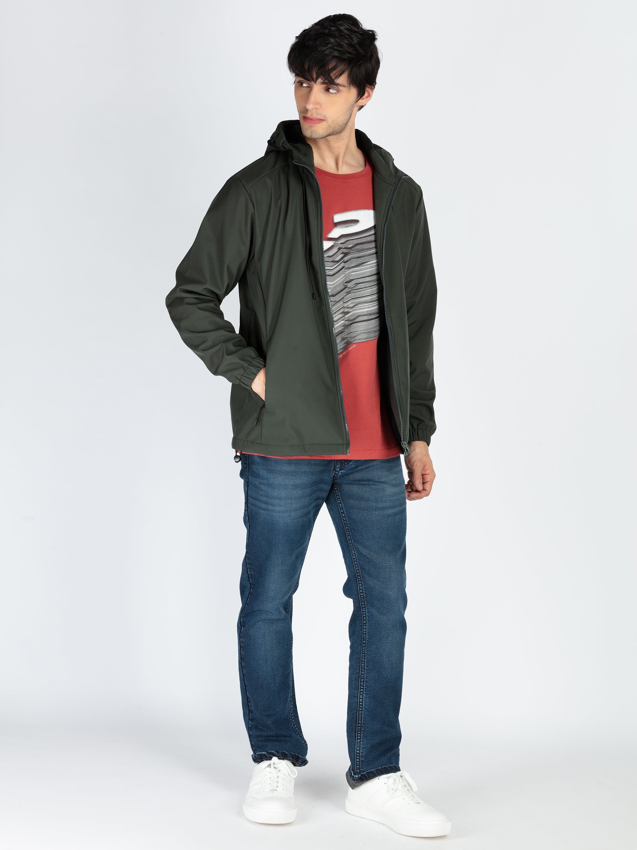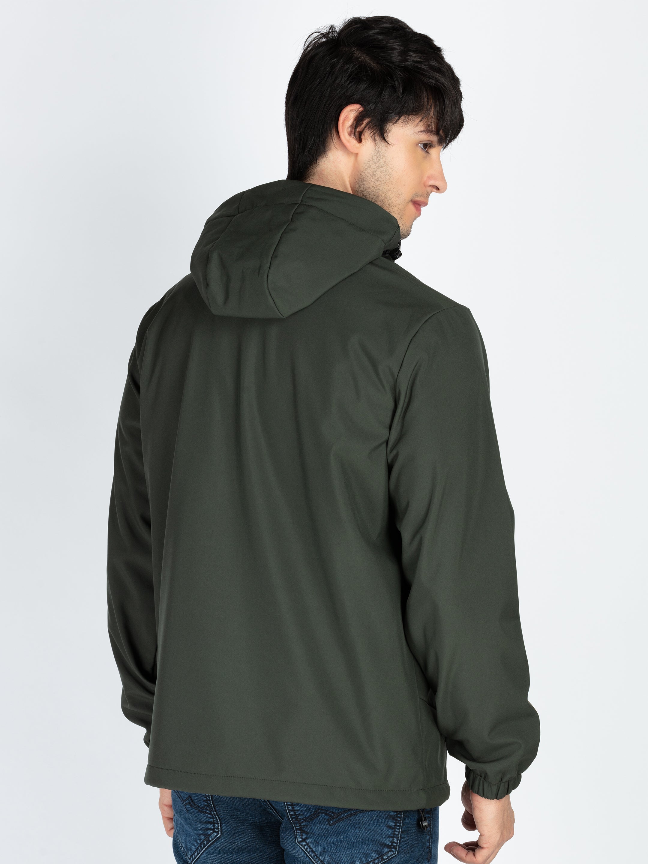 Olive Mens Solid Hooded Jacket Has Hooded Neck with Full Sleeves.