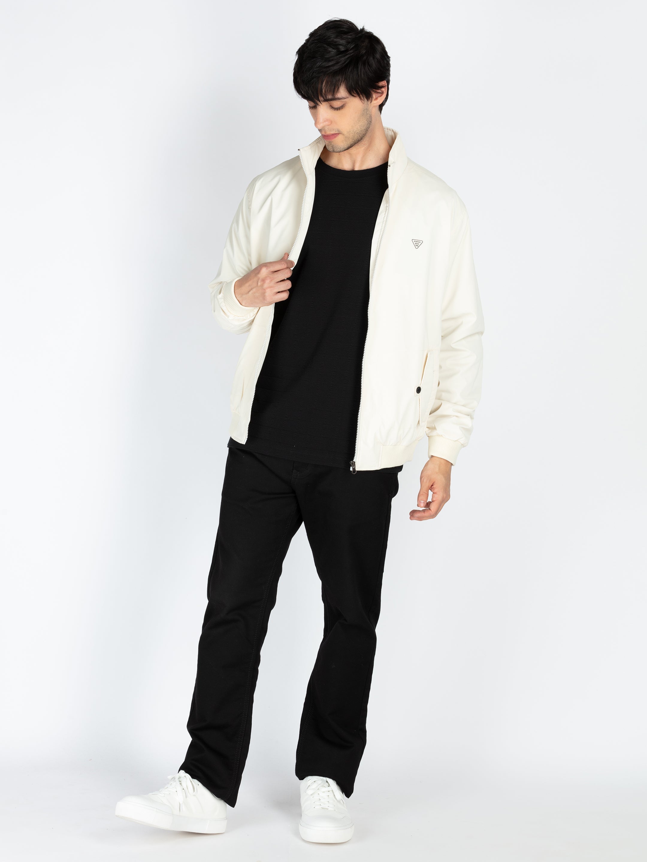 Off White Mens Solid High Neck Jacket with Full Sleeves.