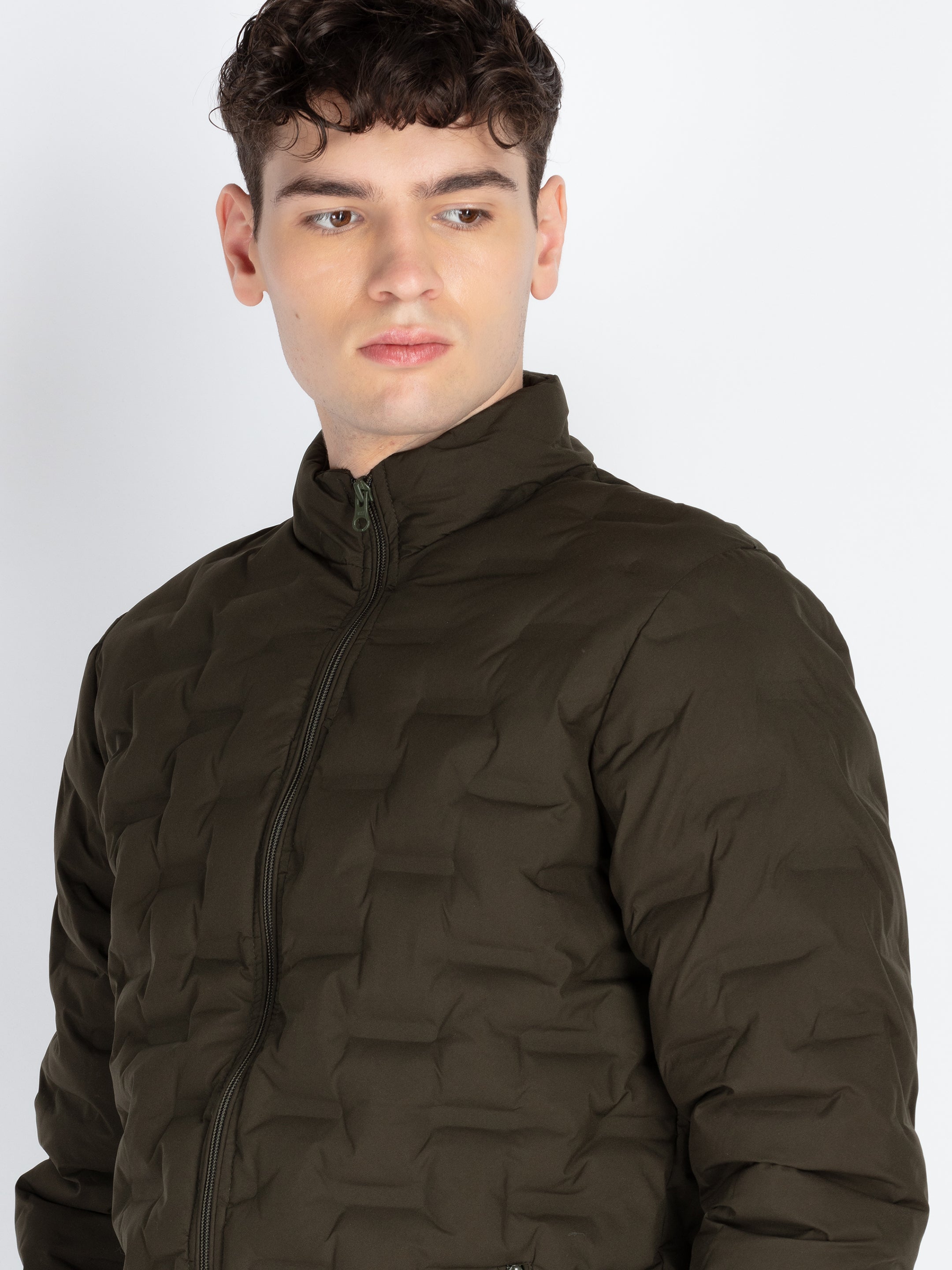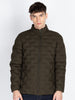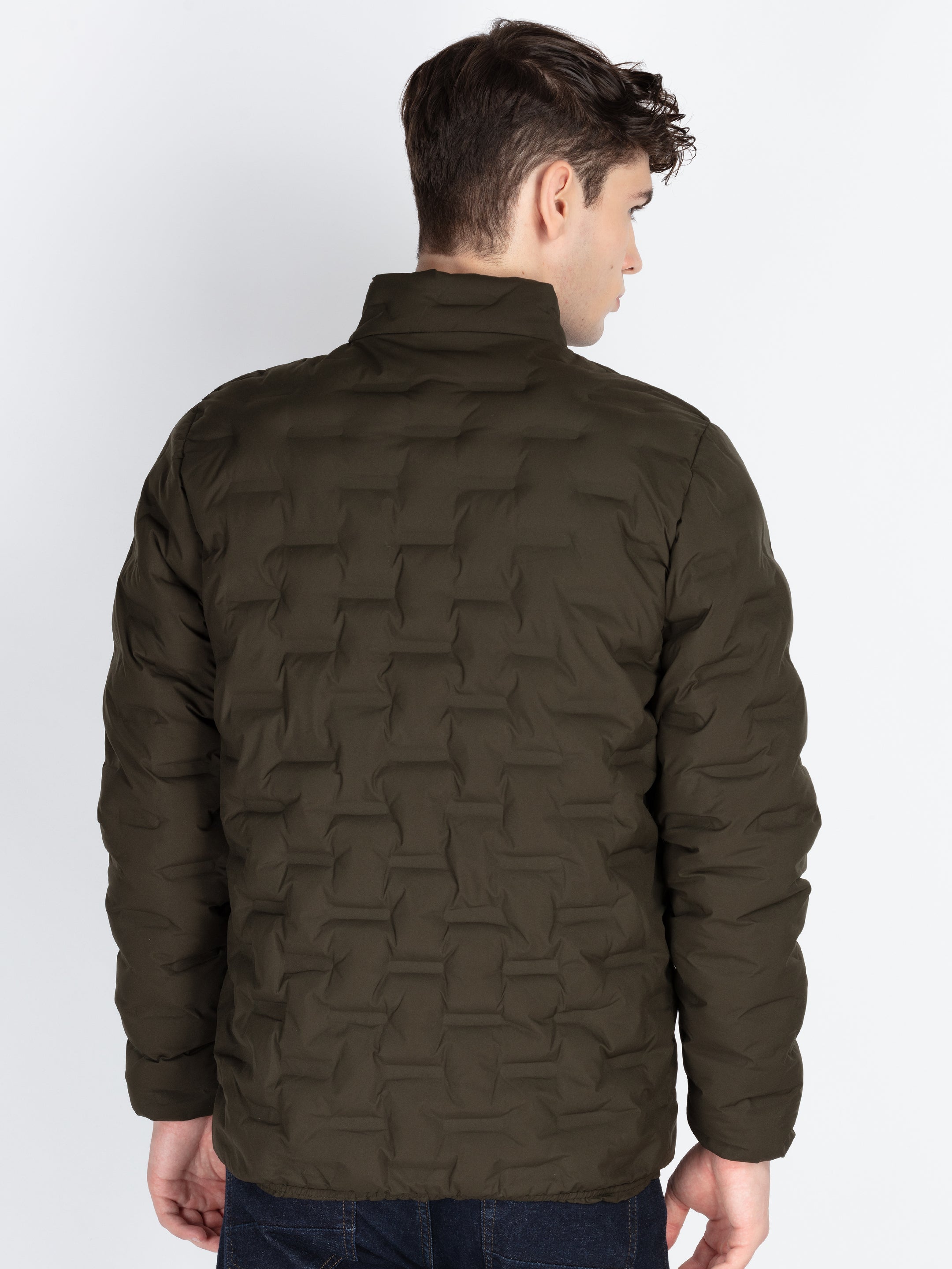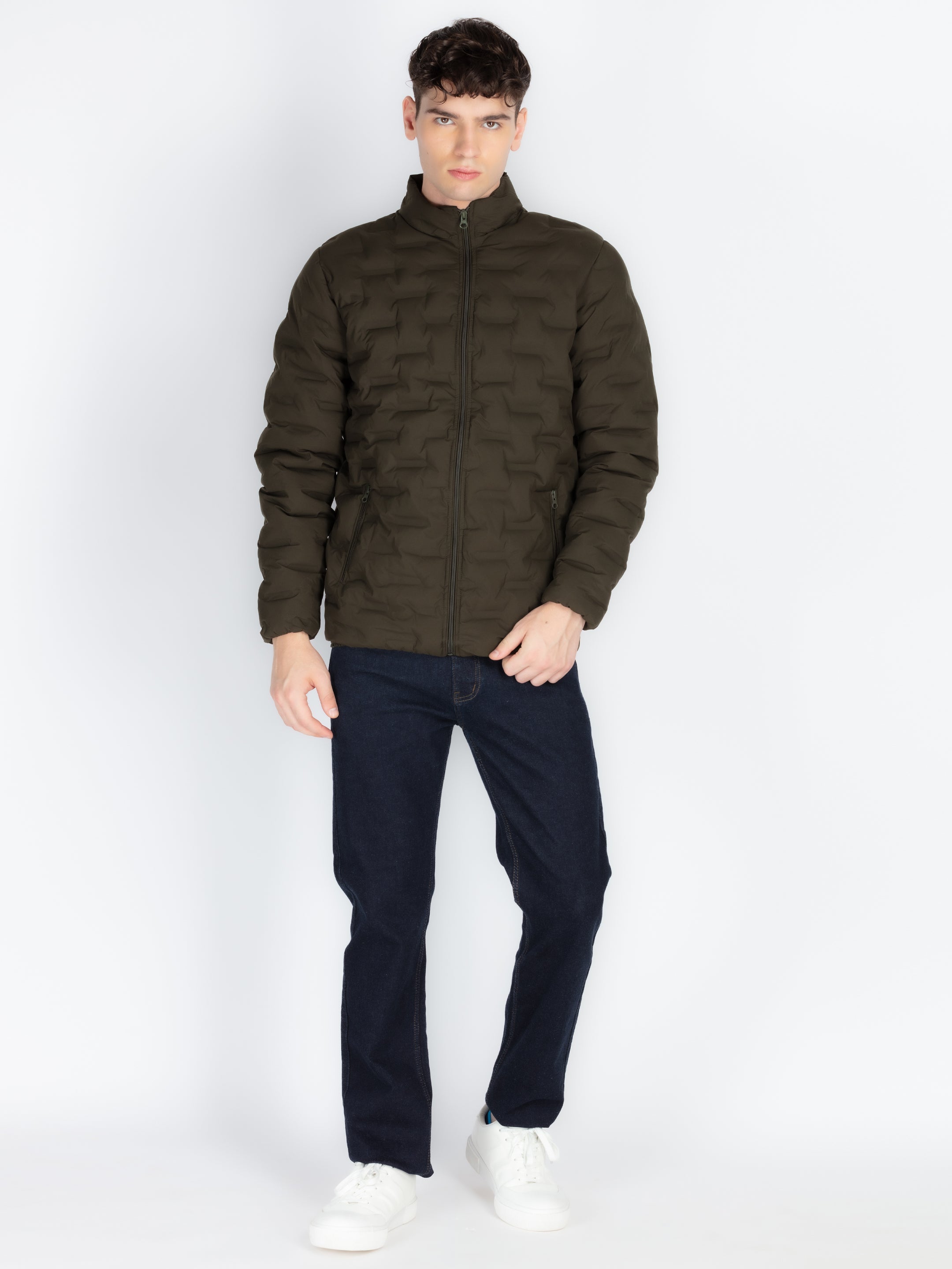 Olive Mens Self Design Quilted Jacket Has High Neck with Full Sleeves.
