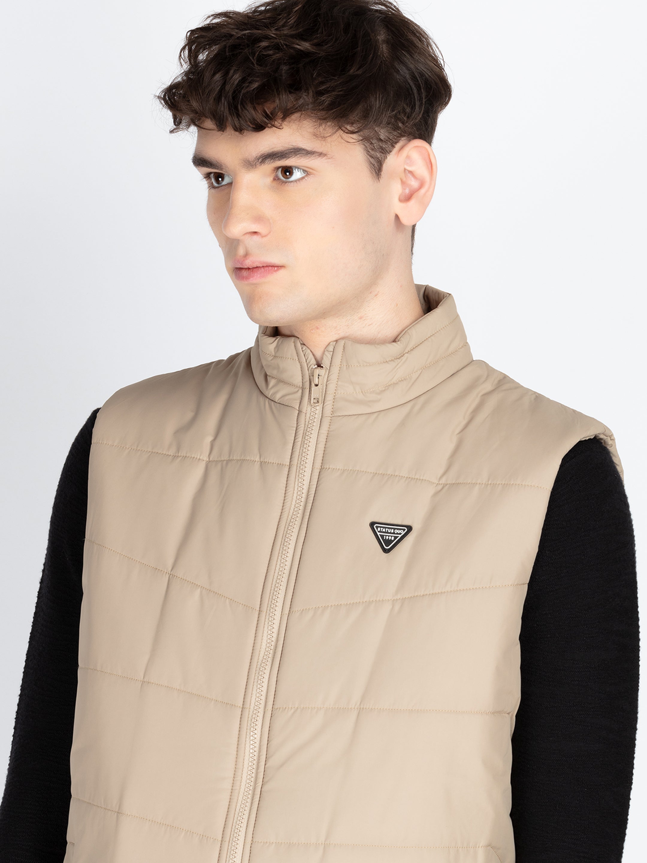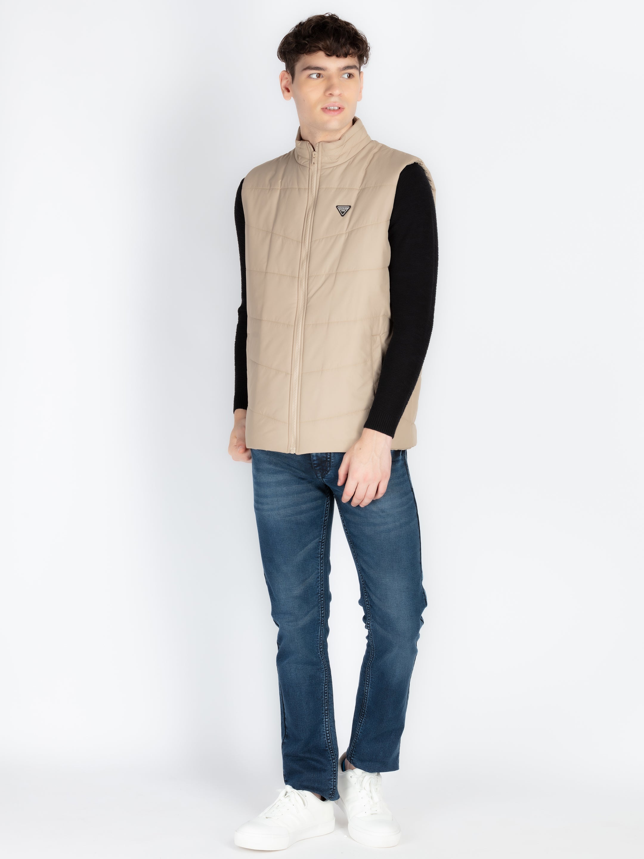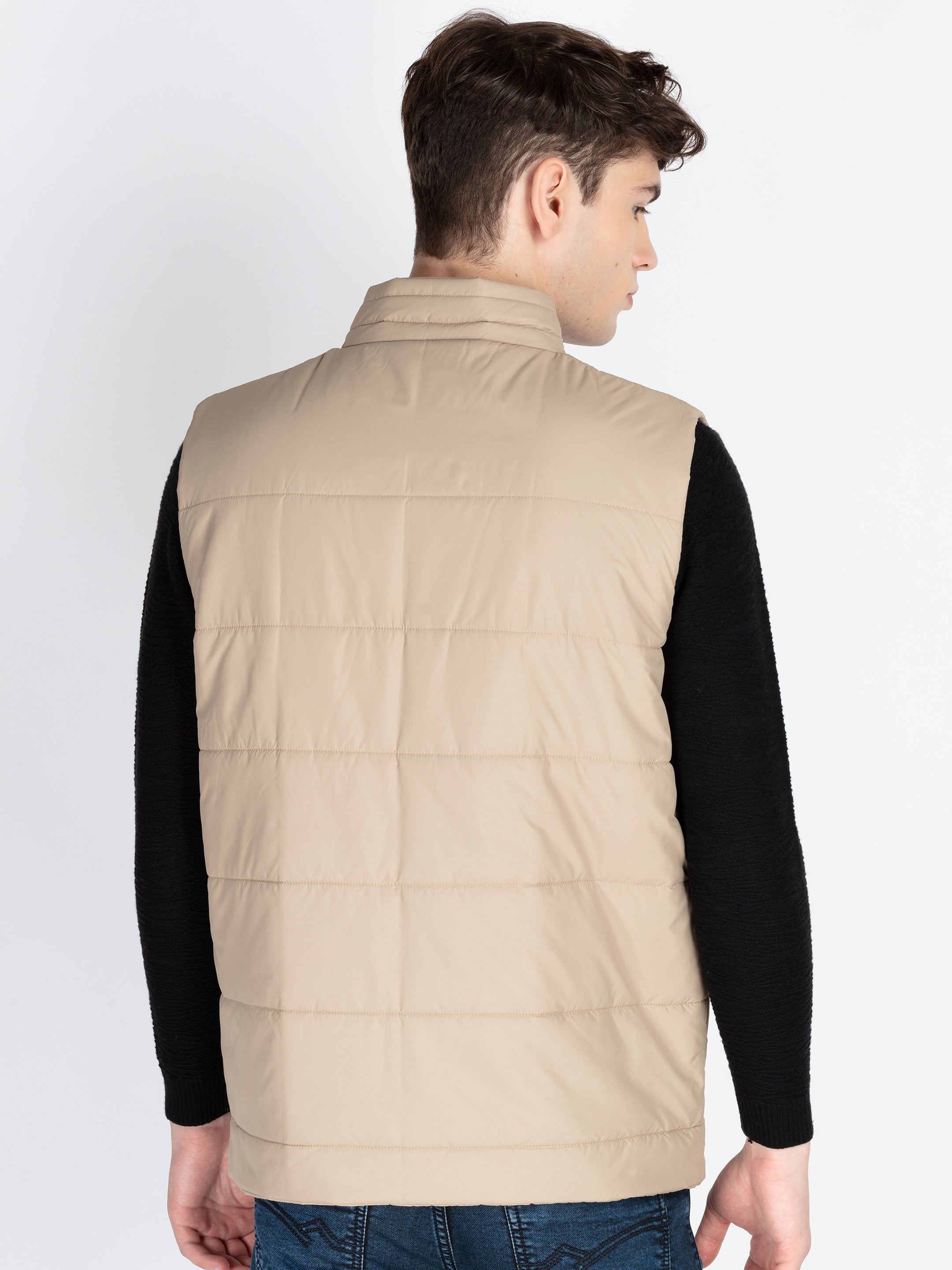 Khaki Mens Solid Open Front Jacket Has High Neck with Sleeveless.