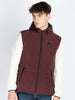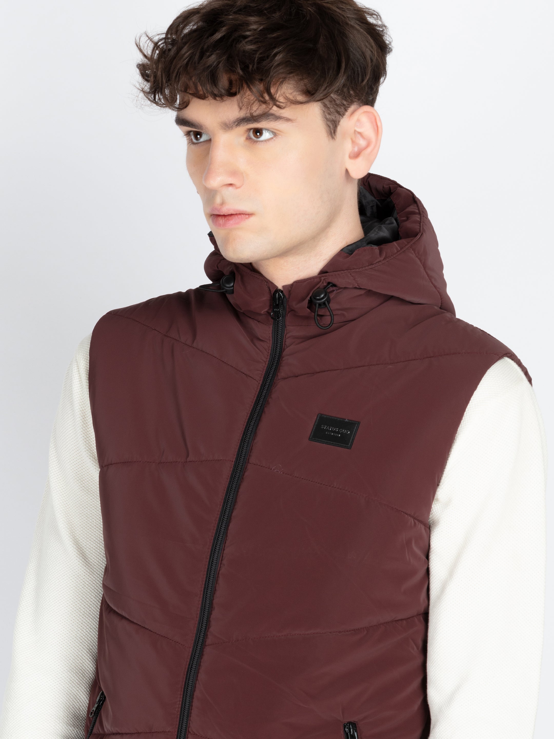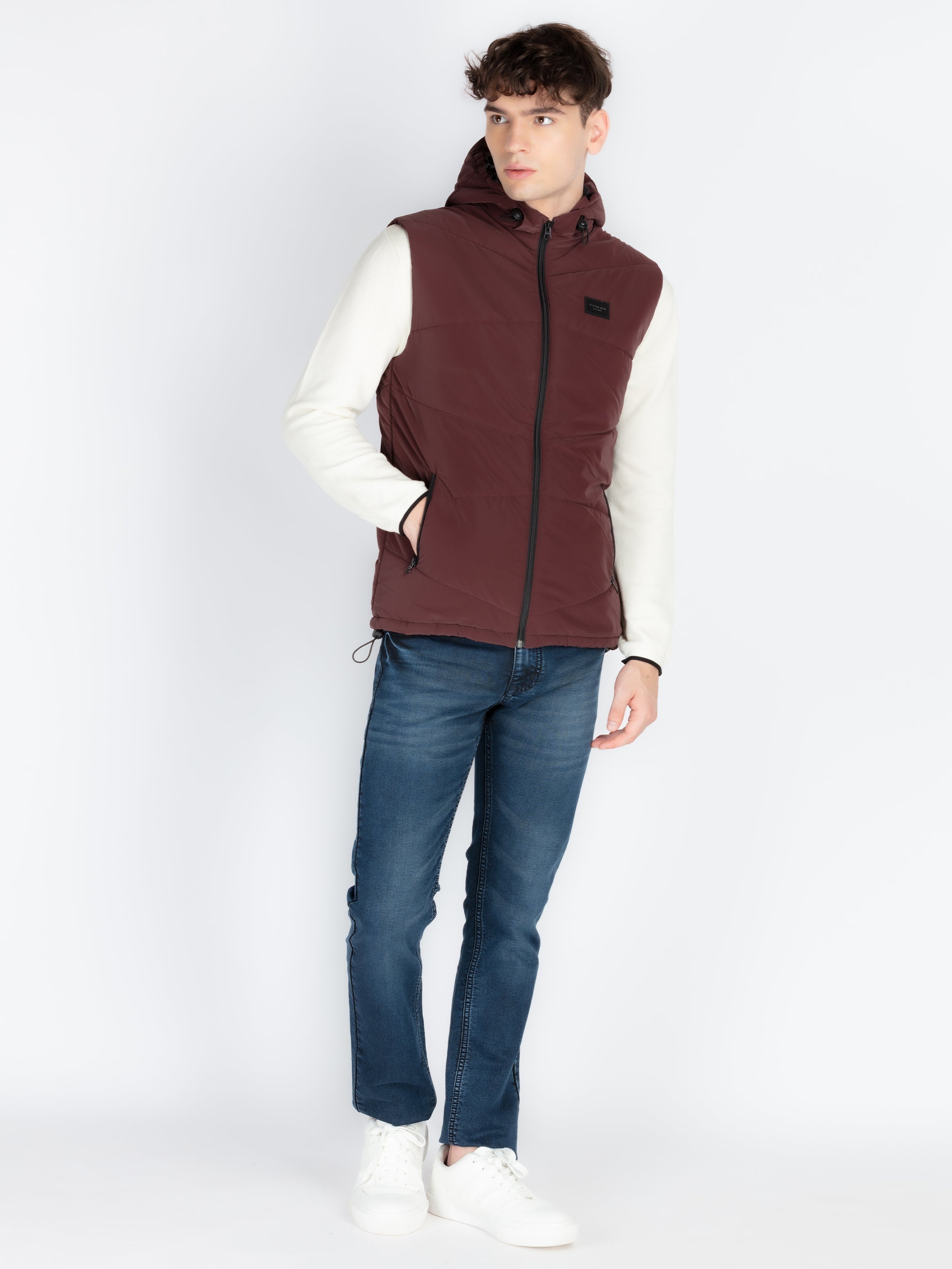 Wine Mens Solid Open Front Jacket Has Hooded Neck with Sleeveless.