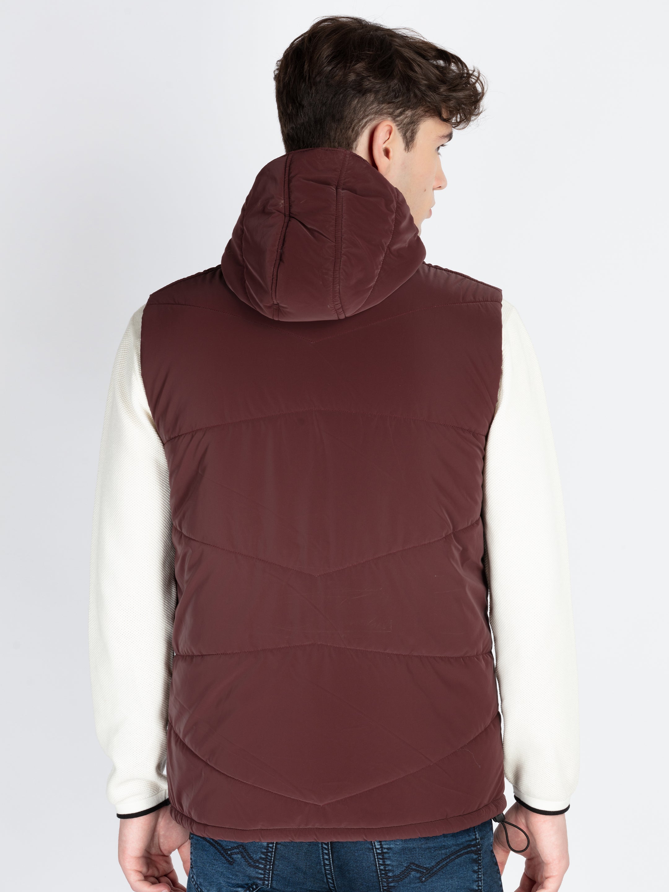Wine Mens Solid Open Front Jacket Has Hooded Neck with Sleeveless.