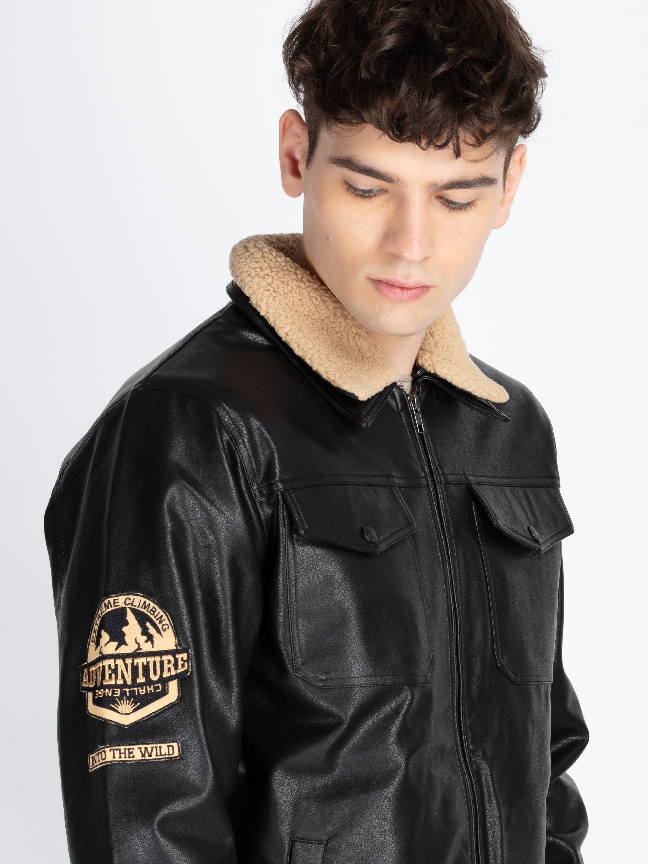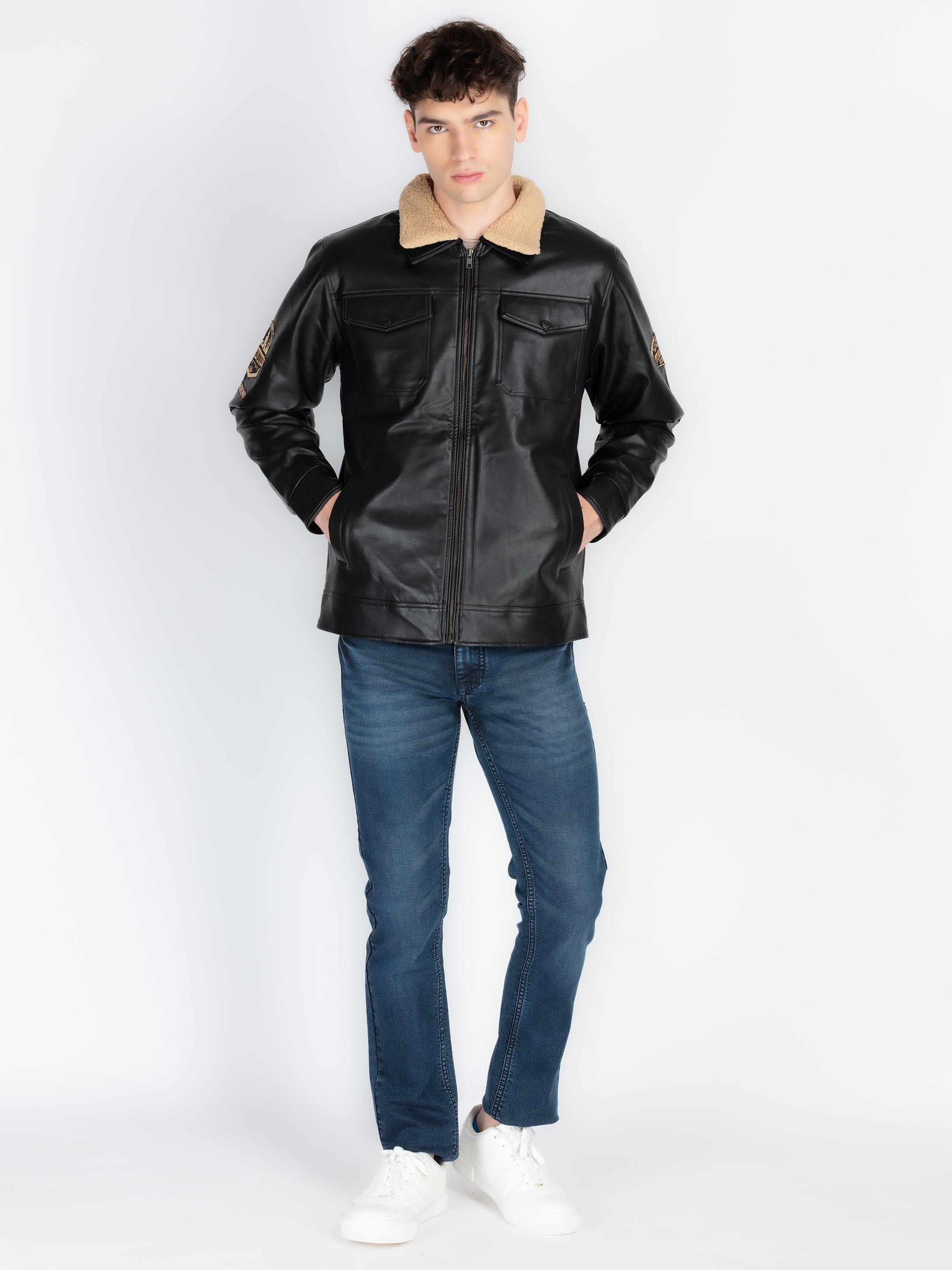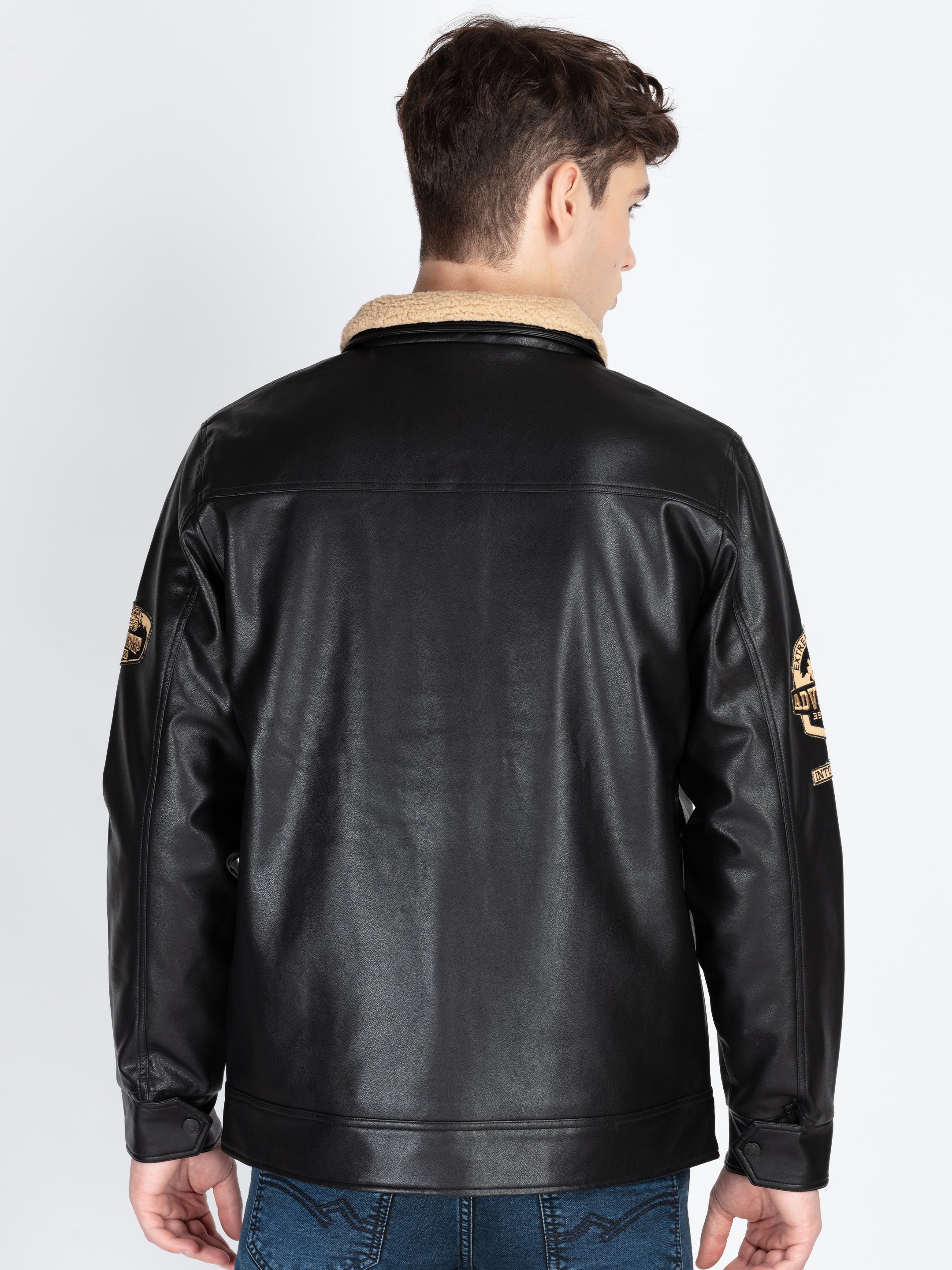 Black Mens Solid Open Front Jacket Has Spread Collar with Full Sleeves