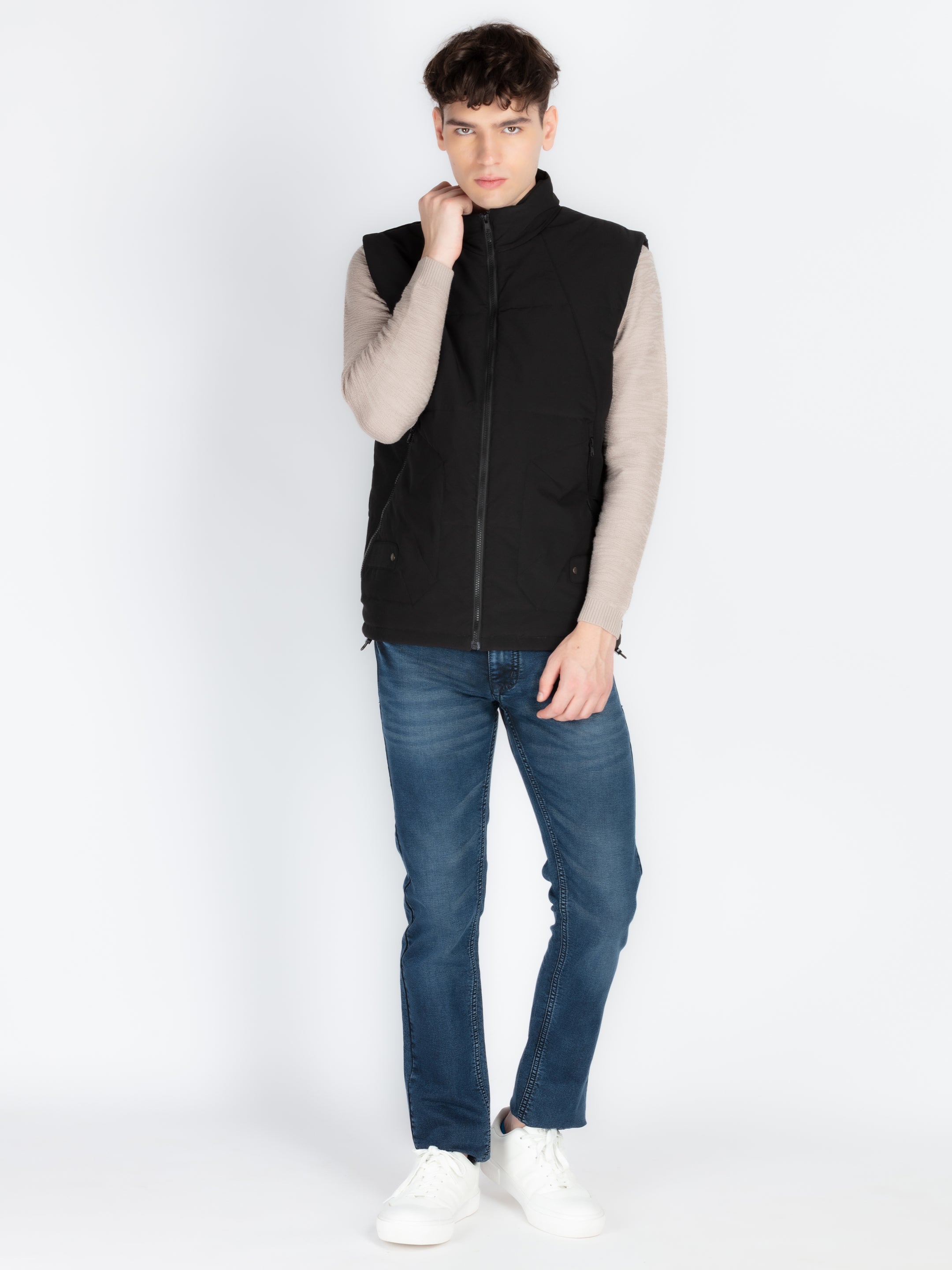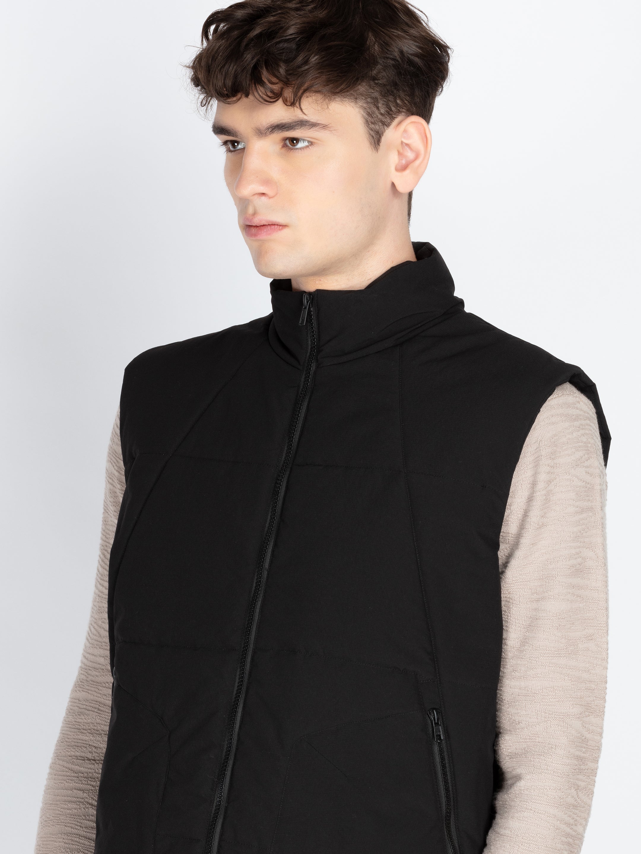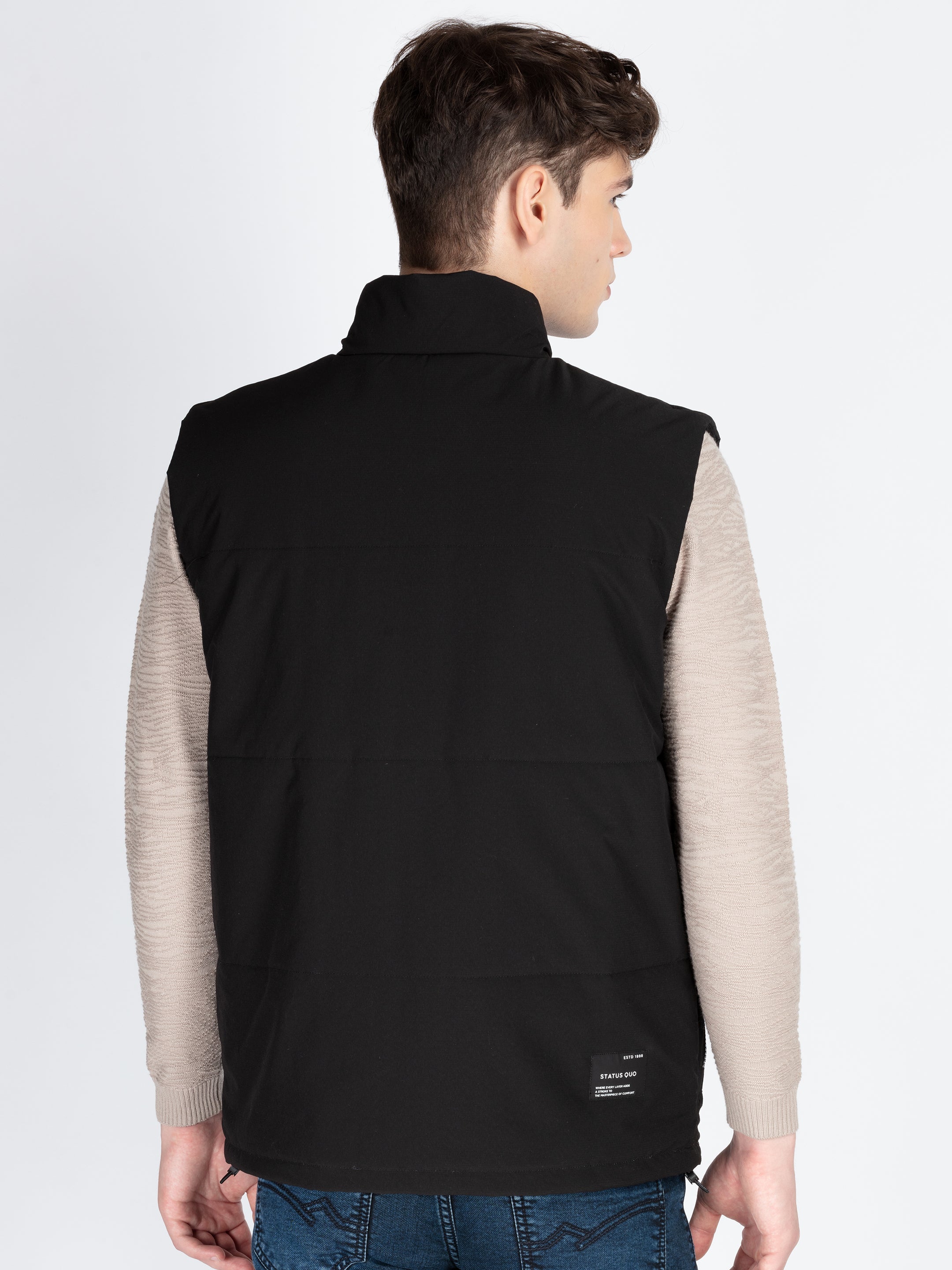 Black Mens Solid Open Front Jacket Has High Neck with Sleeveless.