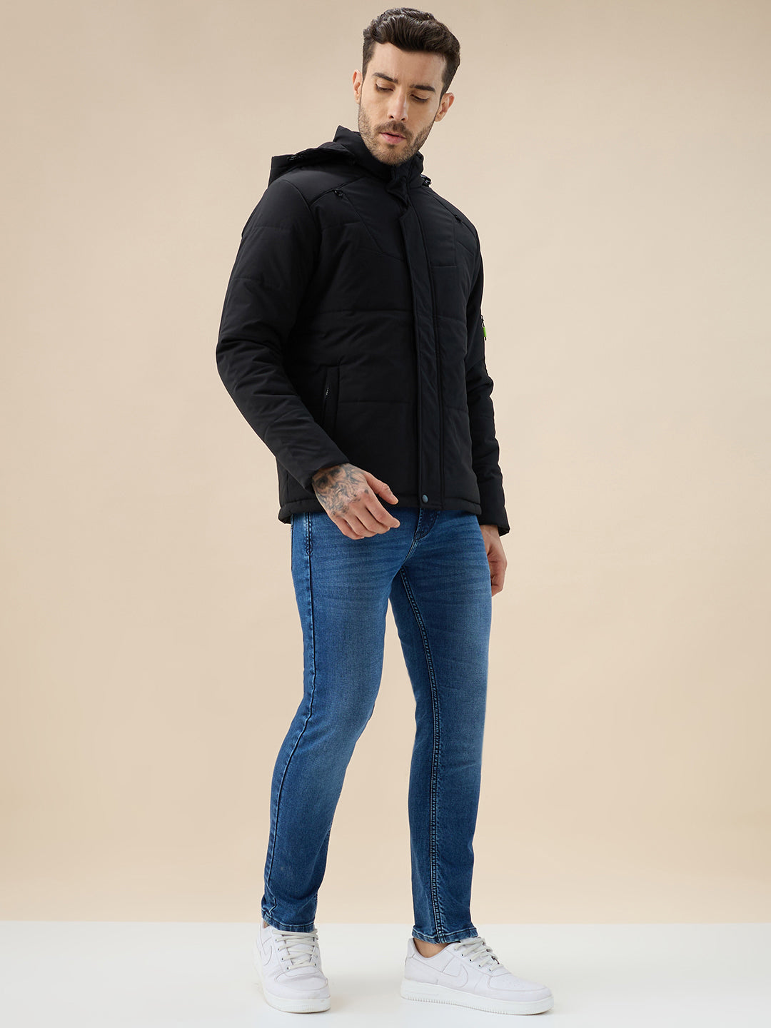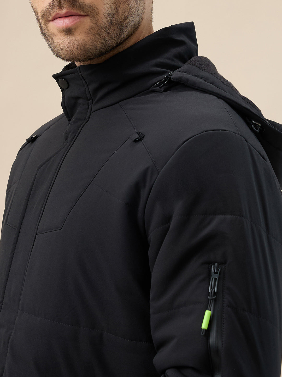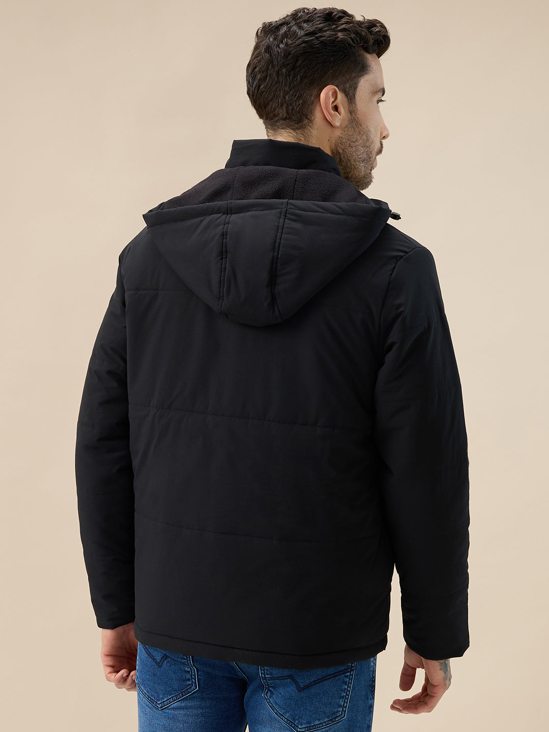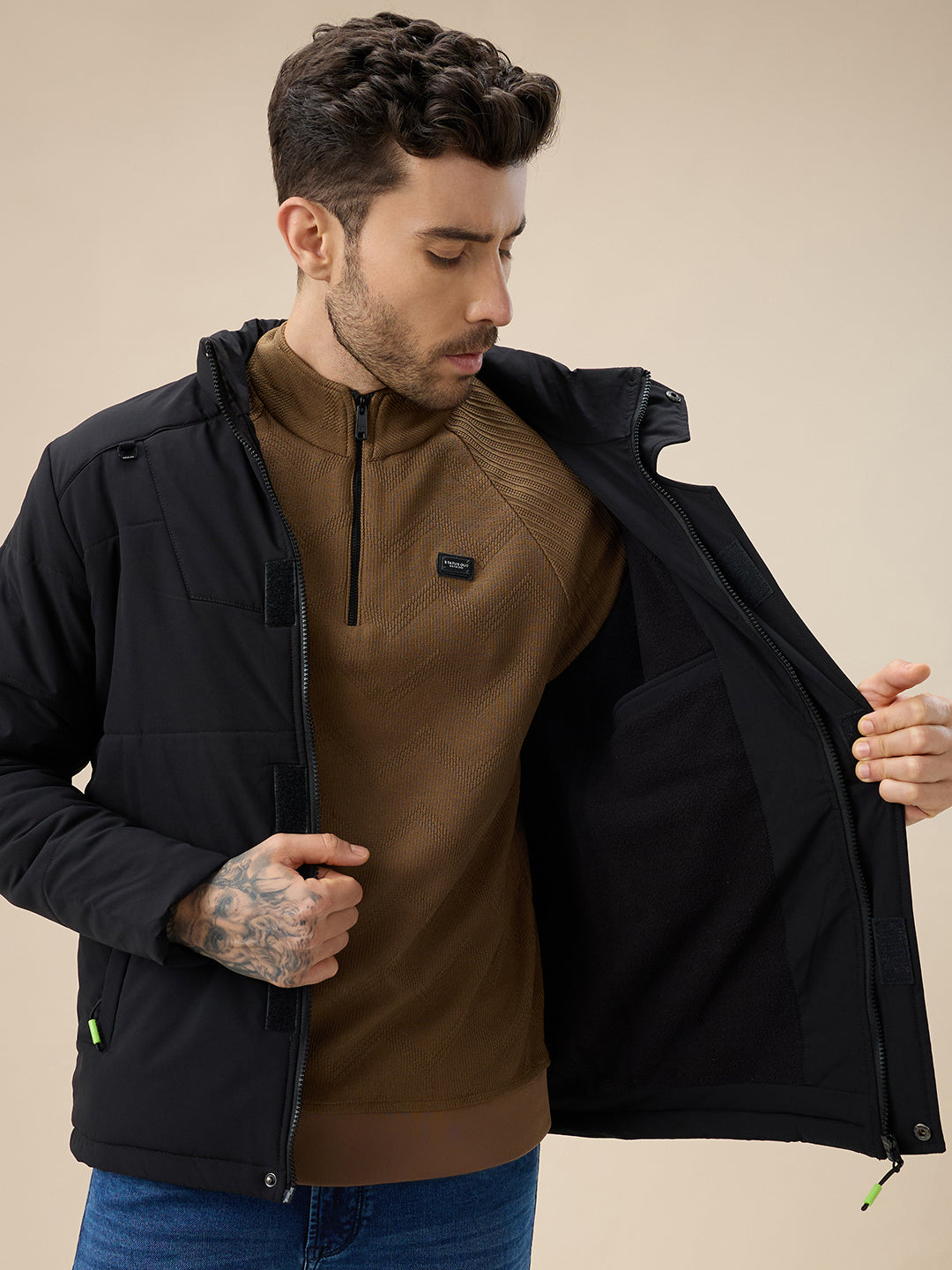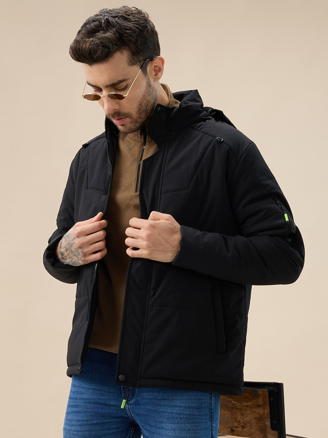 BLACK Status Quo Men's Solid Detachable Hood High Neck Full Sleeves Quilted Jacket
