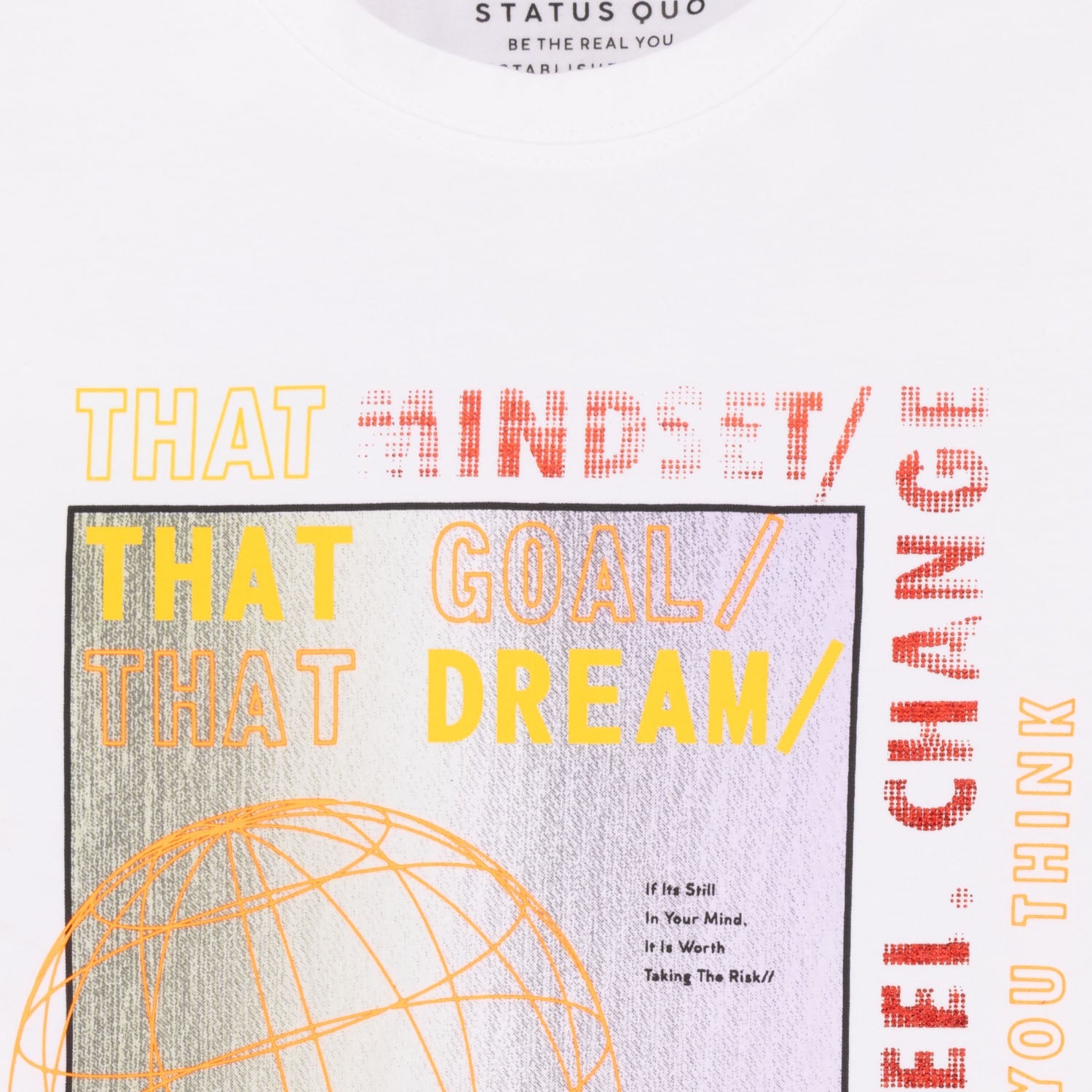 WHITE Printed T-shirt has Round Neck, HALF SLEEVE