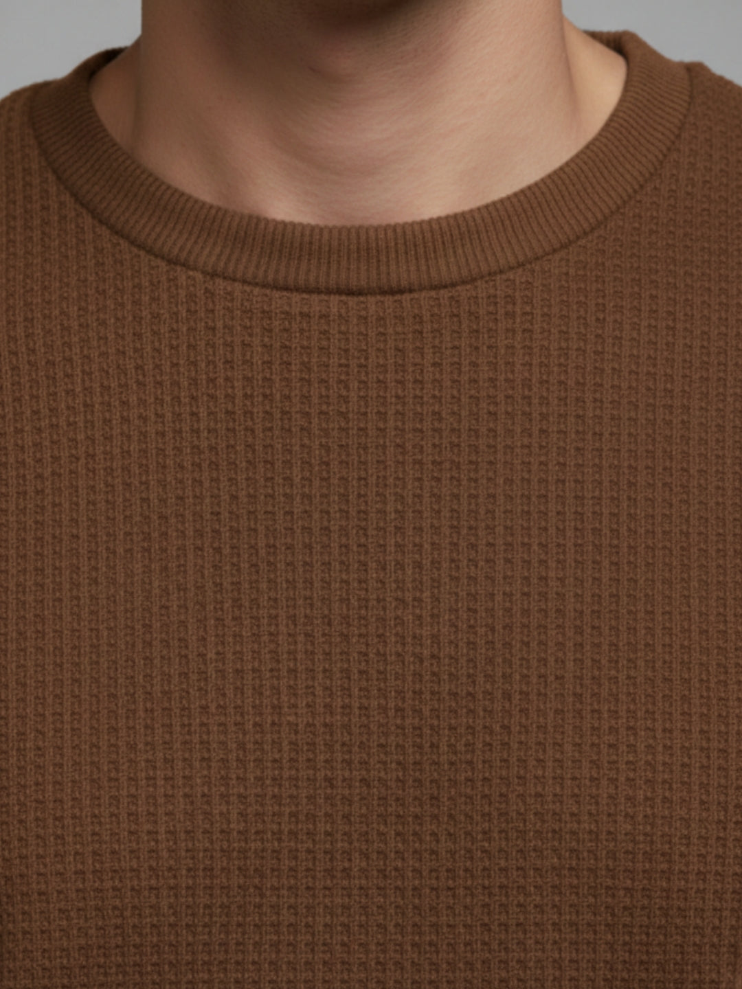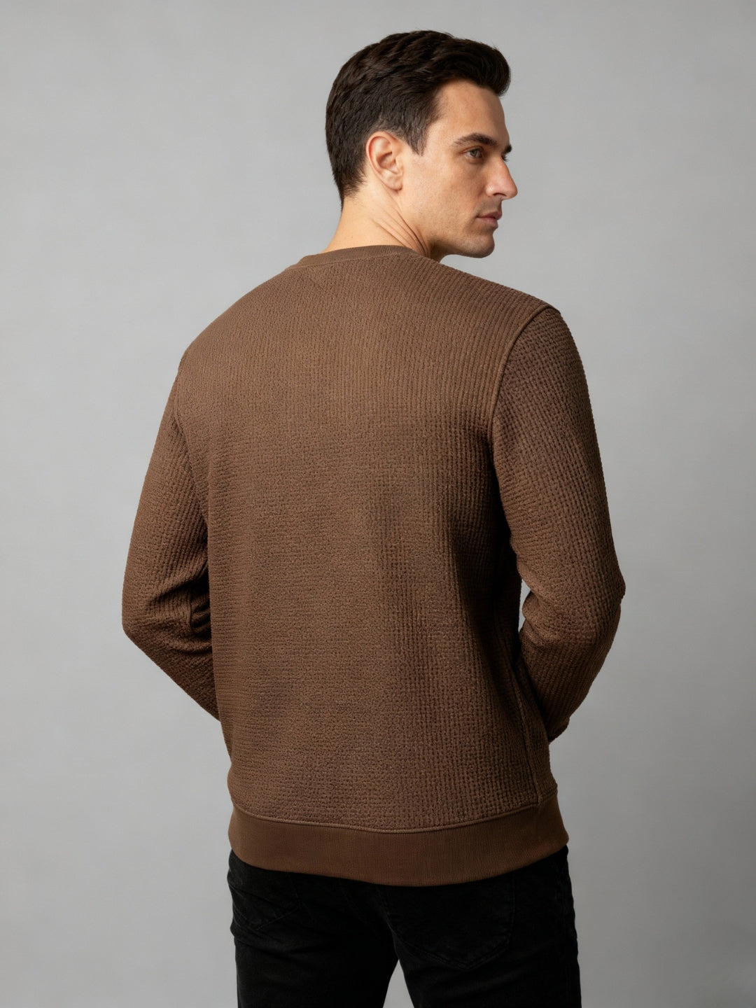 BROWN Men's Solid Textured Round Neck Full Sleeves Sweatshirt