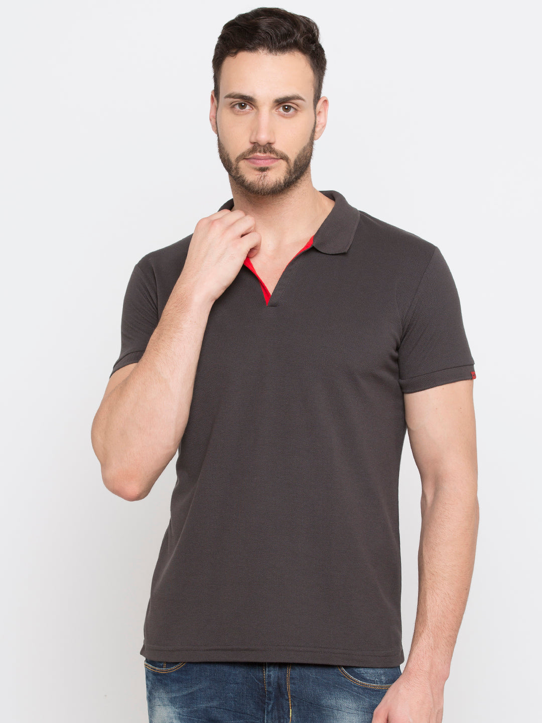 Charcoal Grey solid T-shirt, has a polo collar, short sleeves.