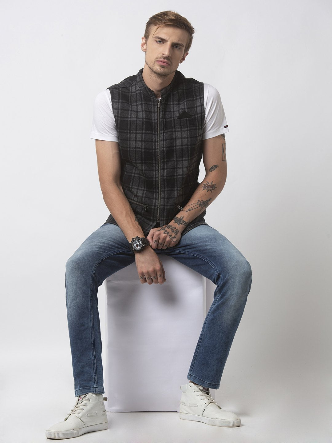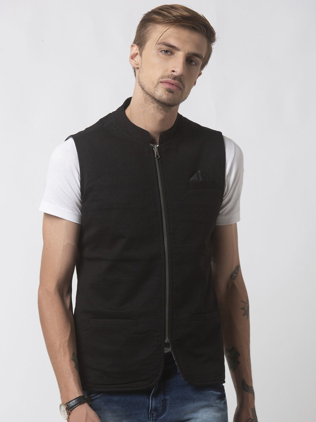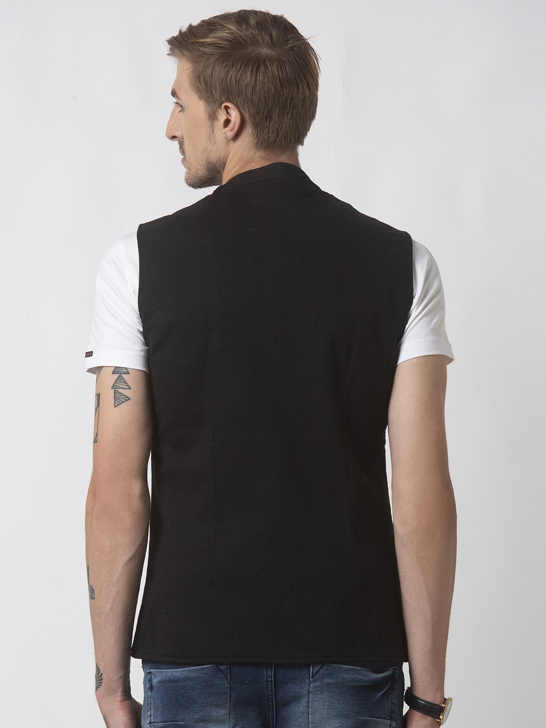 Black Reversabl waistcoat has a mandarin collar, sleevless.