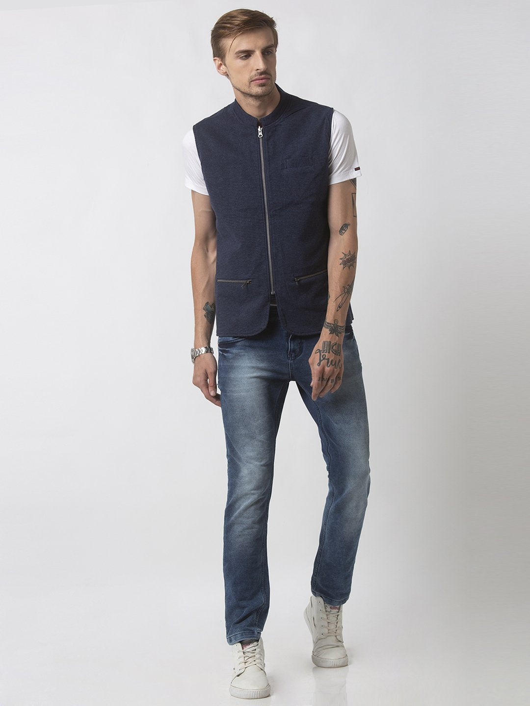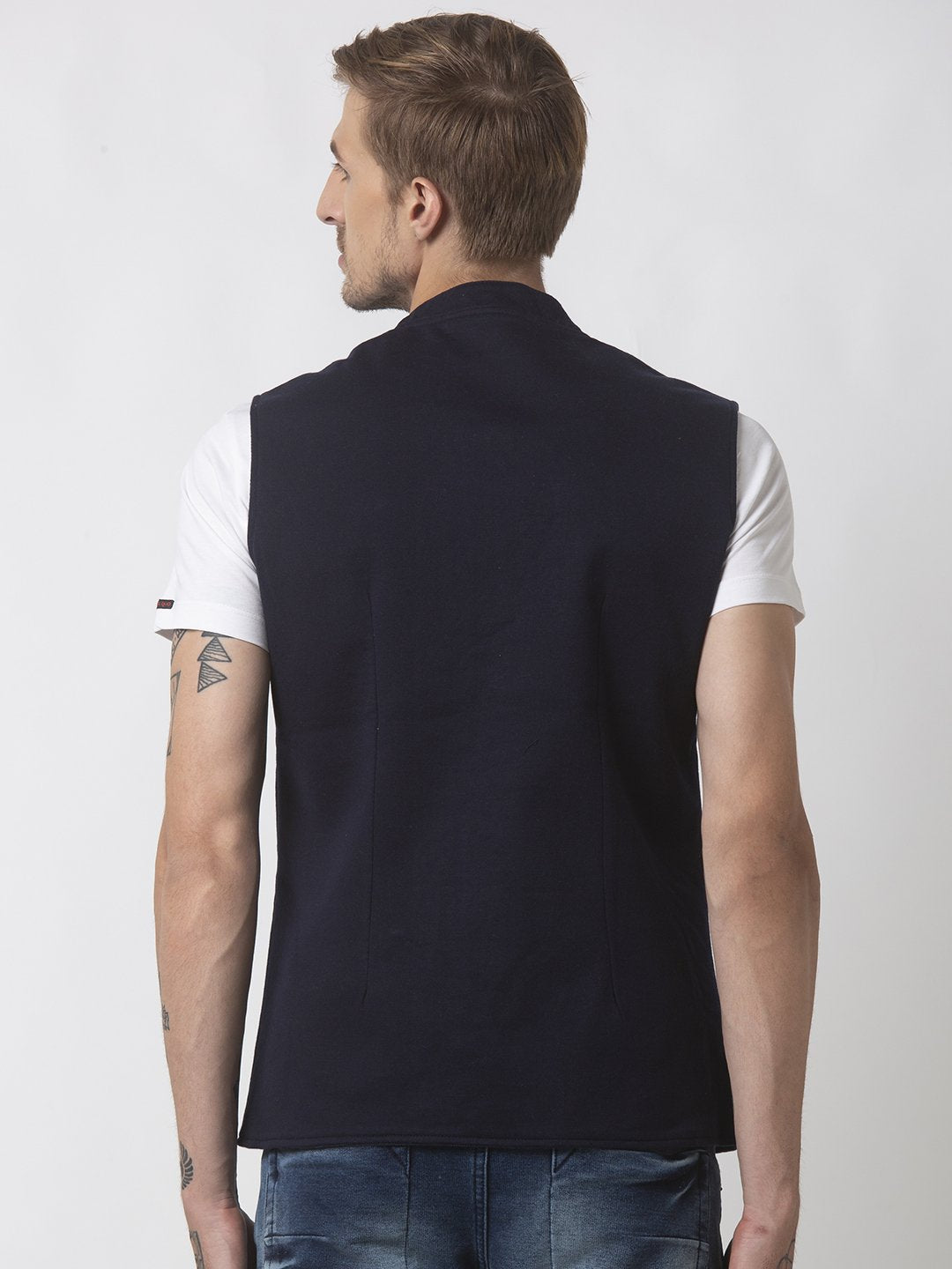 Navy Reversabl waistcoat has a mandarin collar, sleevless.