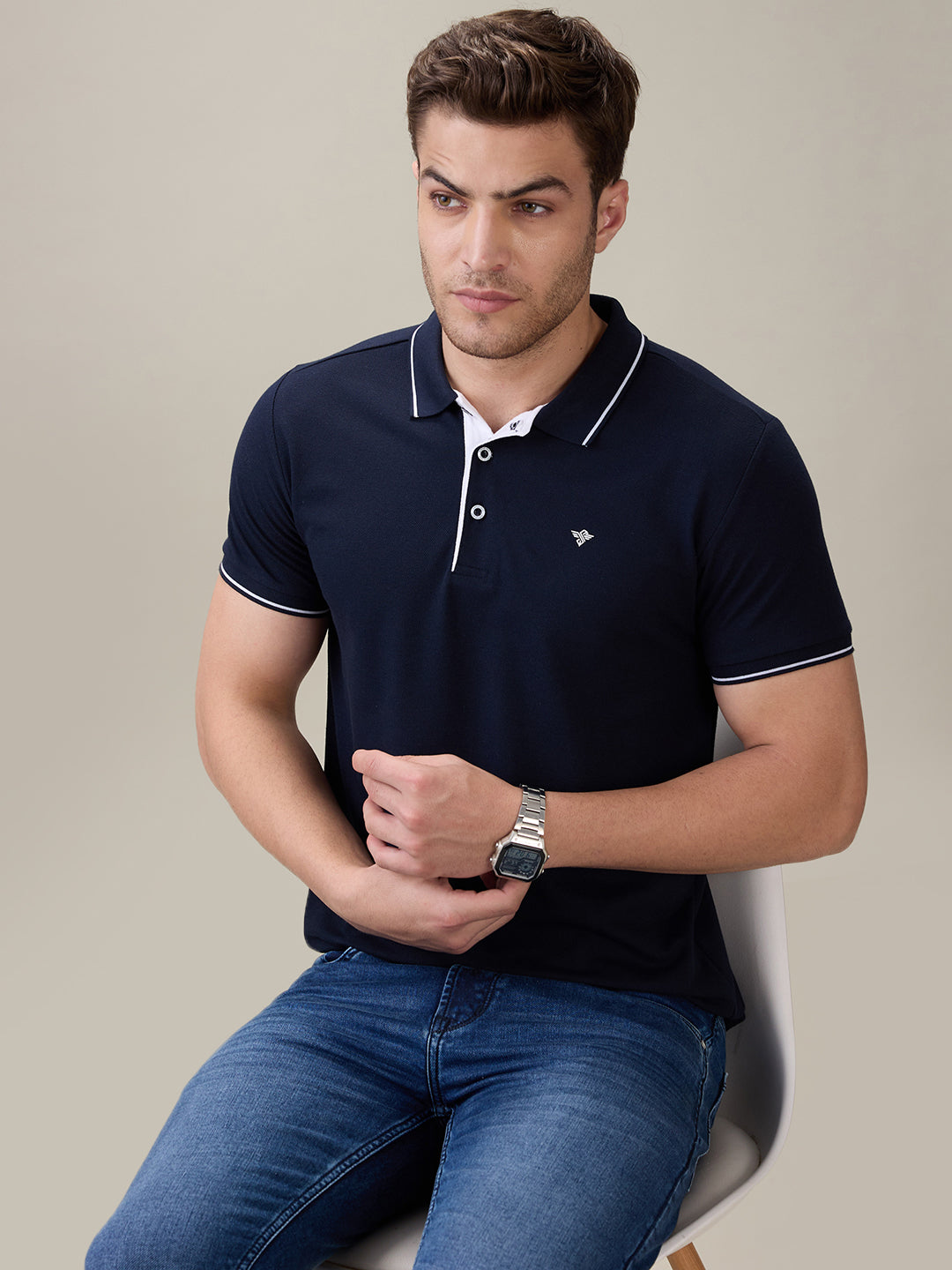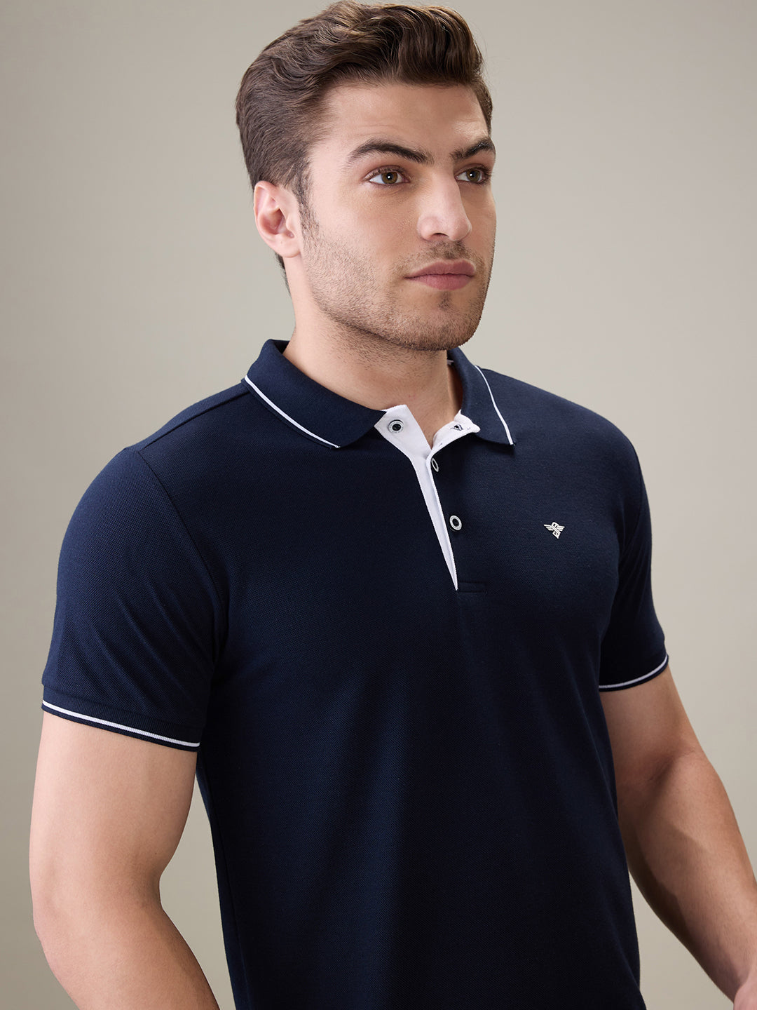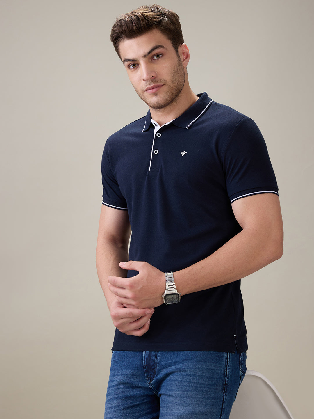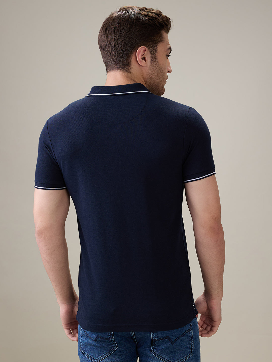 NAVY Men's Solid Regular Fit Polo T-Shirt with Tipped Collar and Button Closure