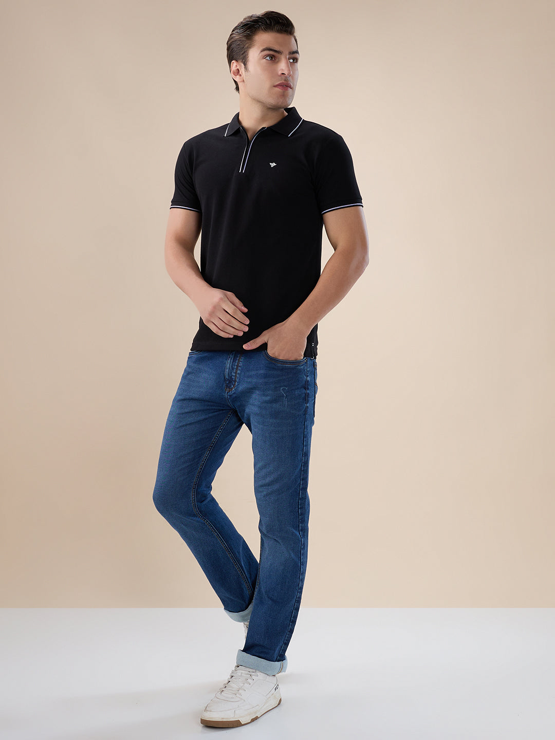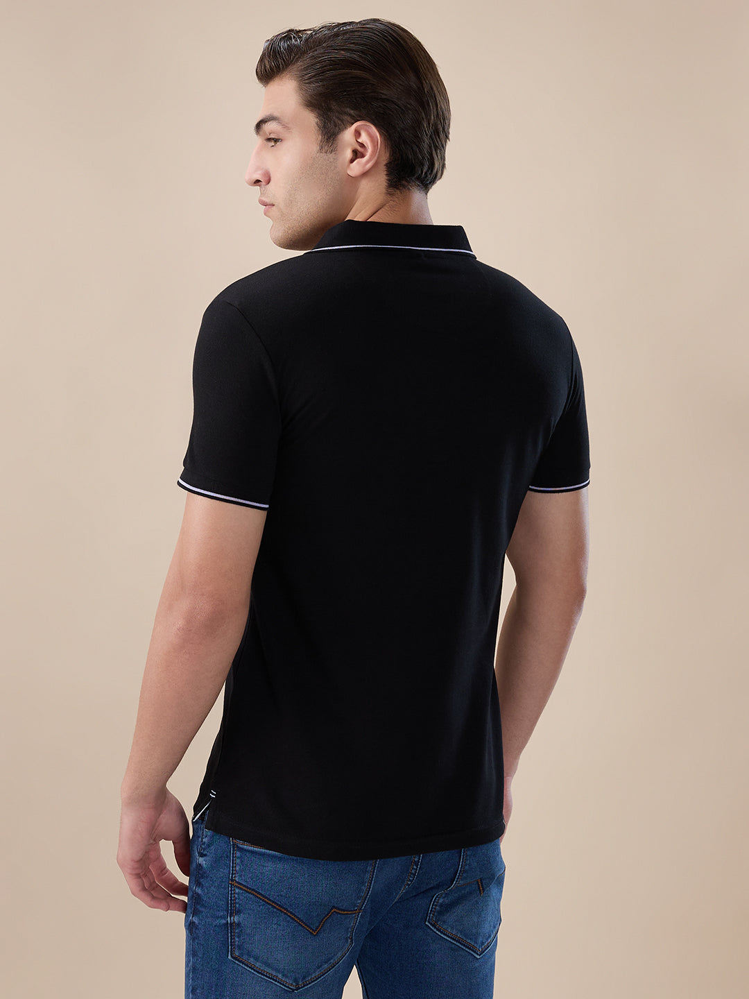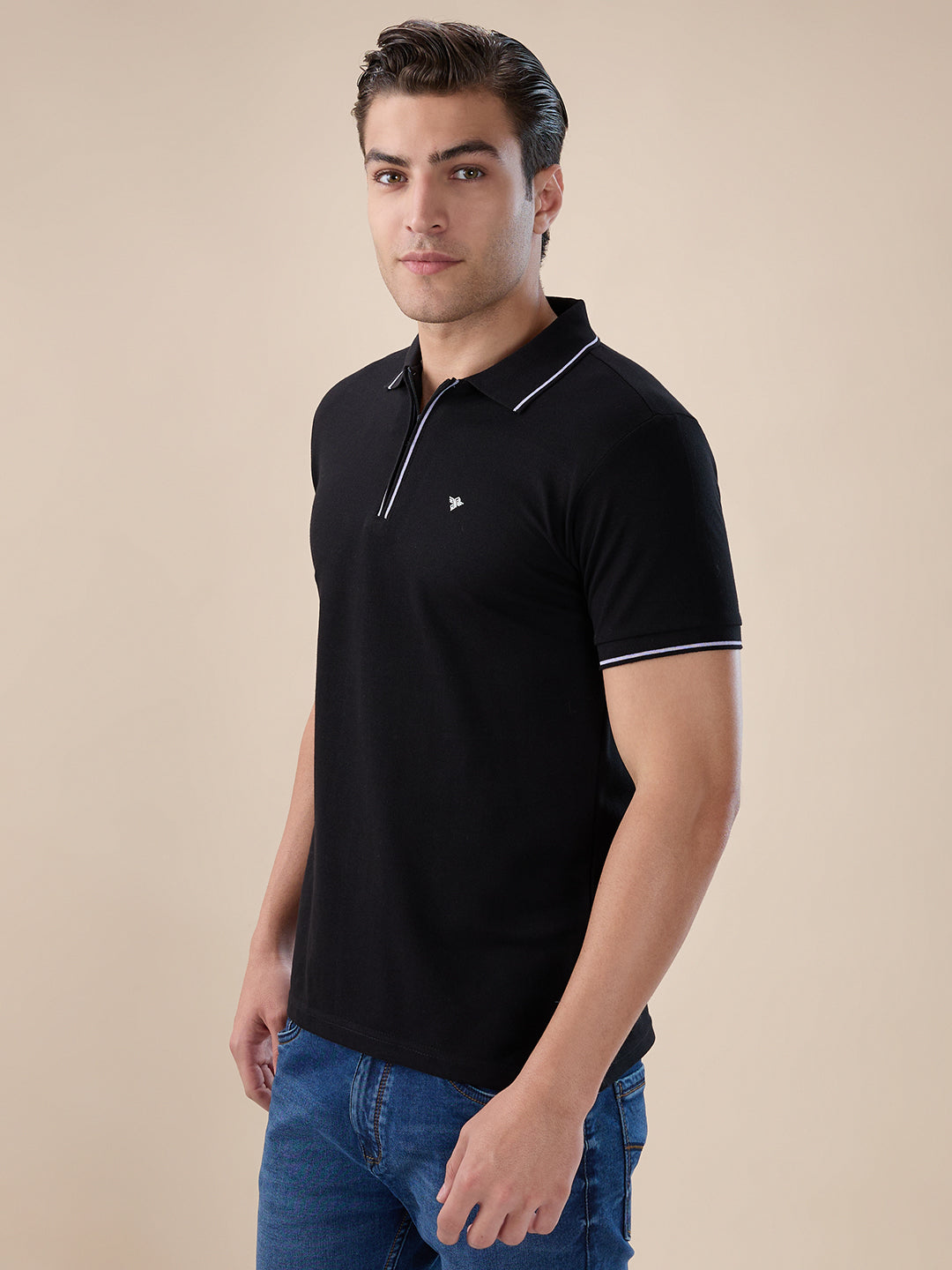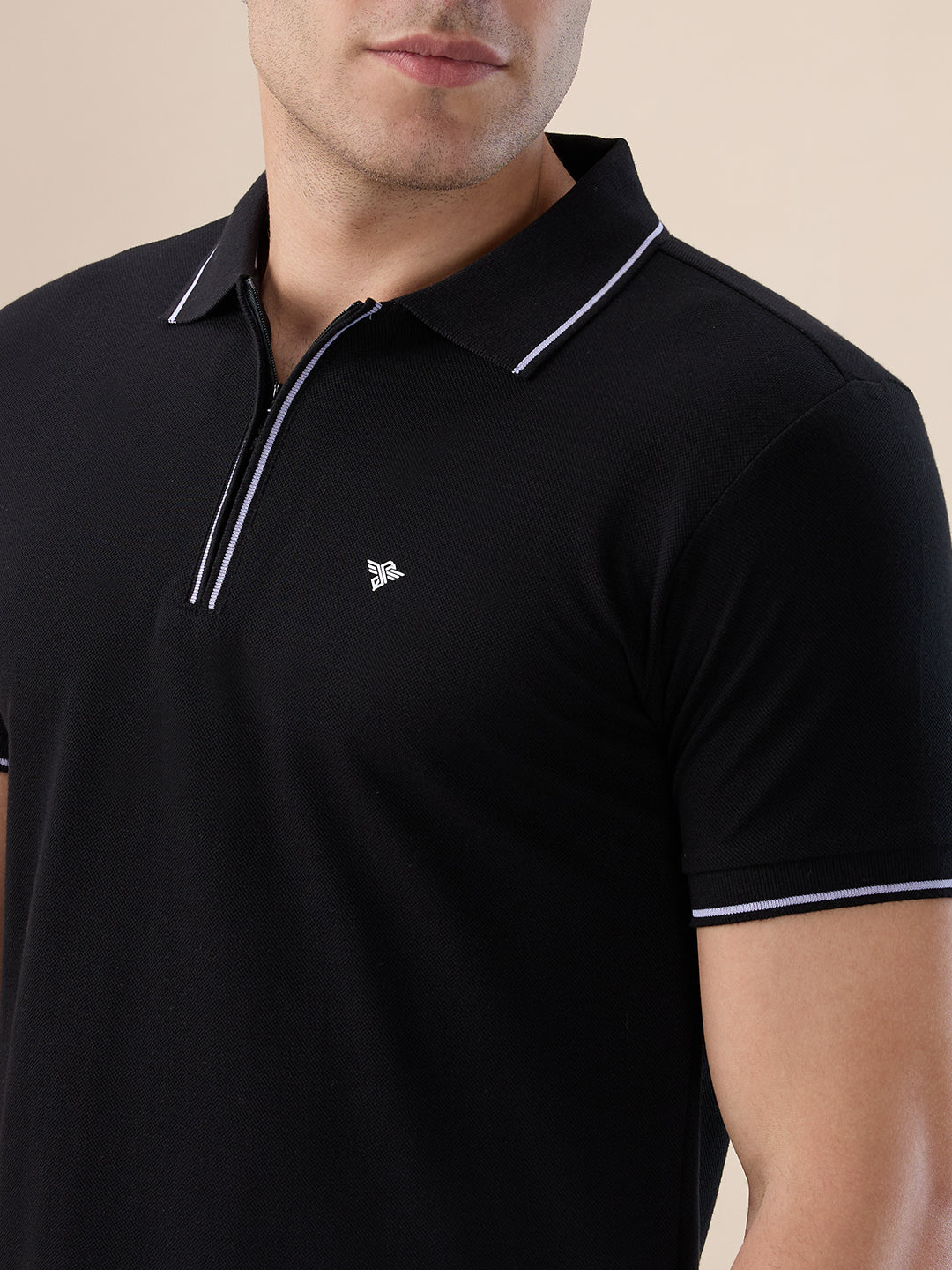 BLACK Men's Solid Regular Fit Zipper Polo T-shirt with Tipped Details