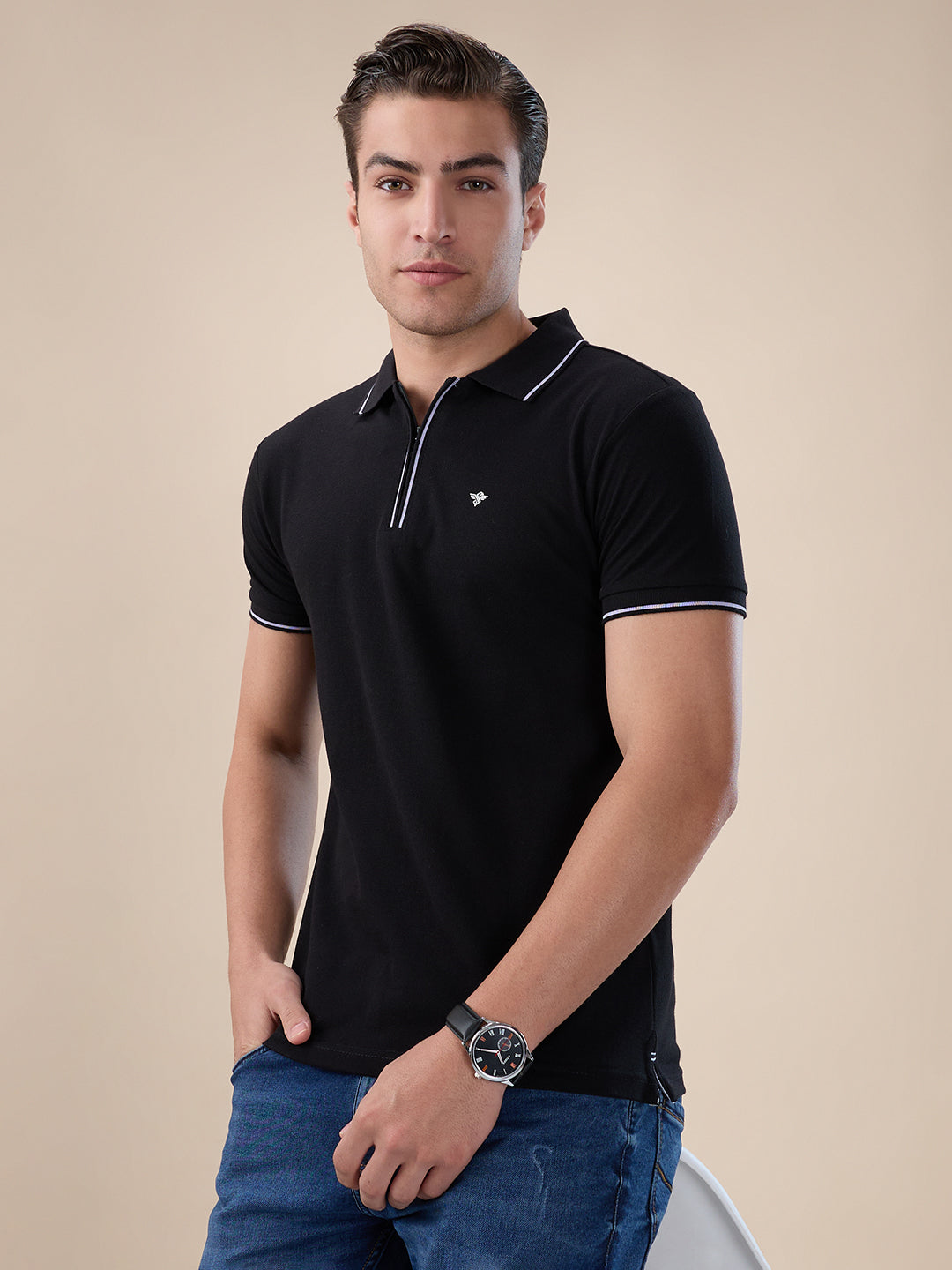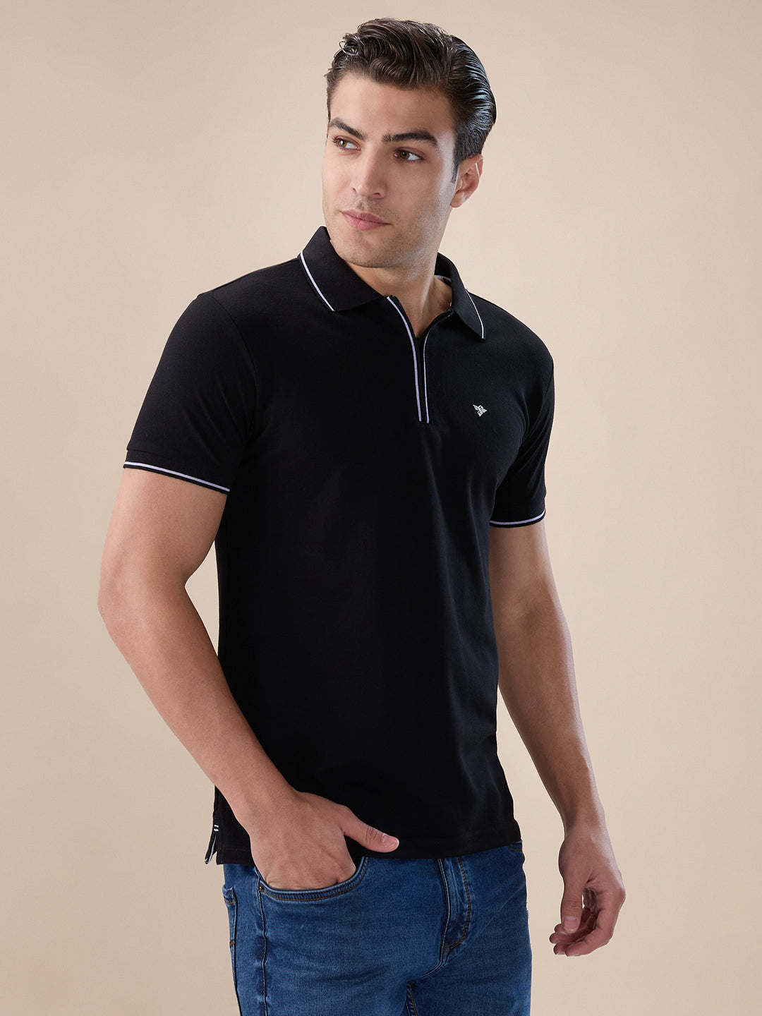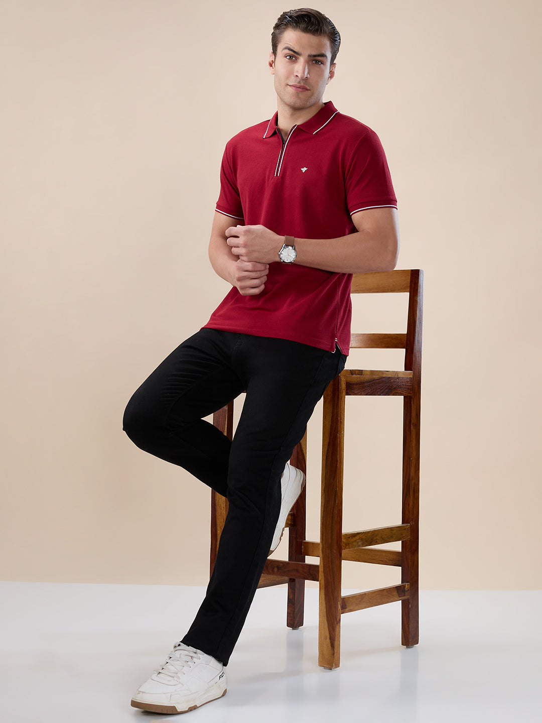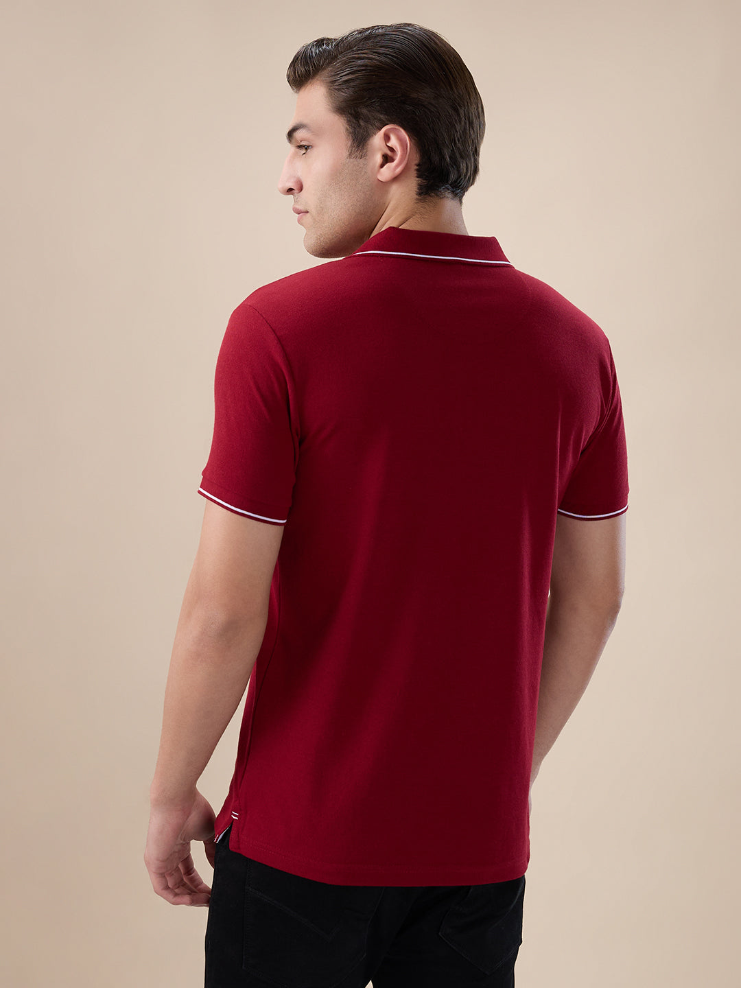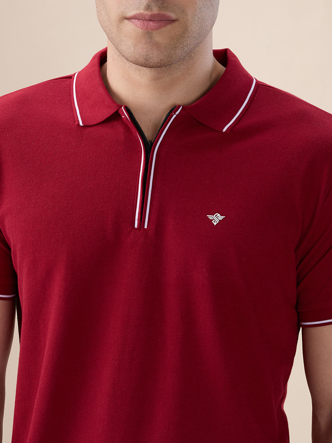 RUBY WINE Men's Solid Regular Fit Zipper Polo T-shirt with Tipped Details