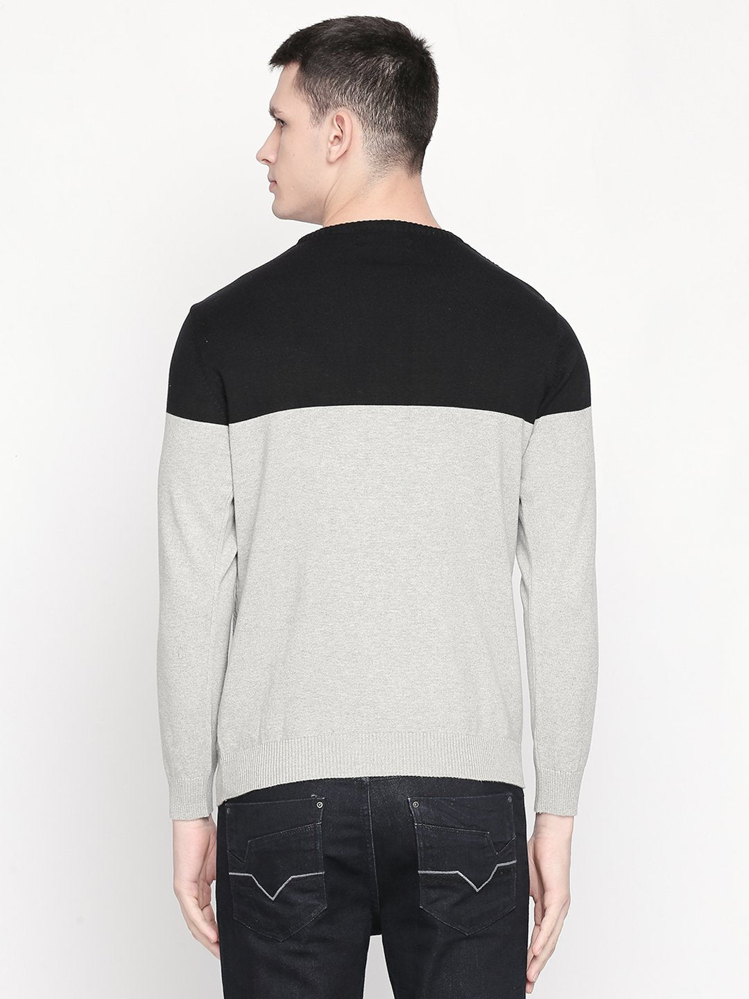 Black and Grey pullover sweater, has a round neck, long sleeves.