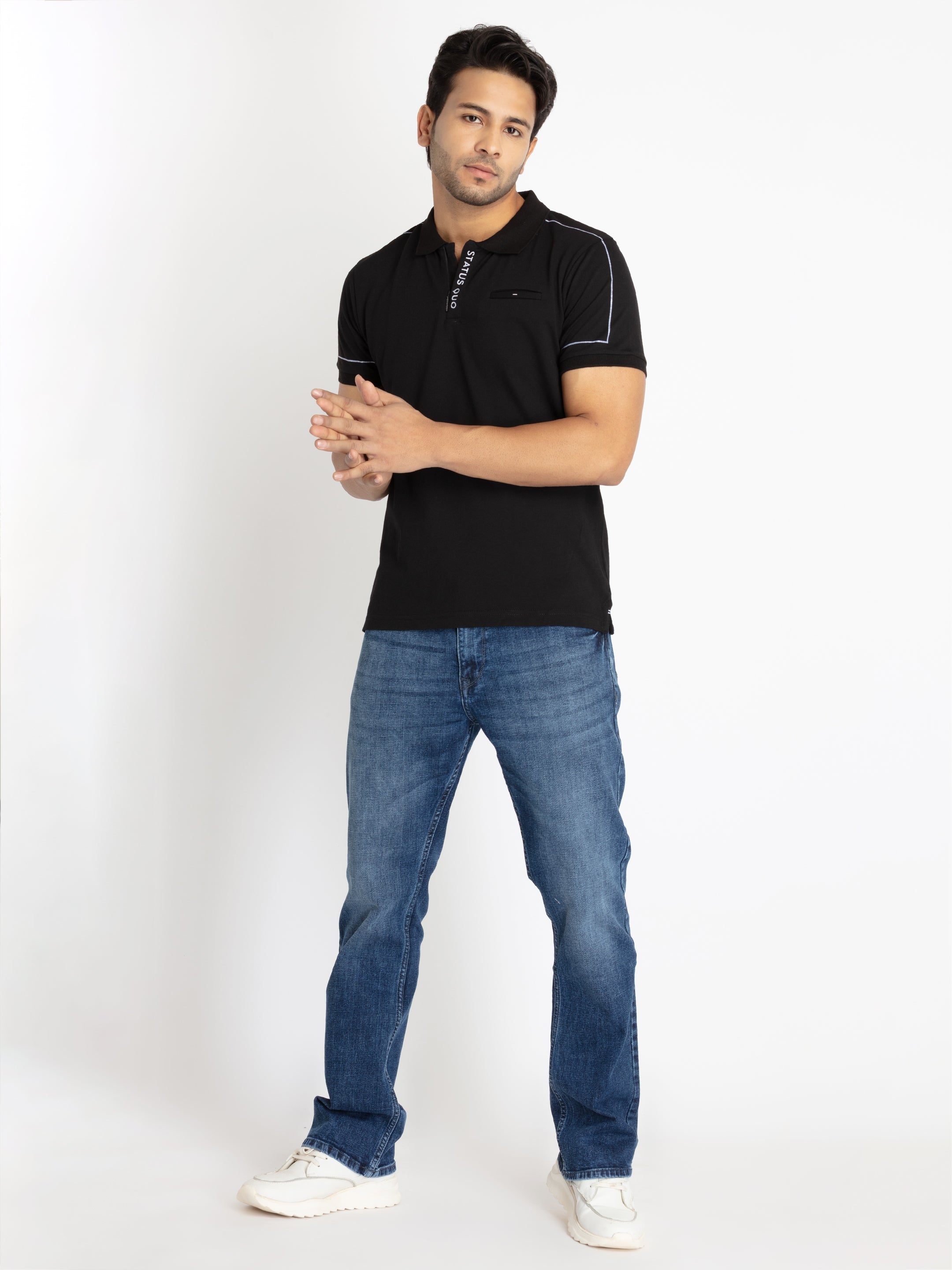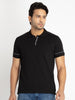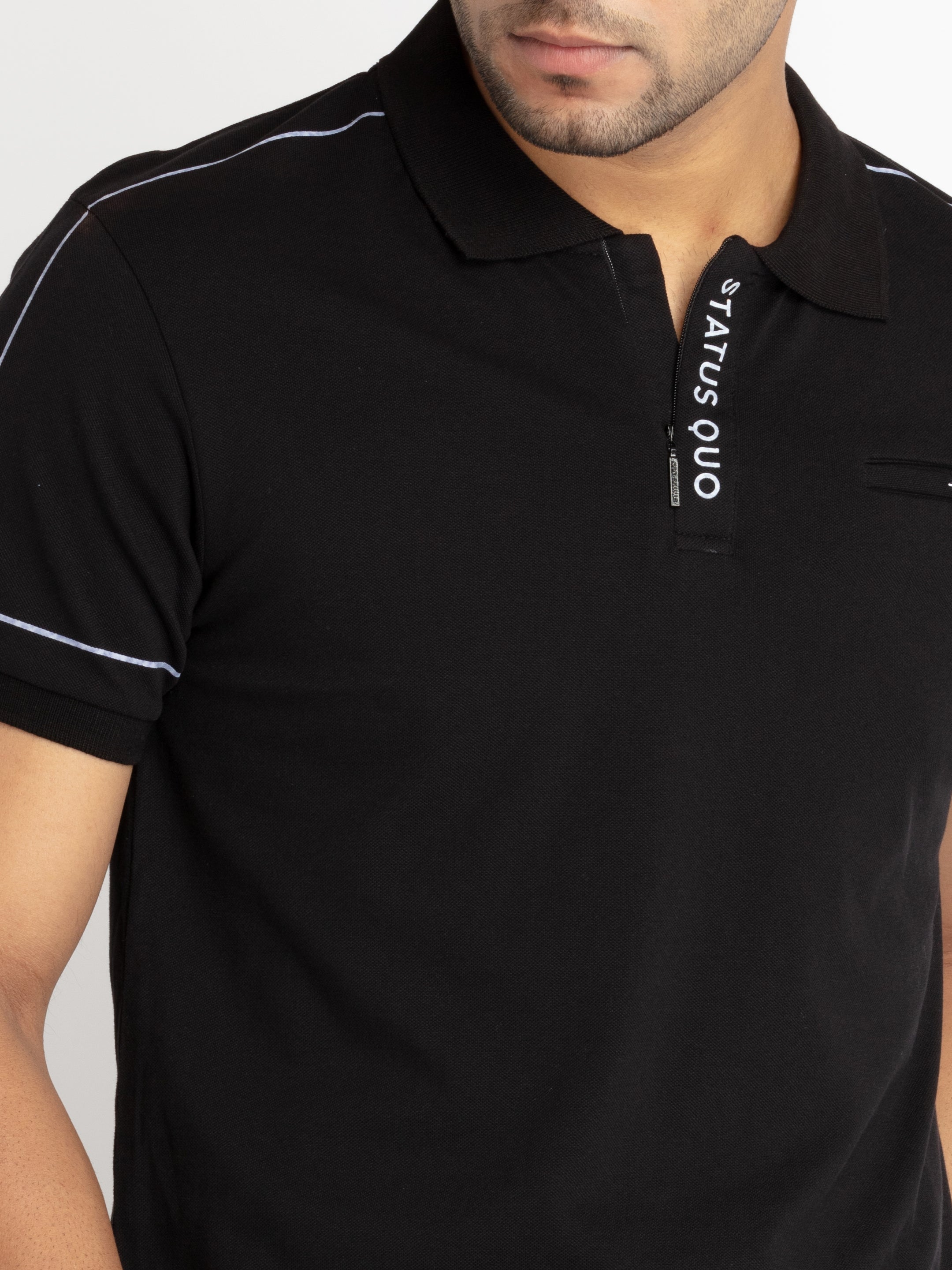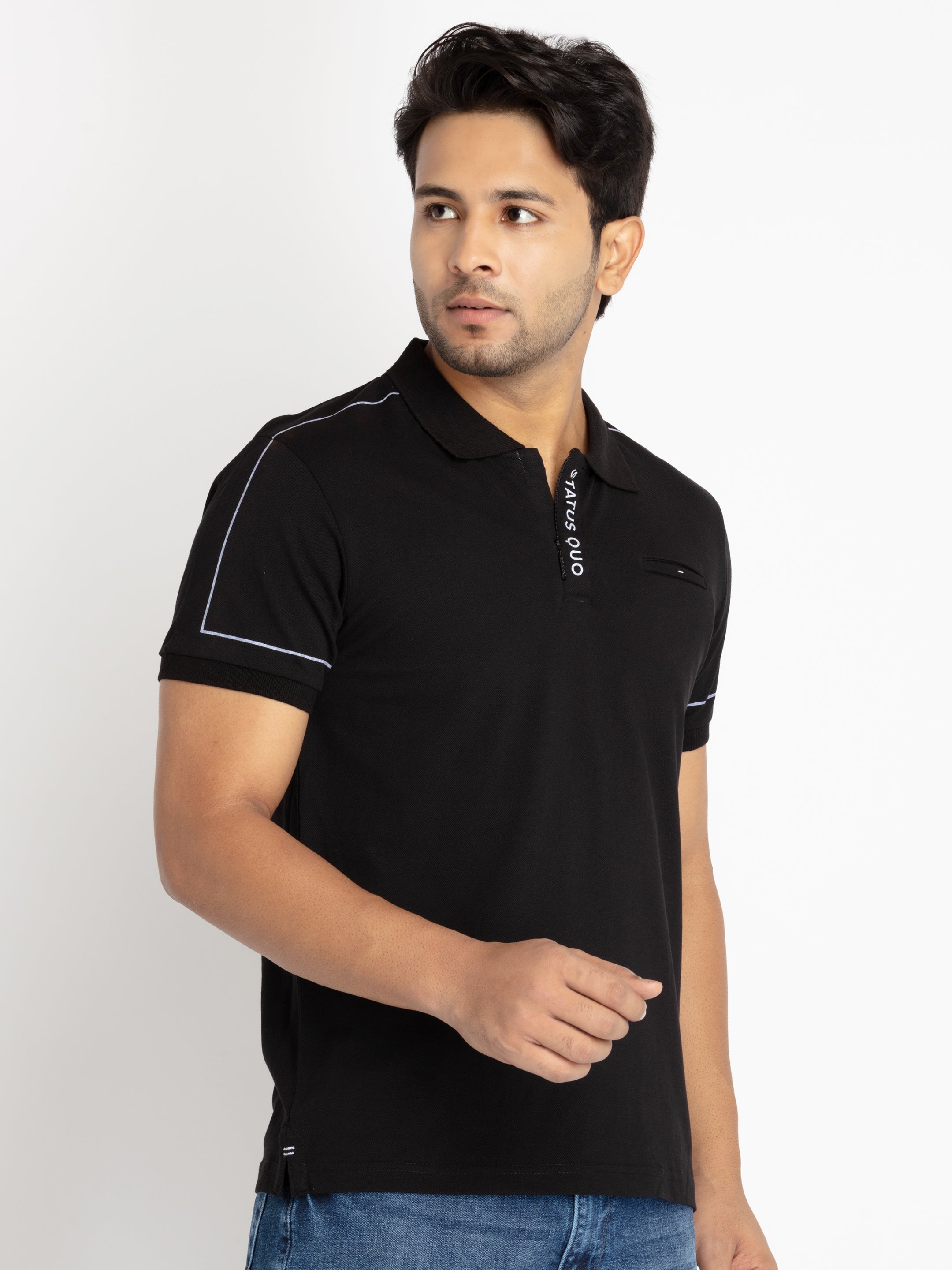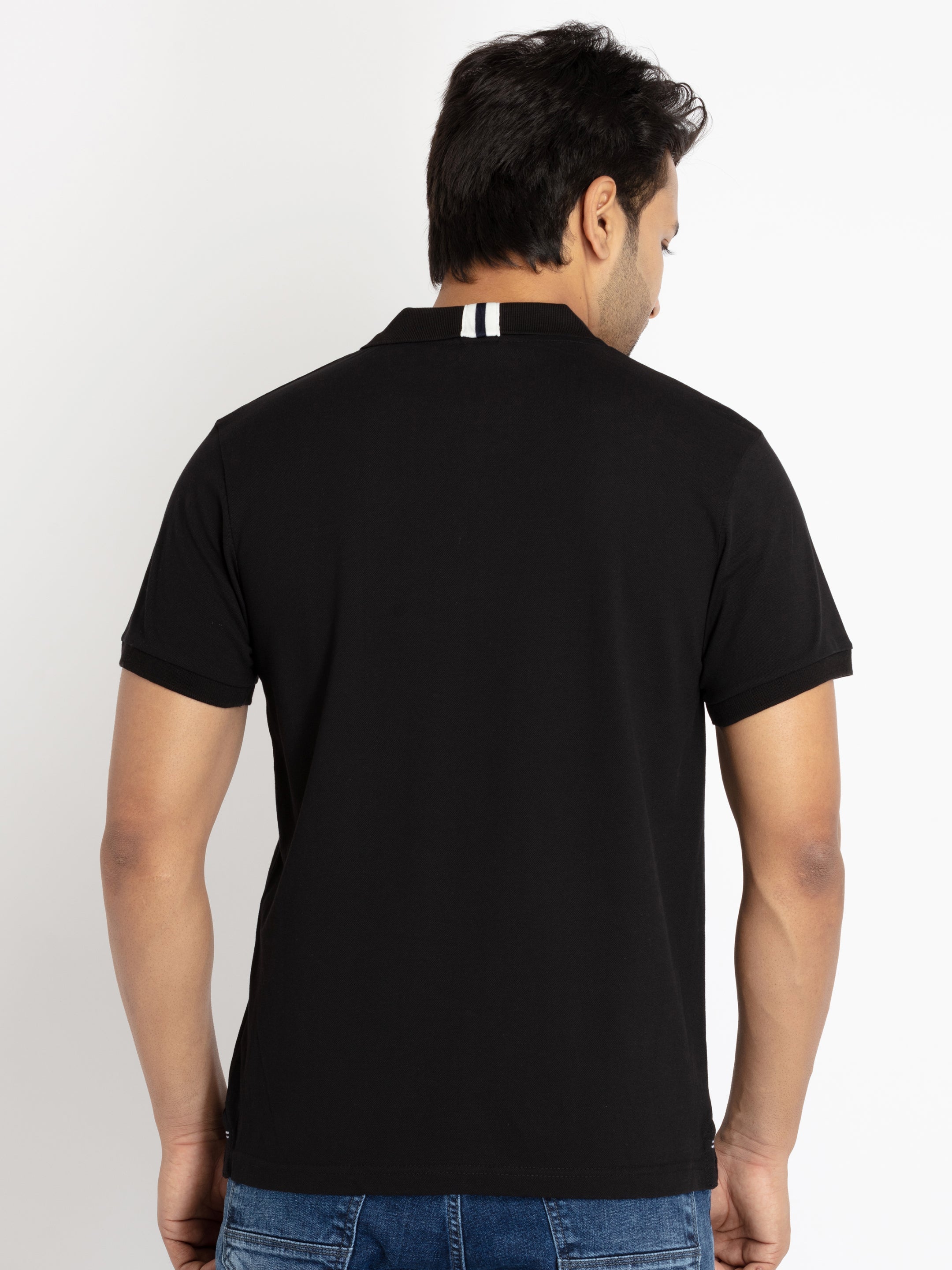 BLACK Polo Neck T-Shirt has Placket And Shoulder Print, Half Sleeves, Regular Fit