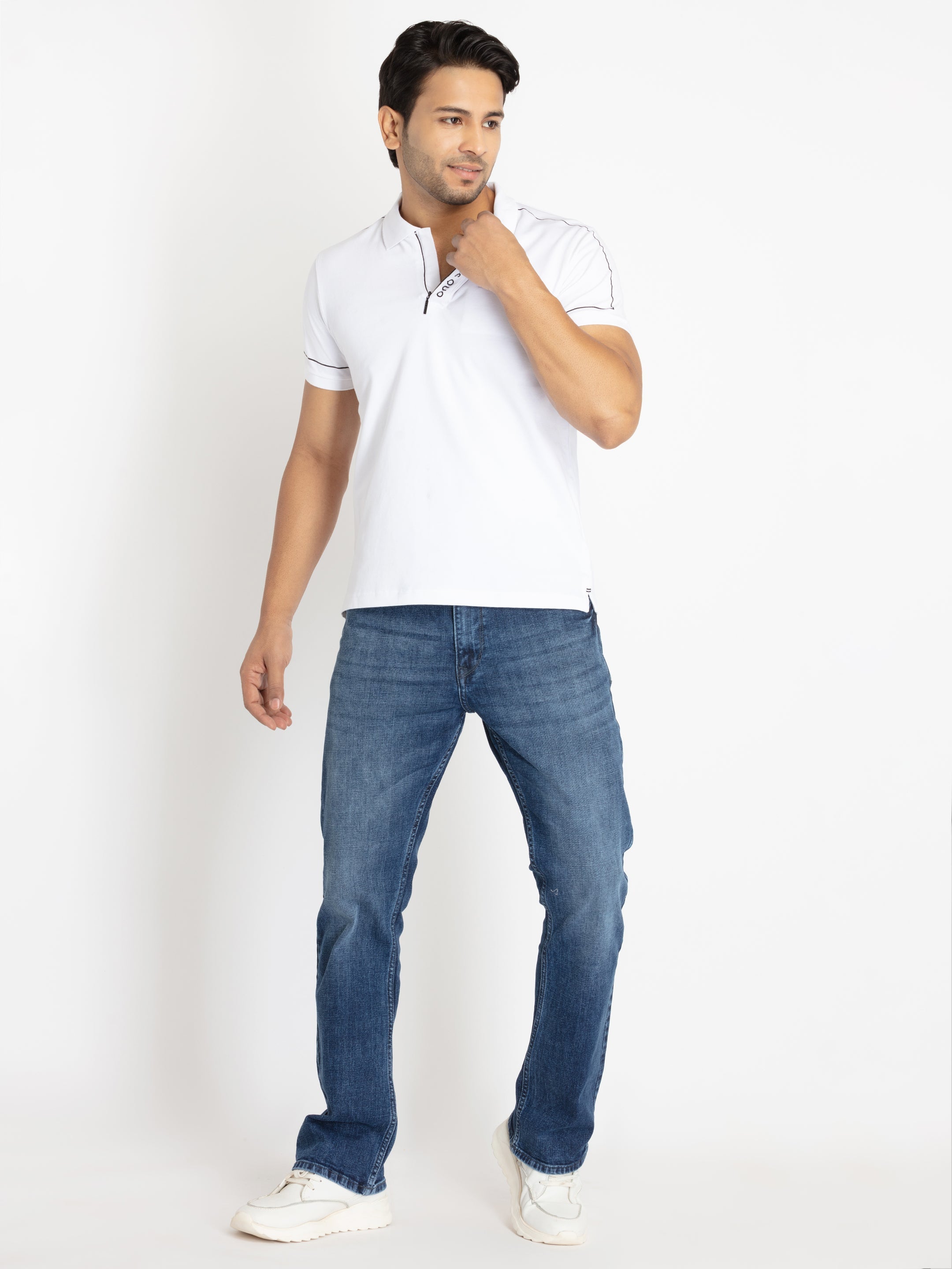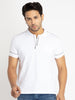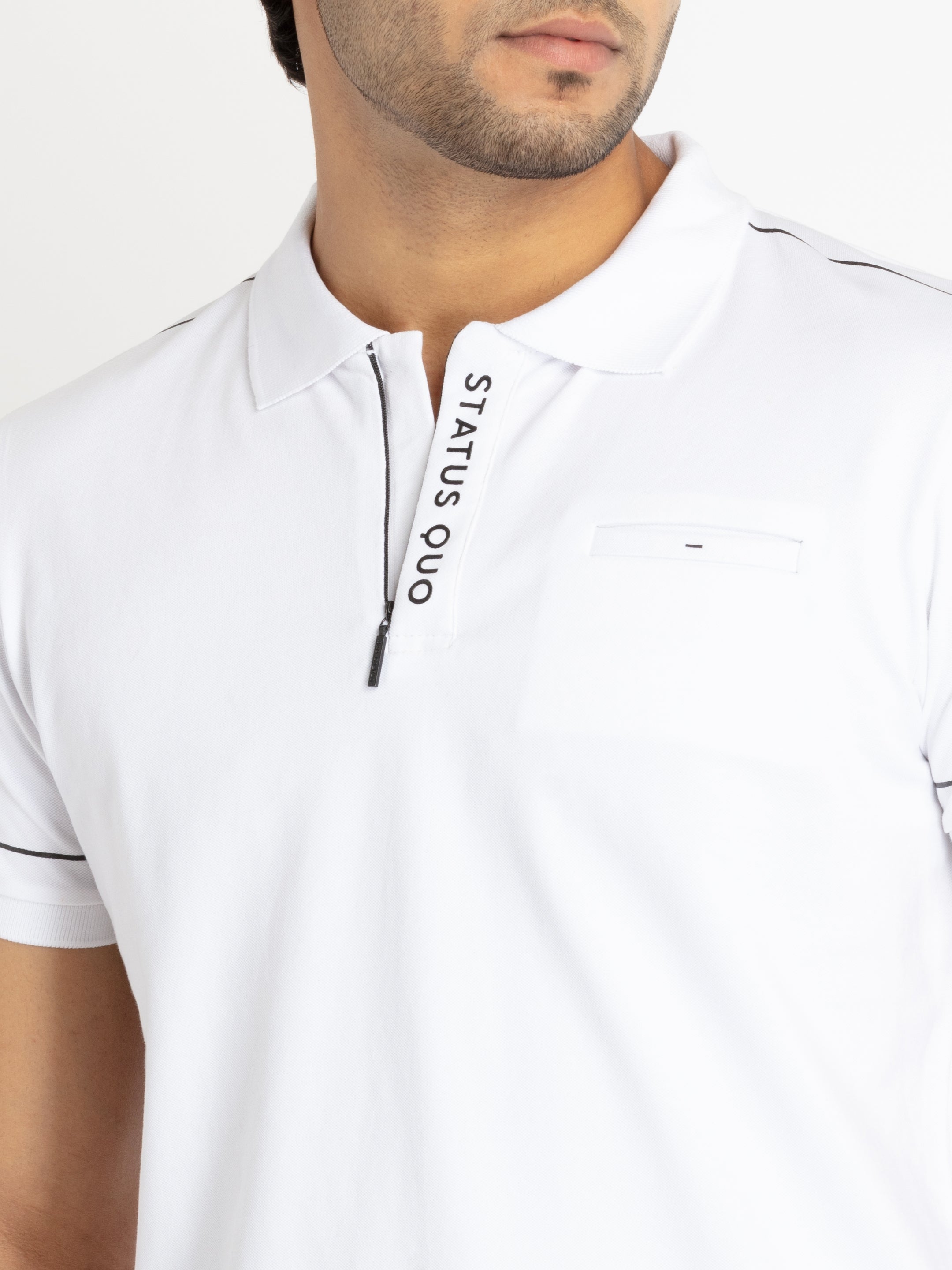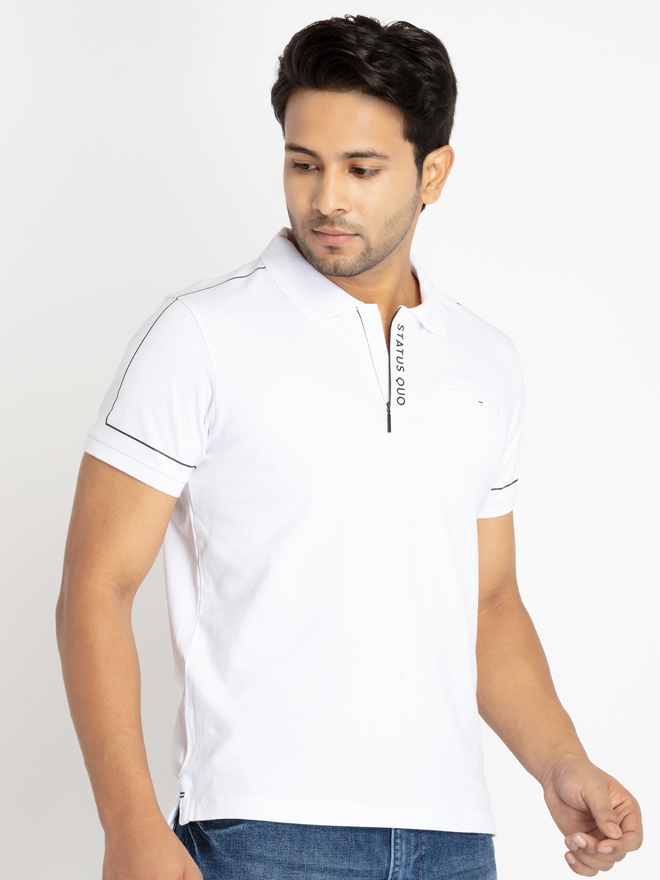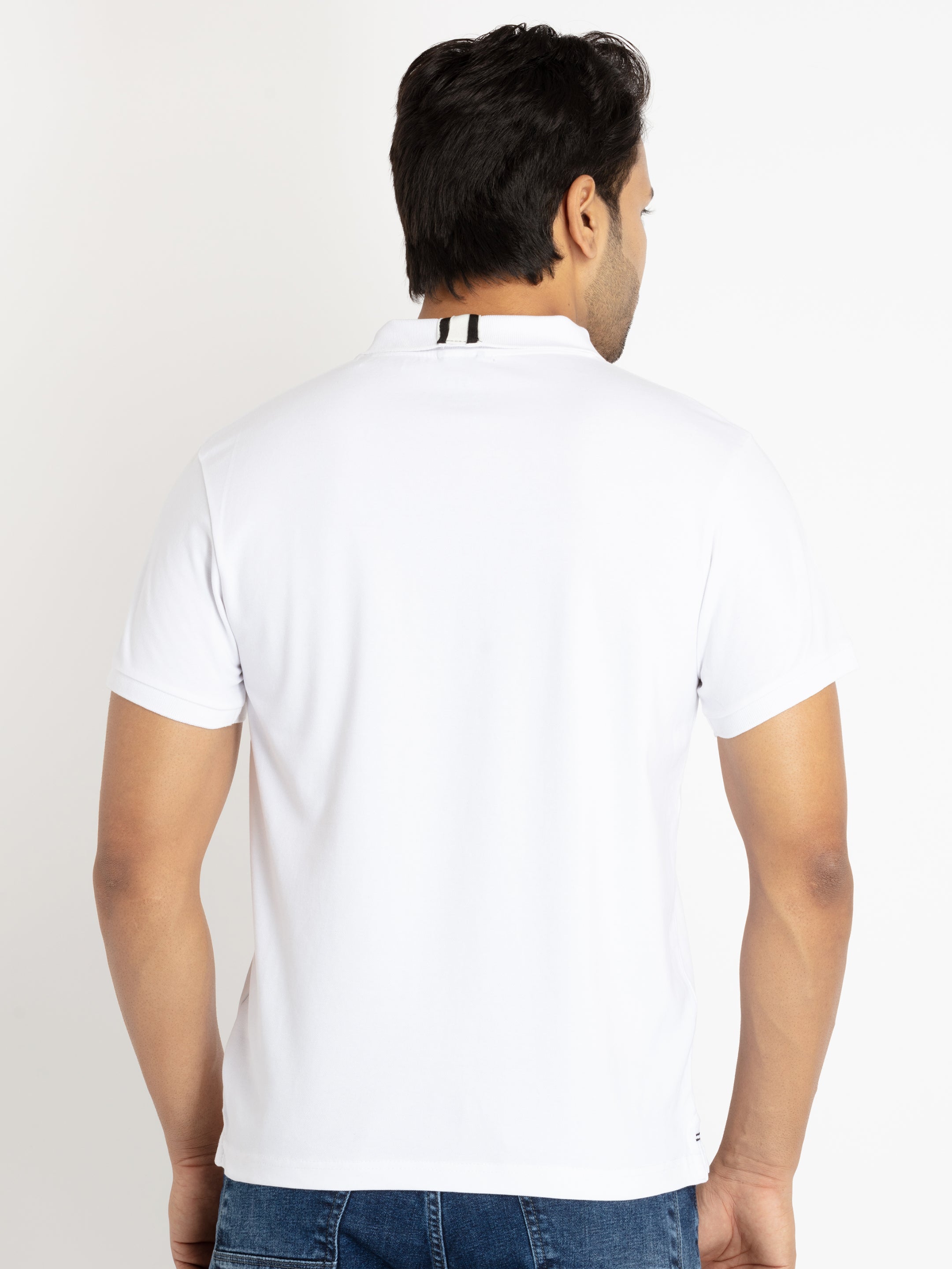 WHITE Polo Neck T-Shirt has Placket And Shoulder Print, Half Sleeves, Regular Fit