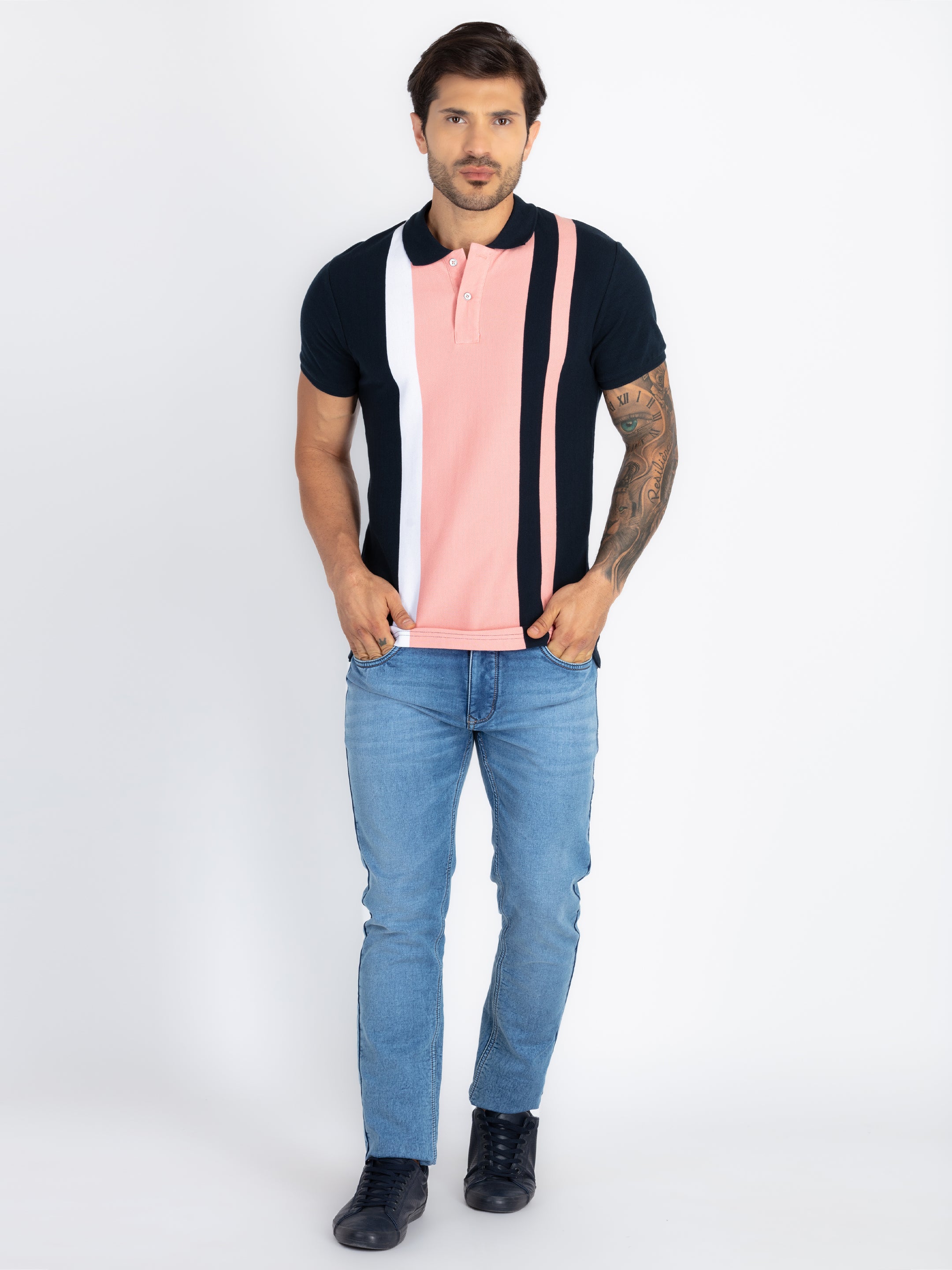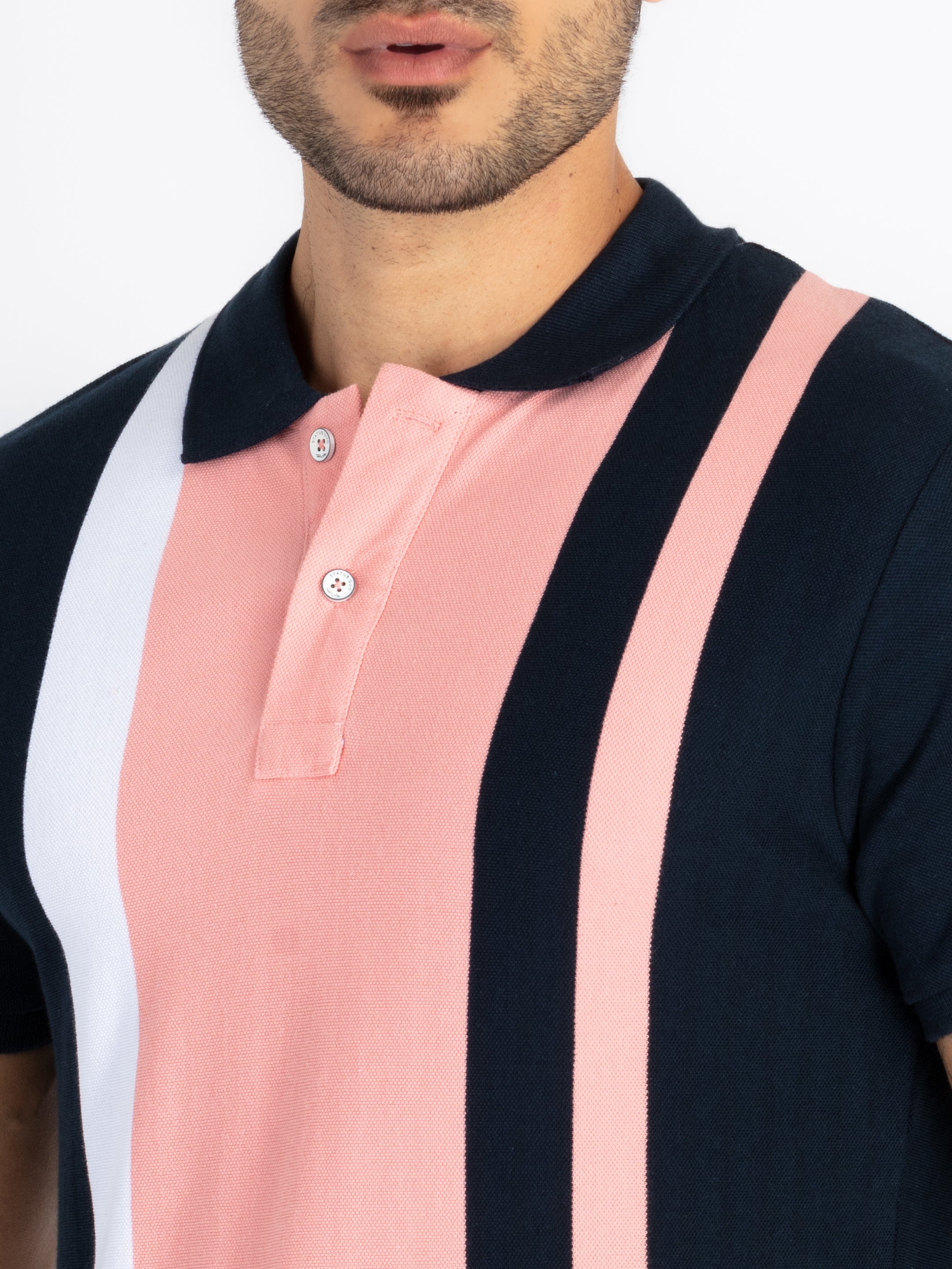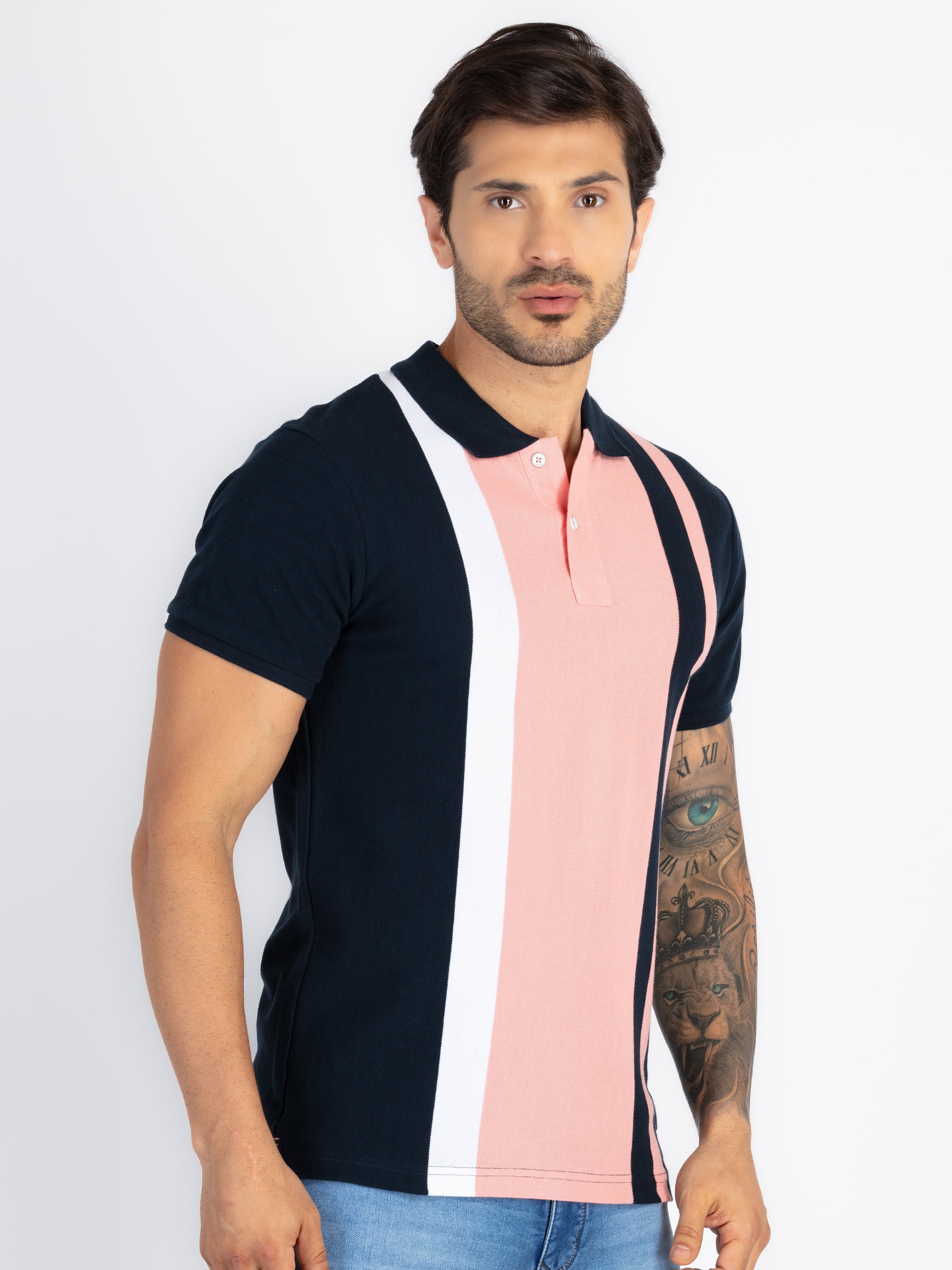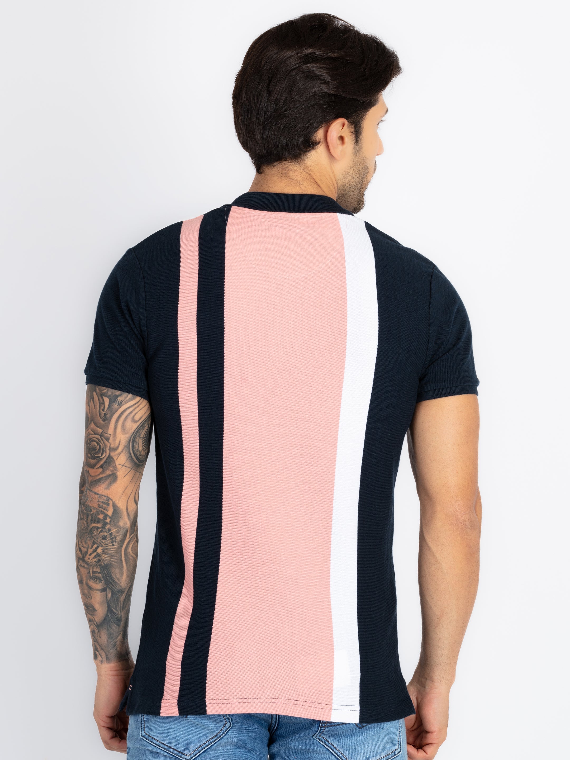 CORAL/NAVY Striped Polo T-Shirt Has Half Sleeves