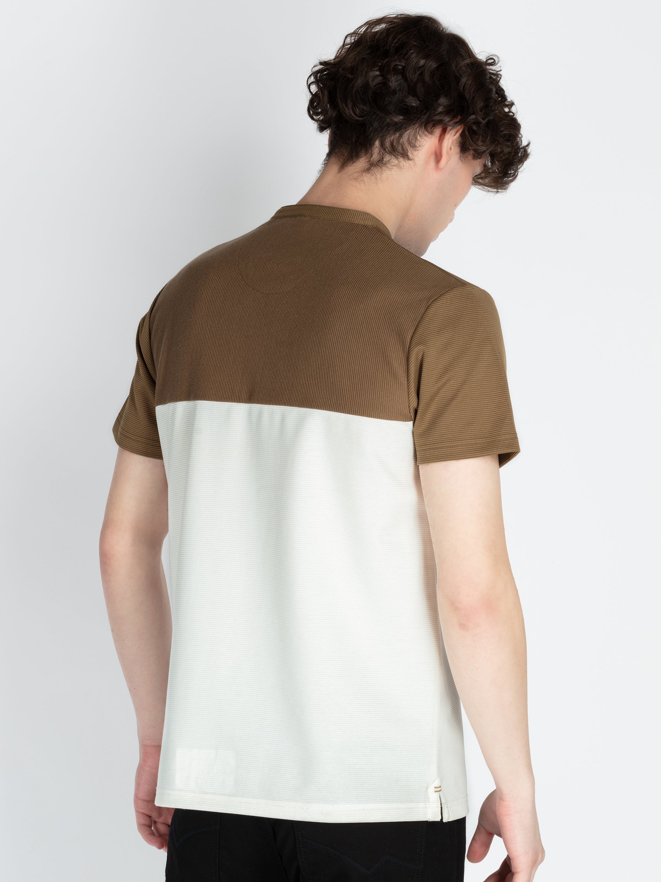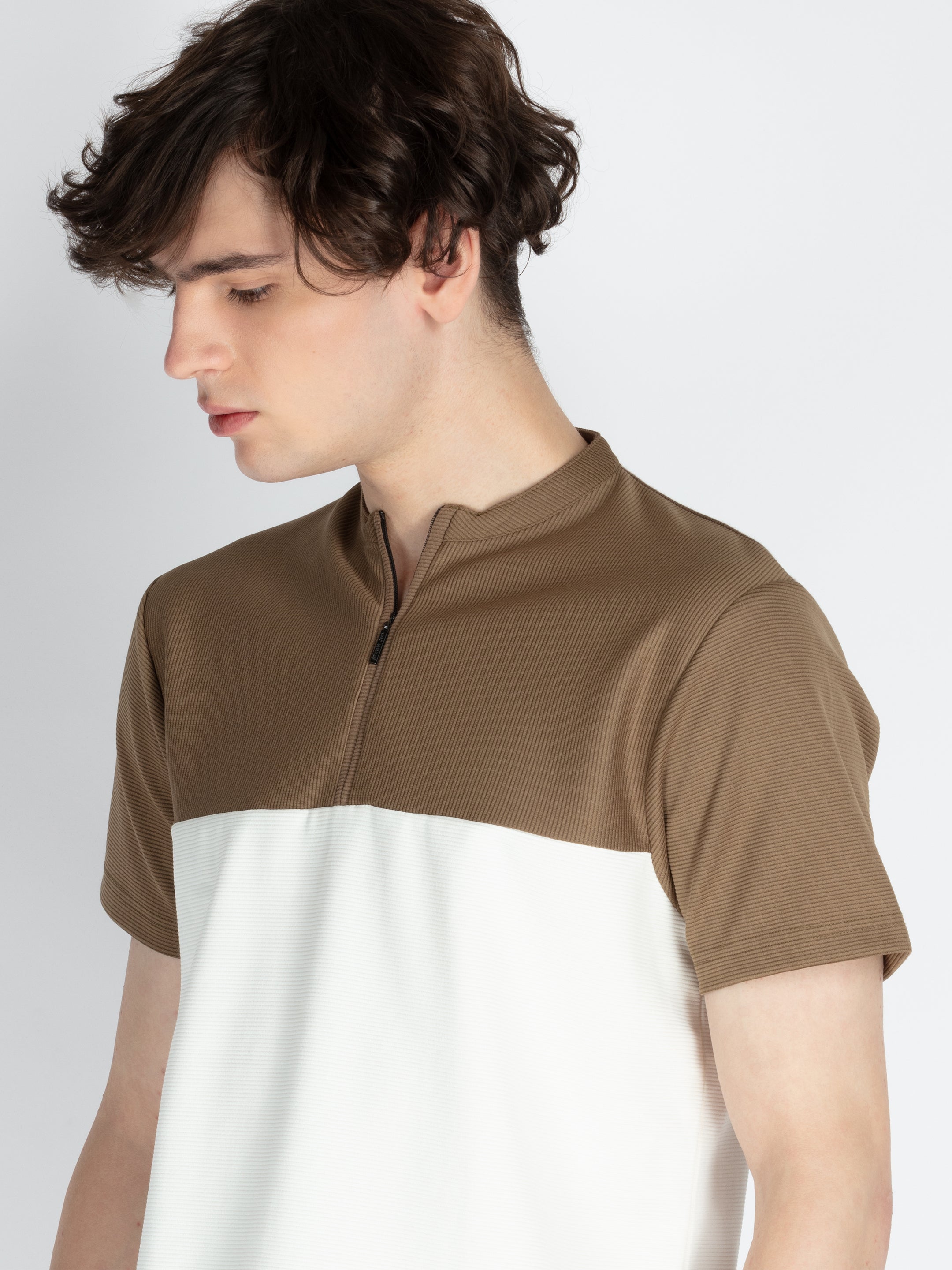 KHAKI/OFF WHITE T-Shirt Has Henley Neck & Half Sleeves