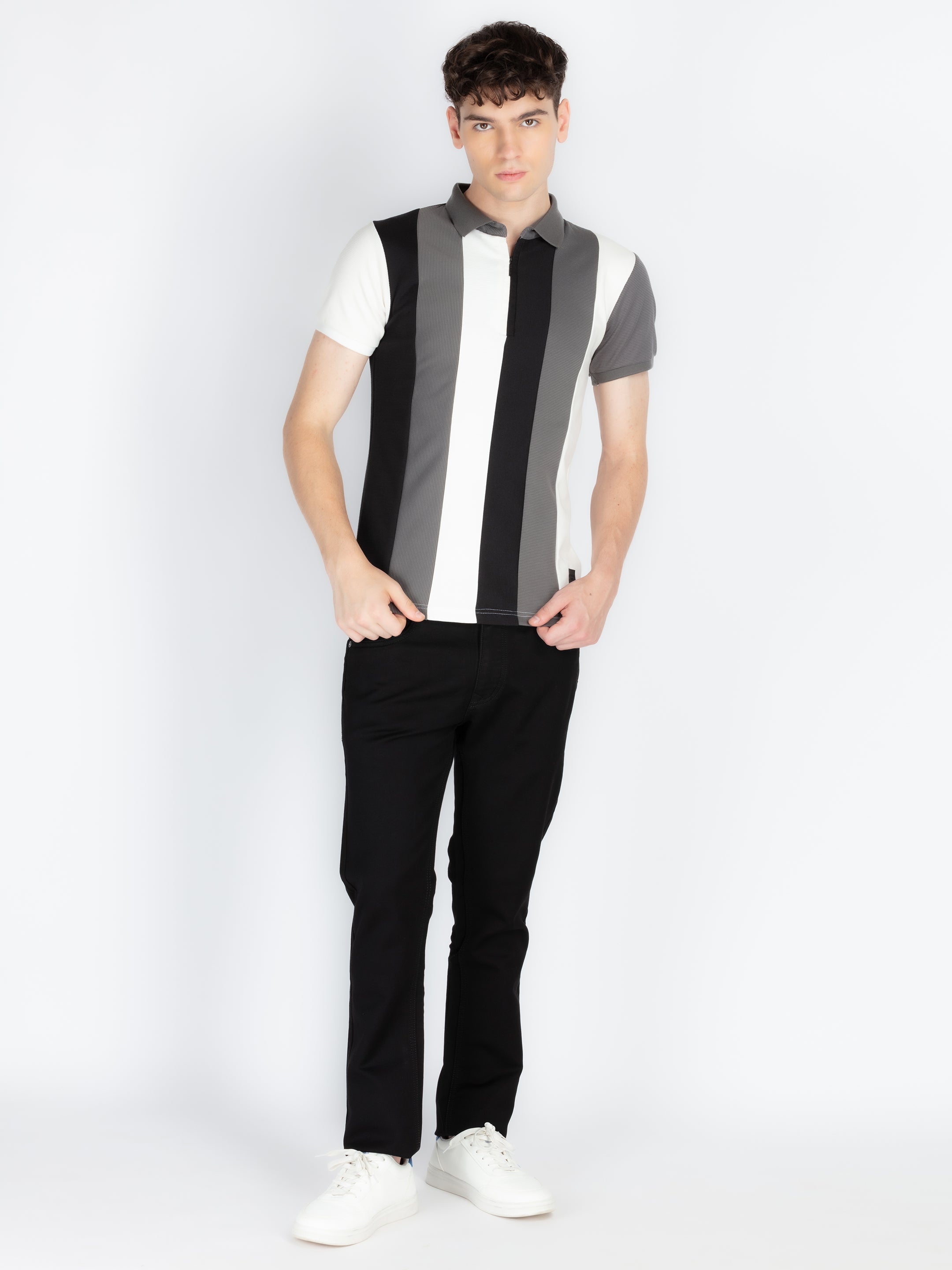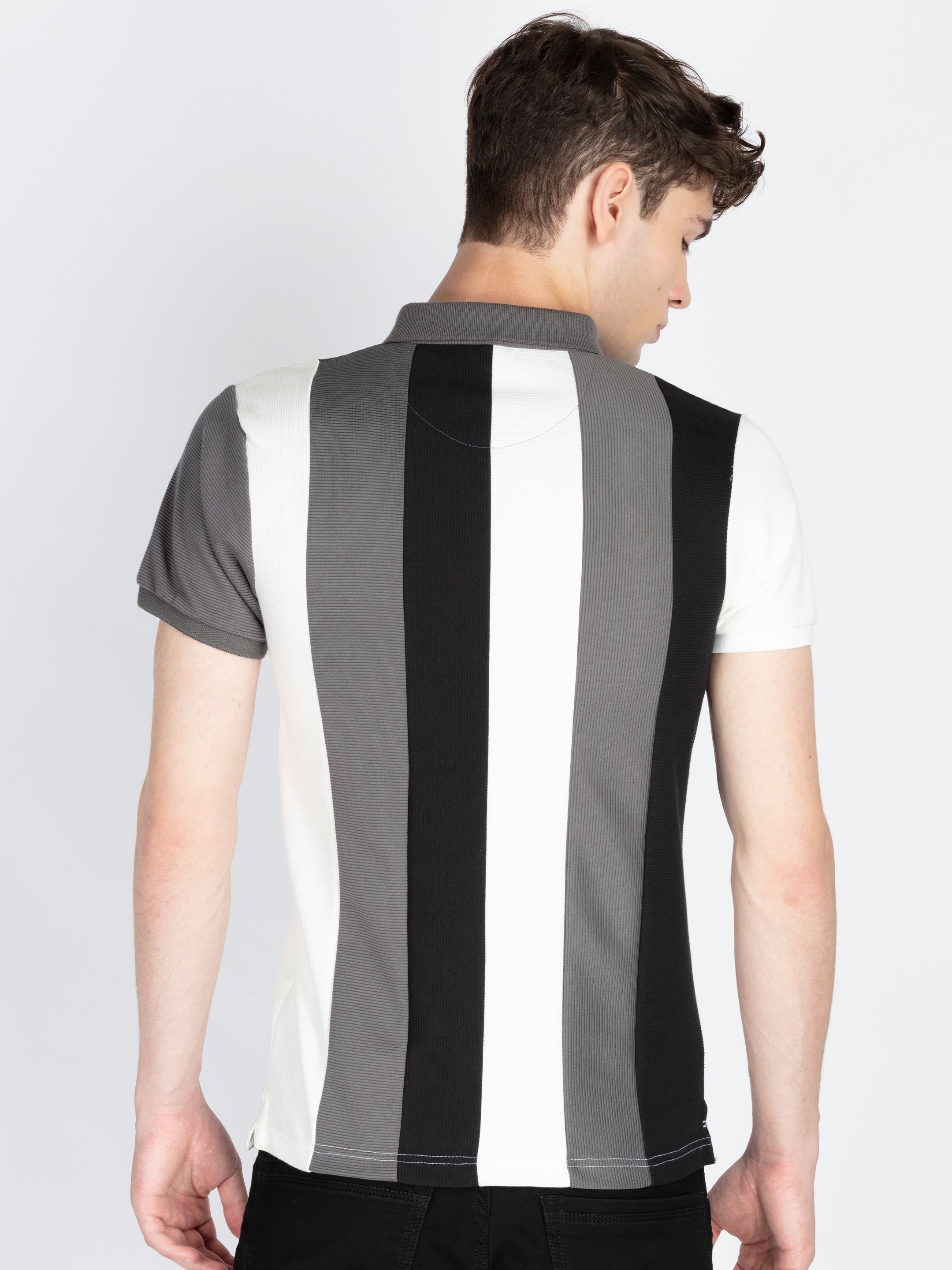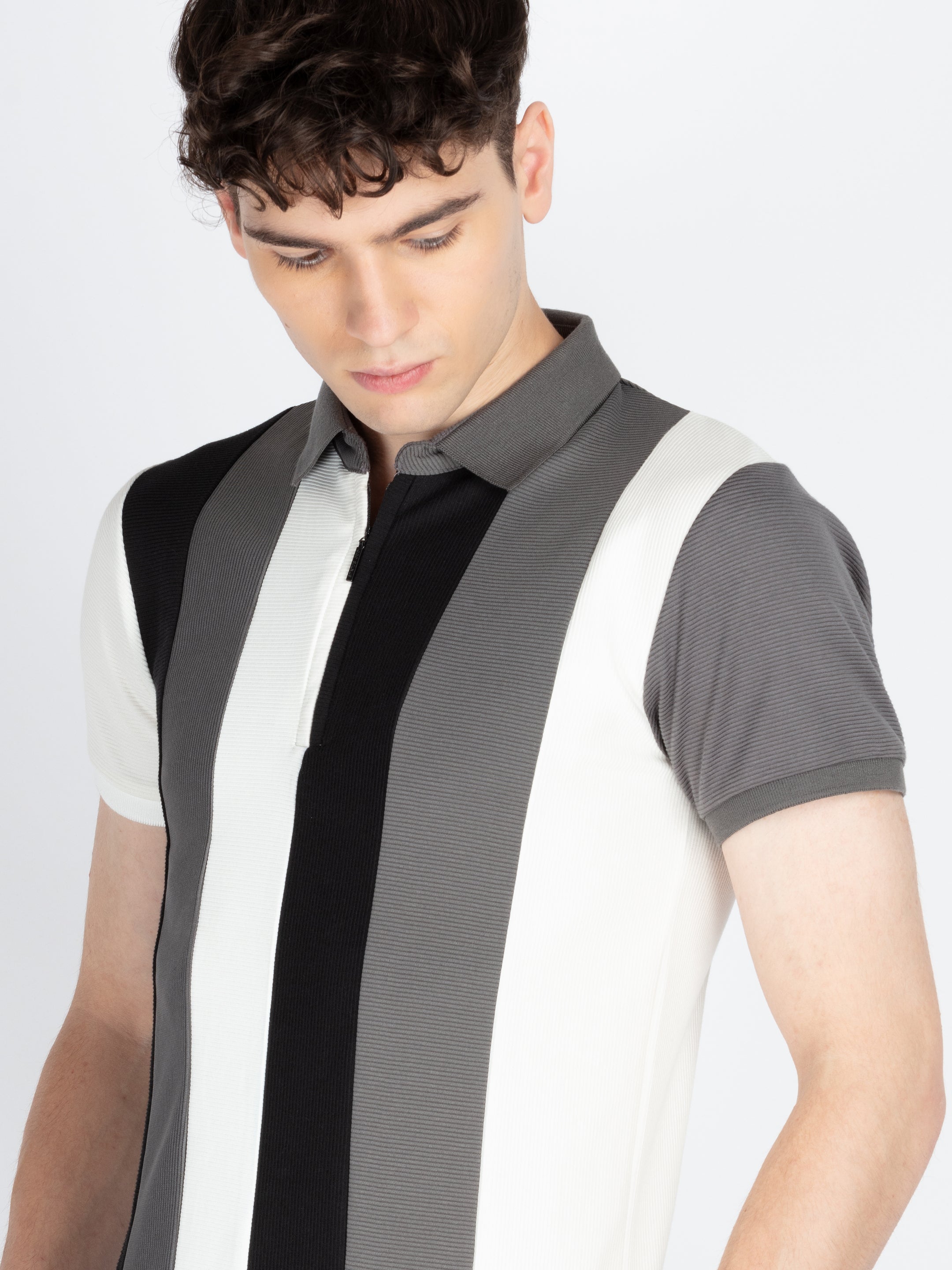 S.Grey/Off White Colourblocked Polo Collar T-Shirt With Half Sleeves