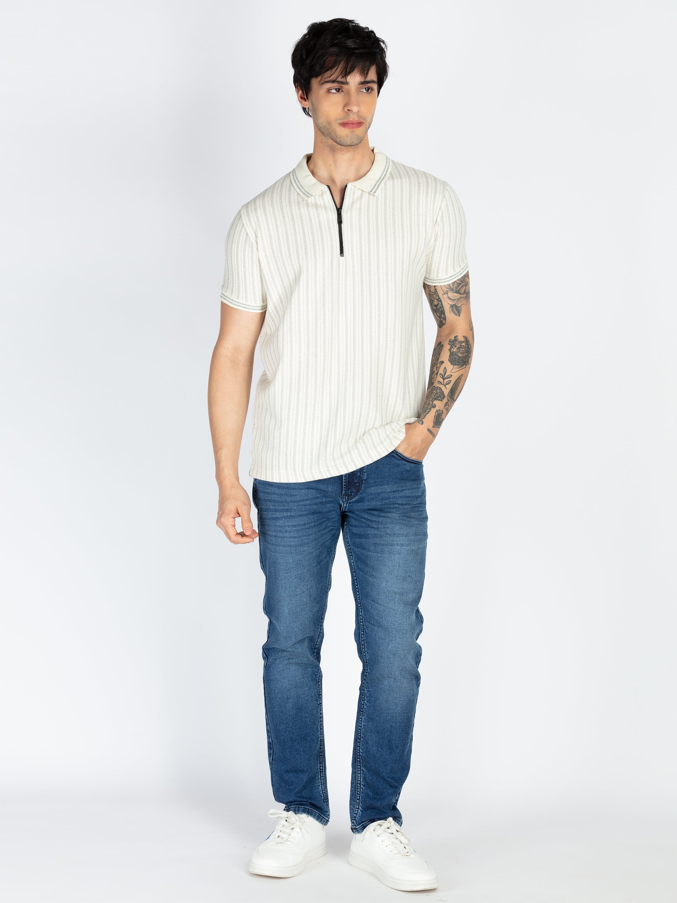 Off White Mens Striped Polo Collar T-Shirt With Half Sleeves