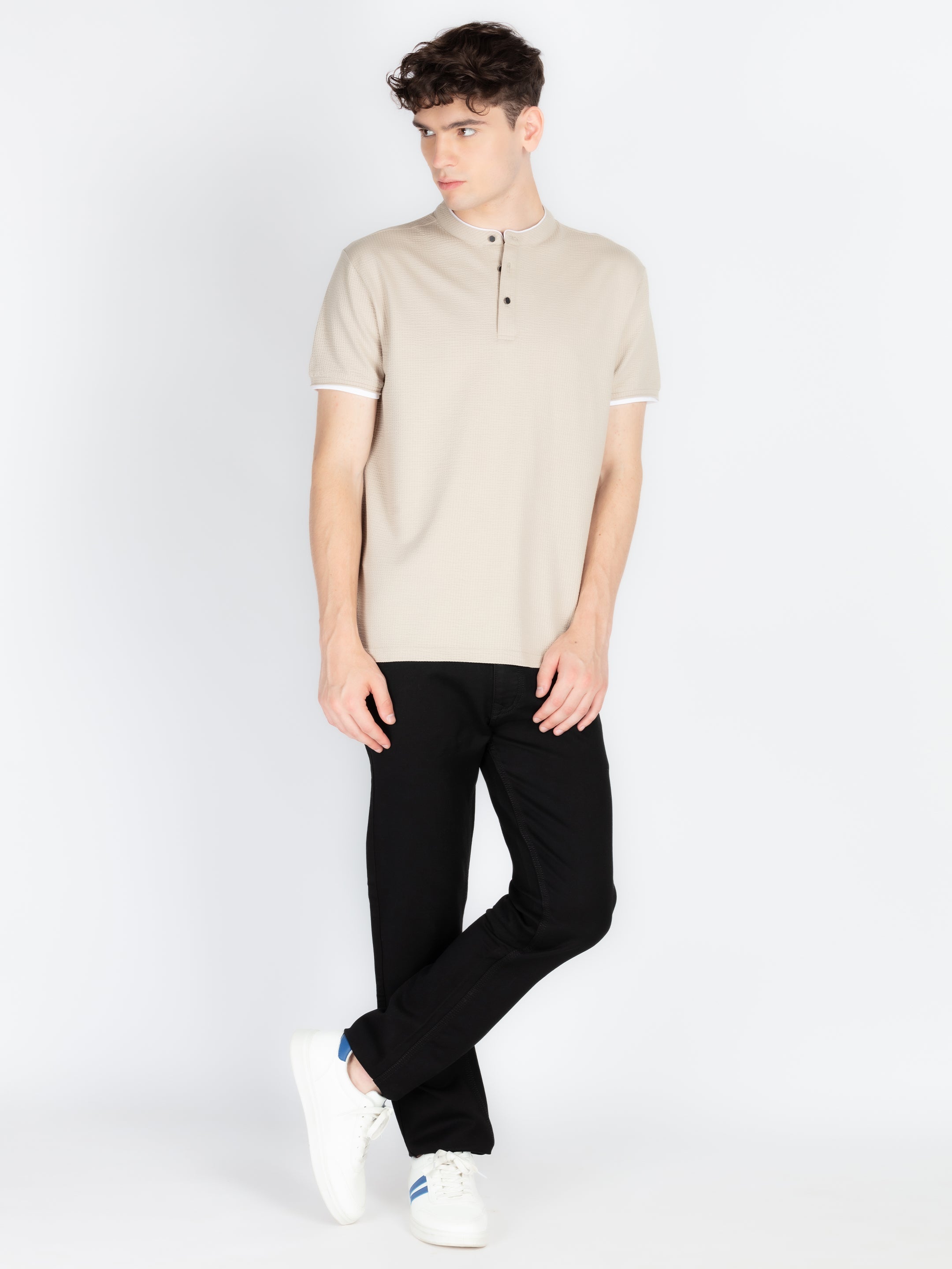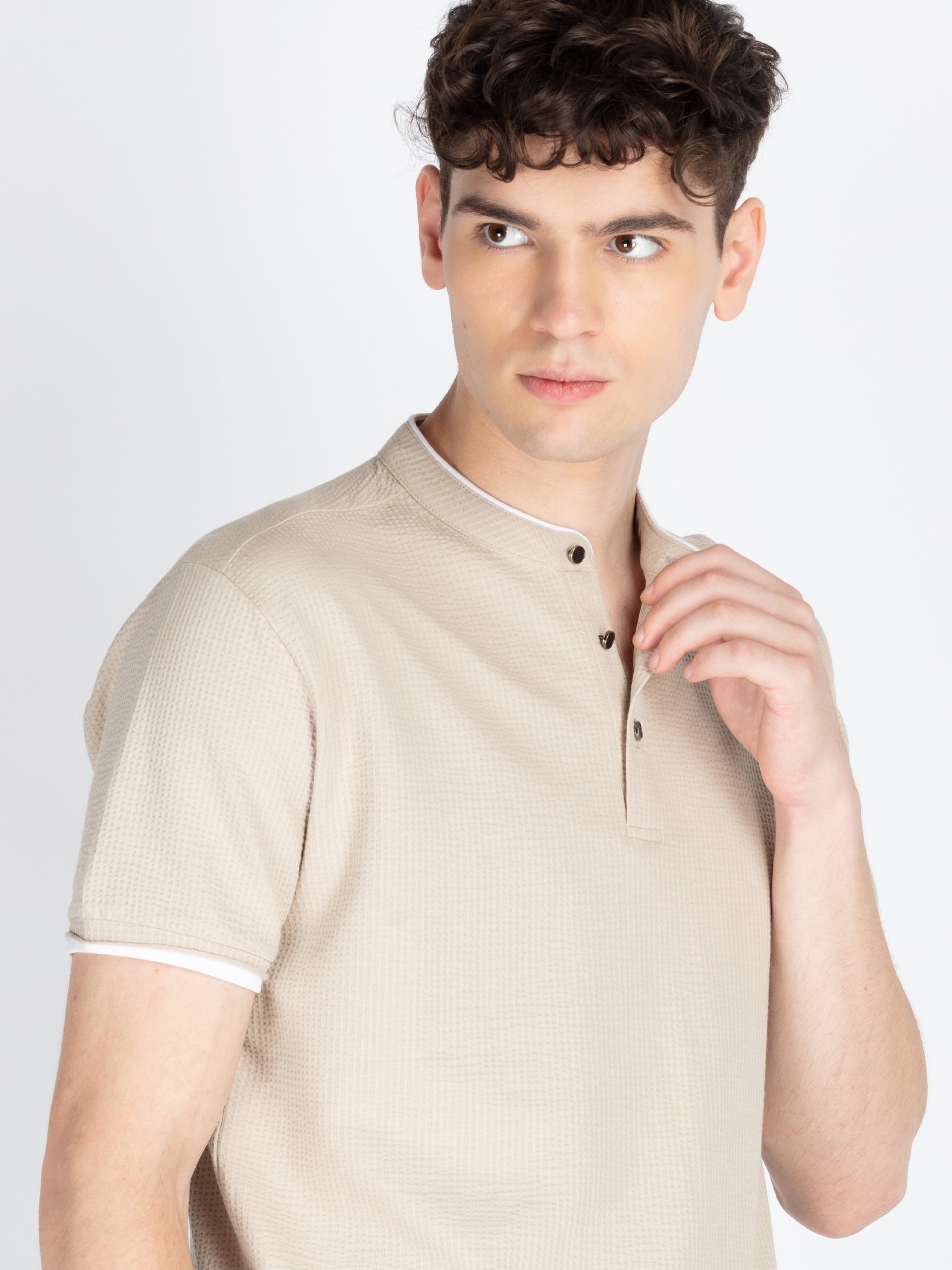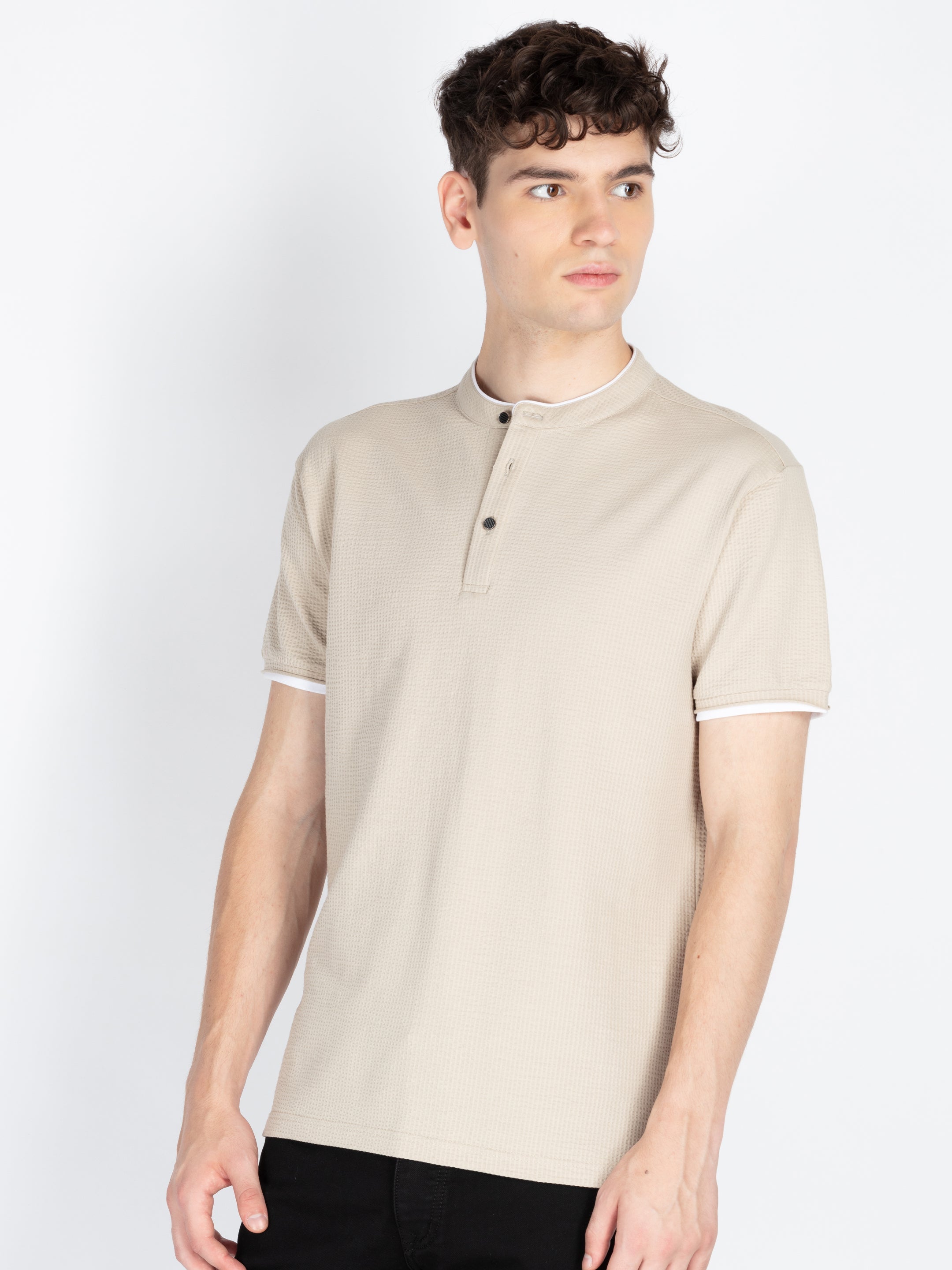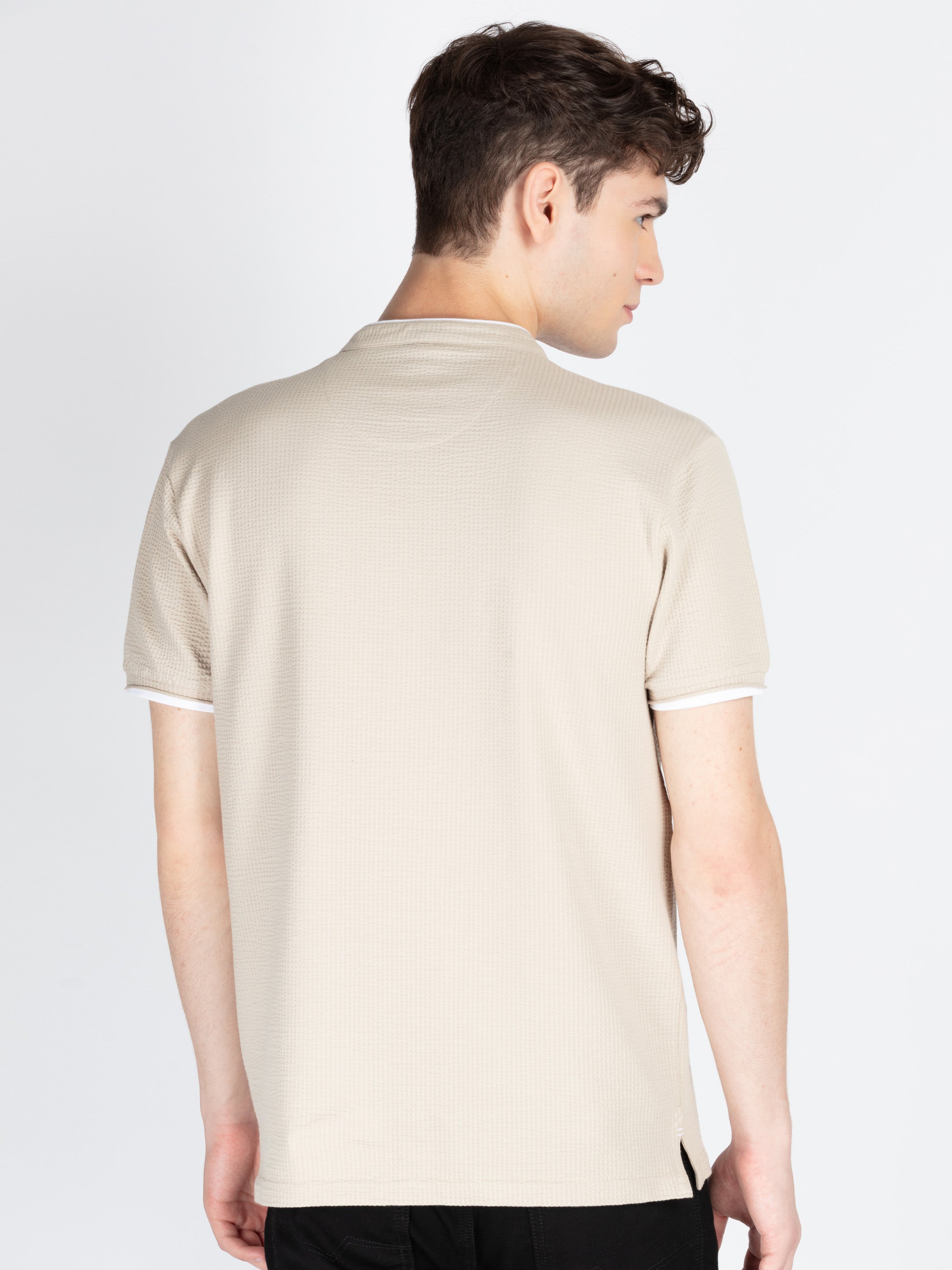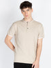 Beige Mens Solid Henley Neck T-Shirt With Half Sleeves