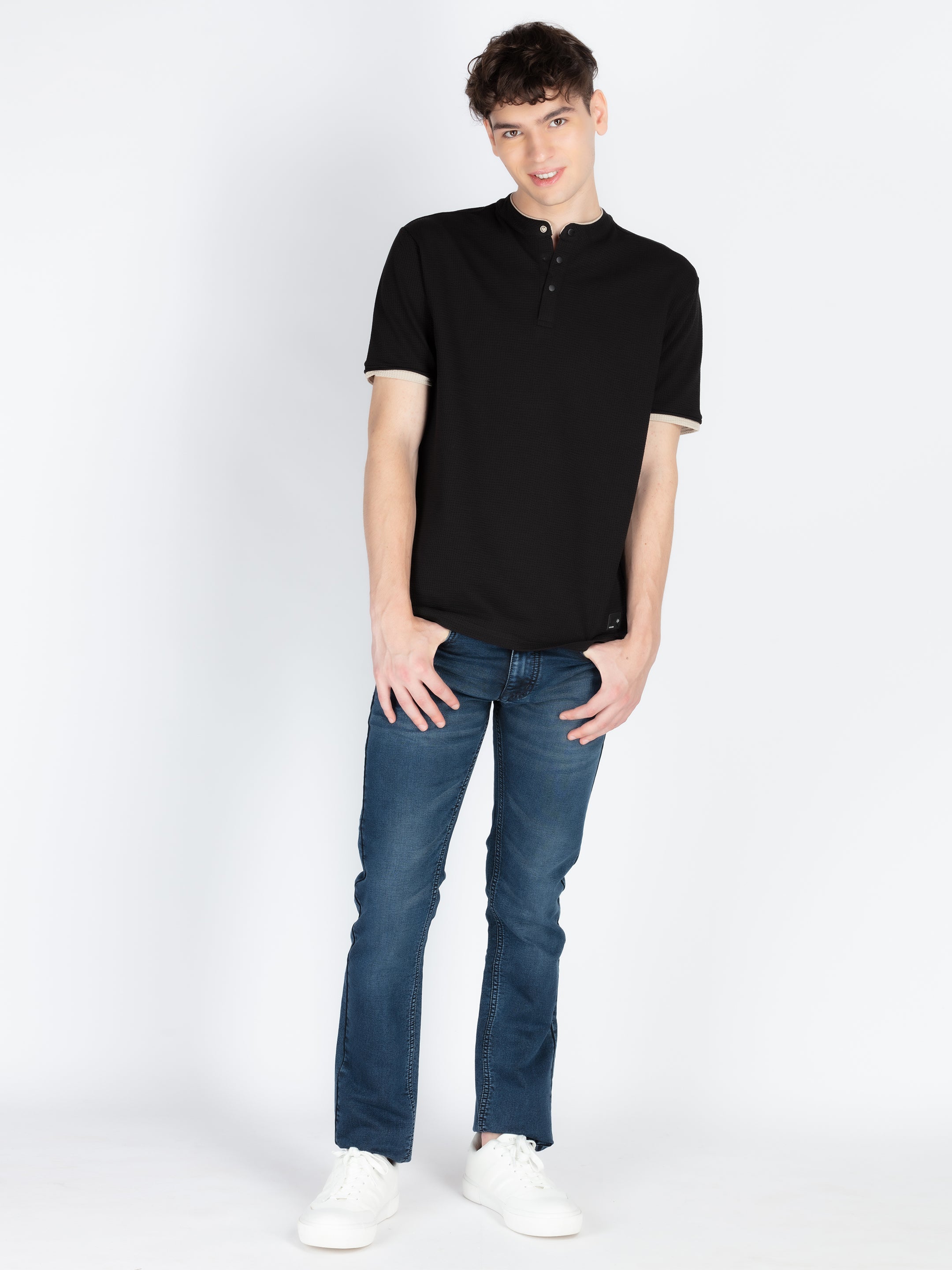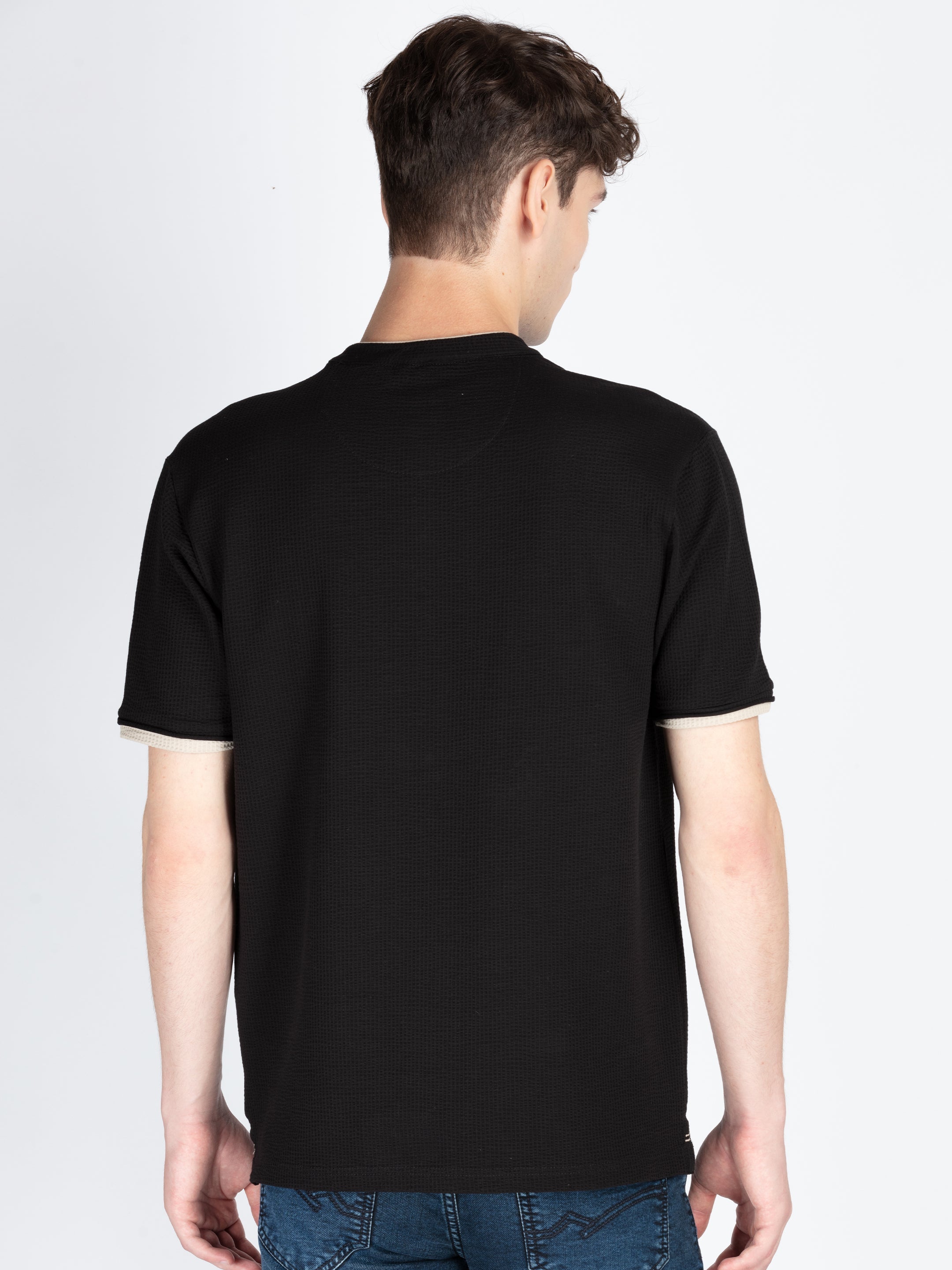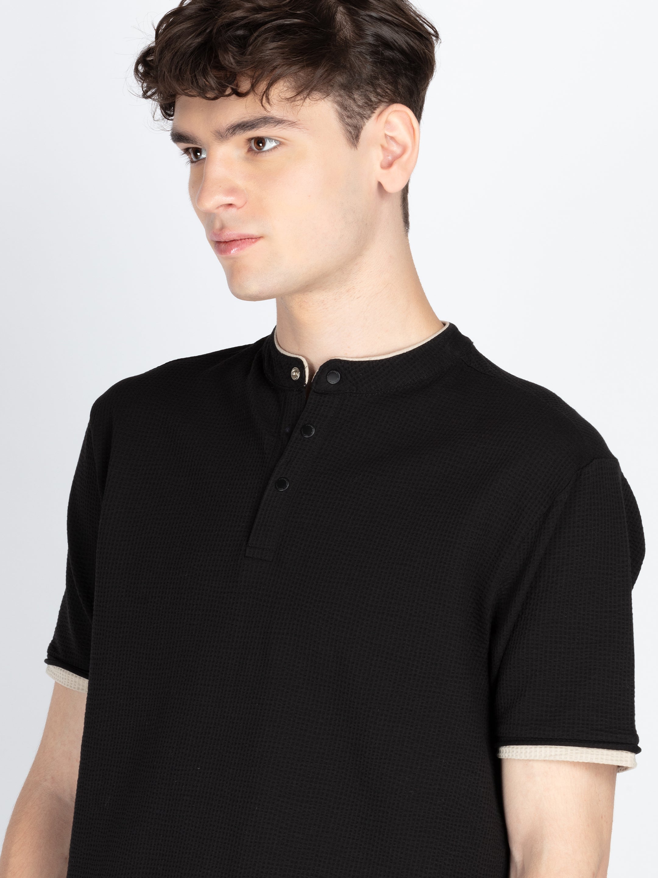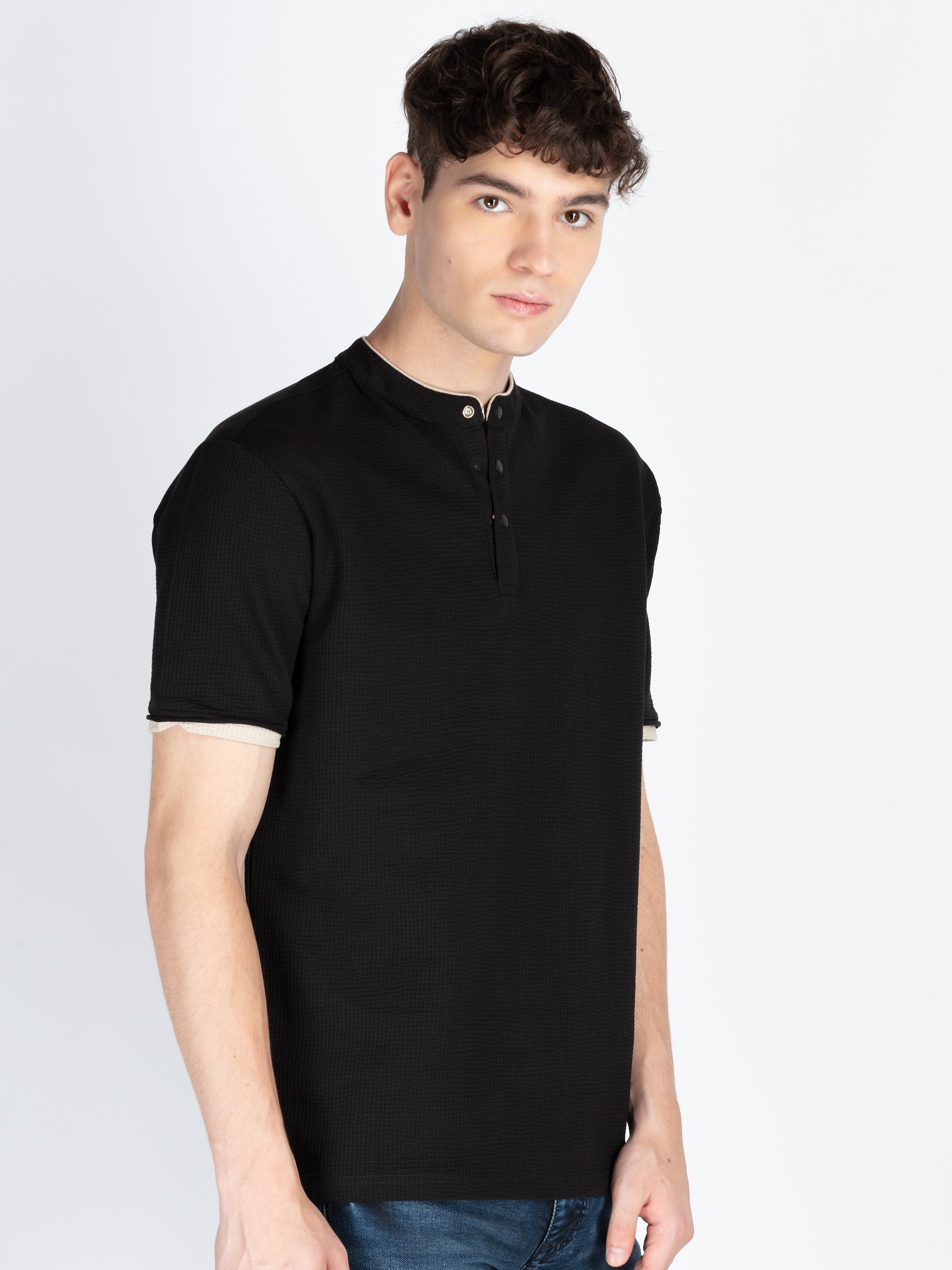 Black Mens Solid Henley Neck T-Shirt With Half Sleeves