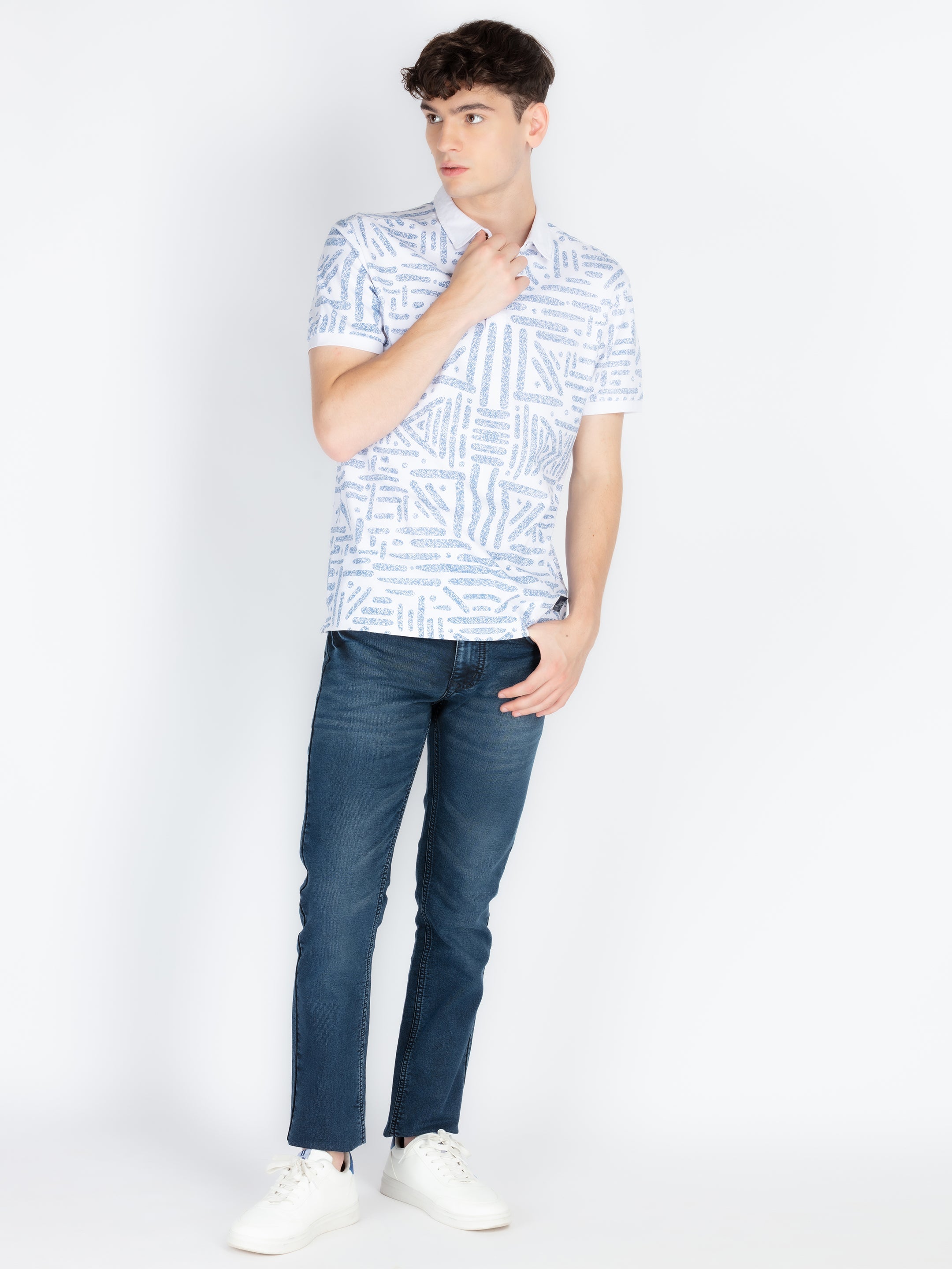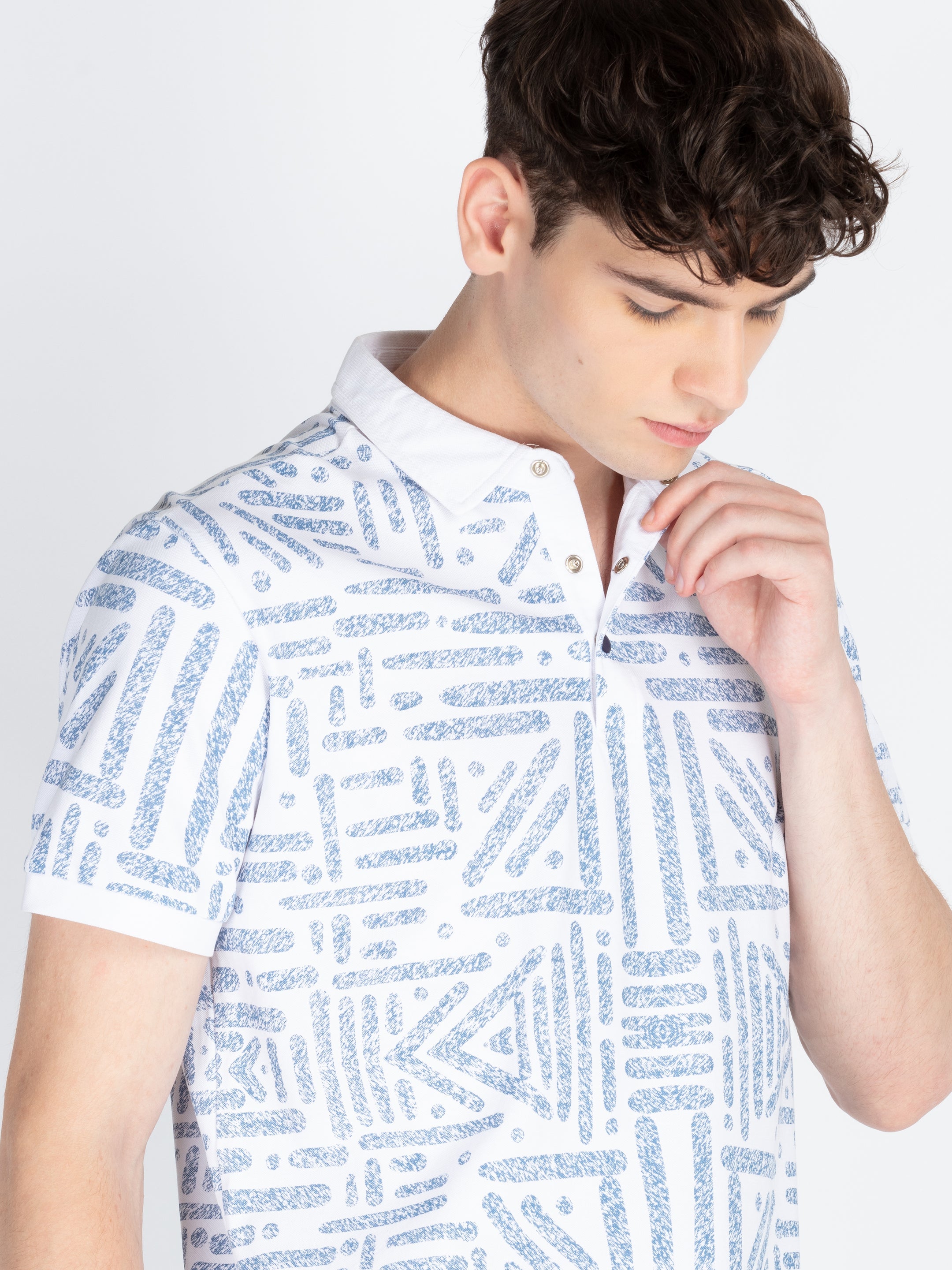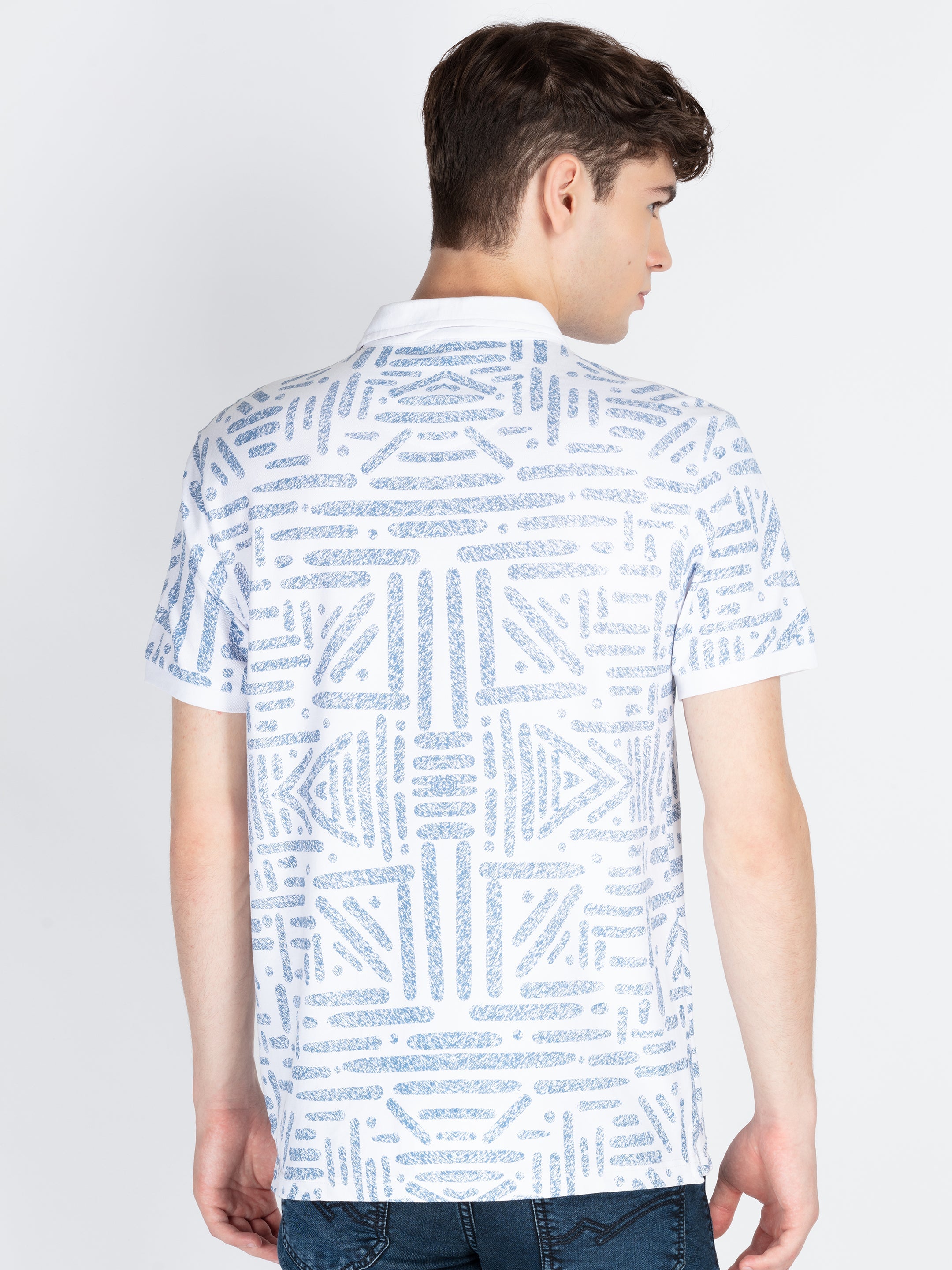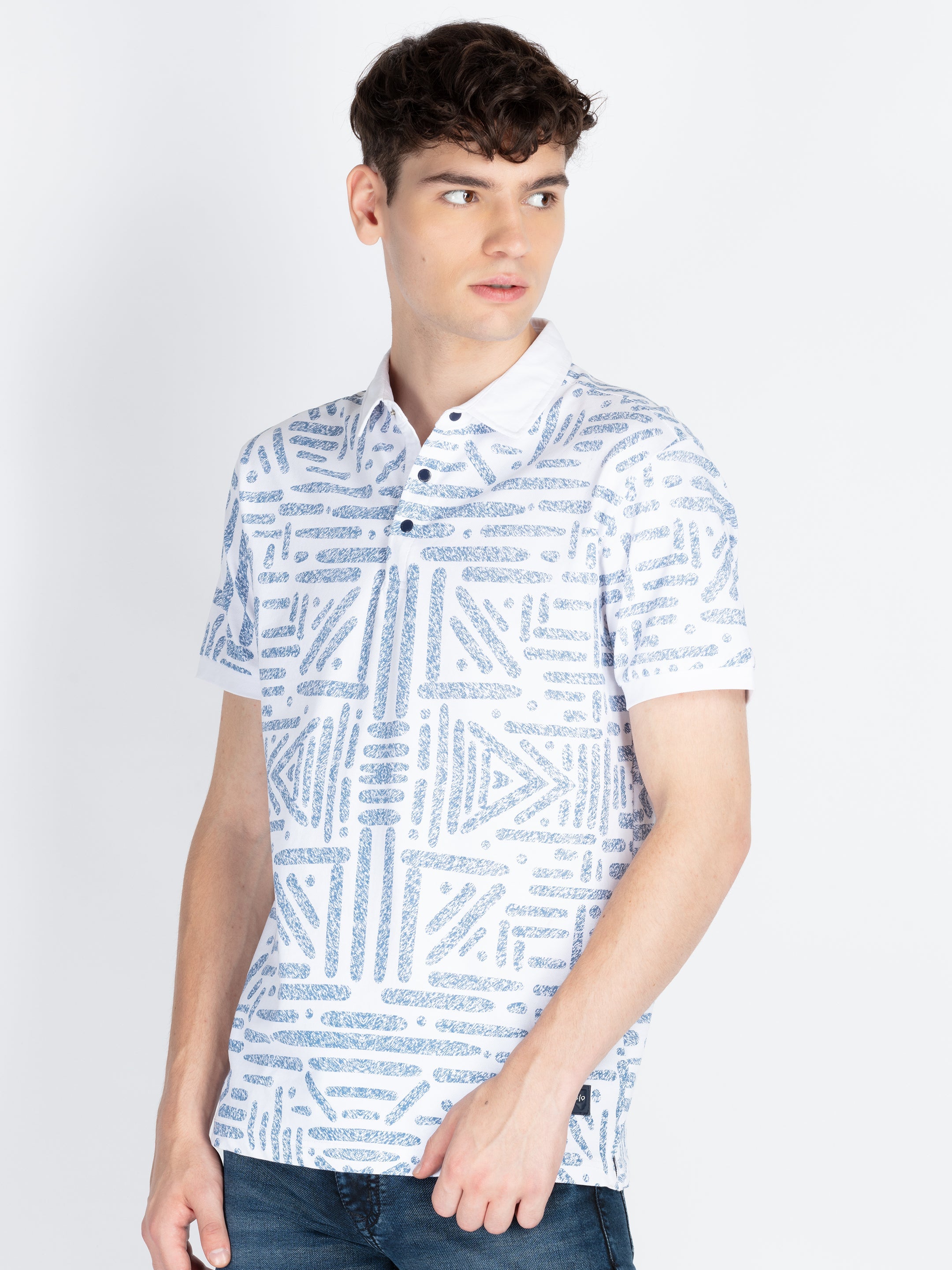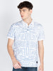 White Mens Printed Polo Collar T-Shirt With Half Sleeves