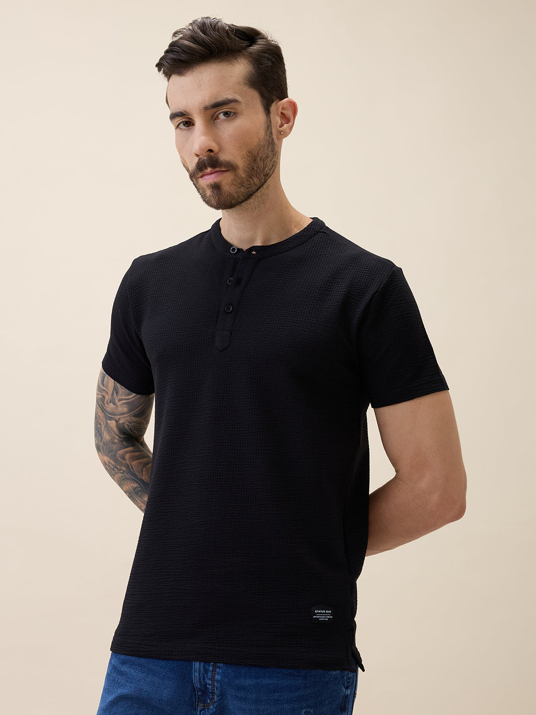 BLACK Men's Solid Henley Neck Half Sleeves Regular Fit Tshirt
