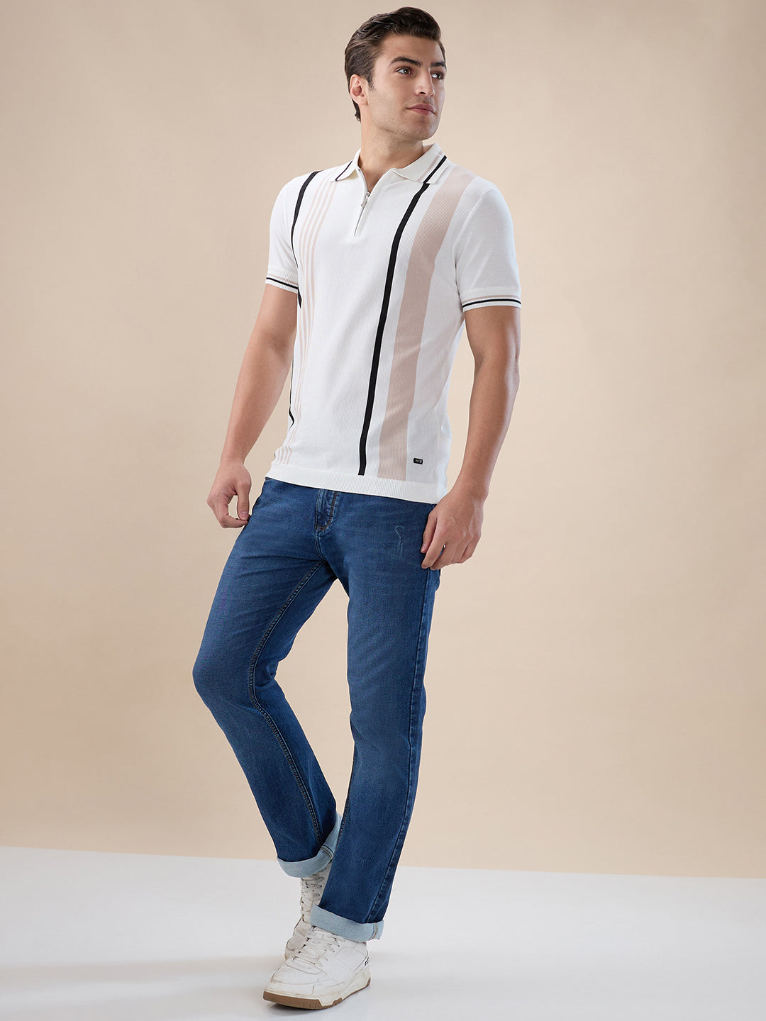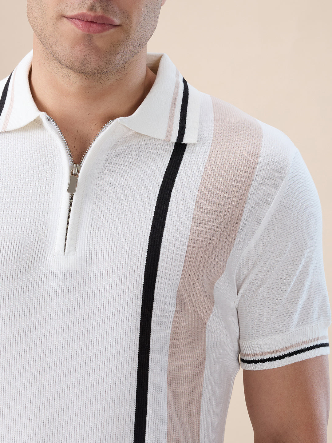 OFF WHITE Men's Striped Regular Fit Half Sleeve Polo T-shirt with Half Zipper and Tipped Detailing