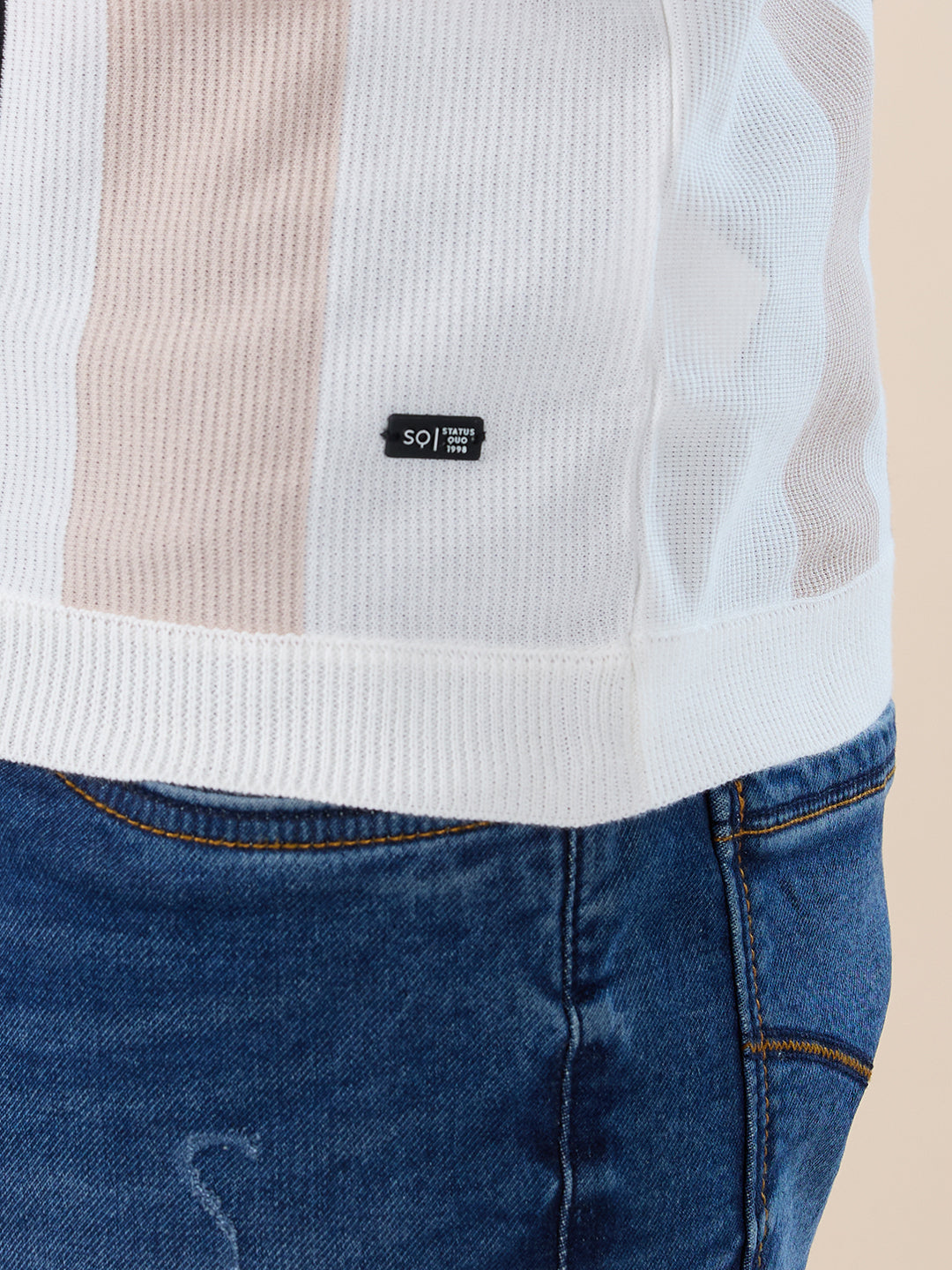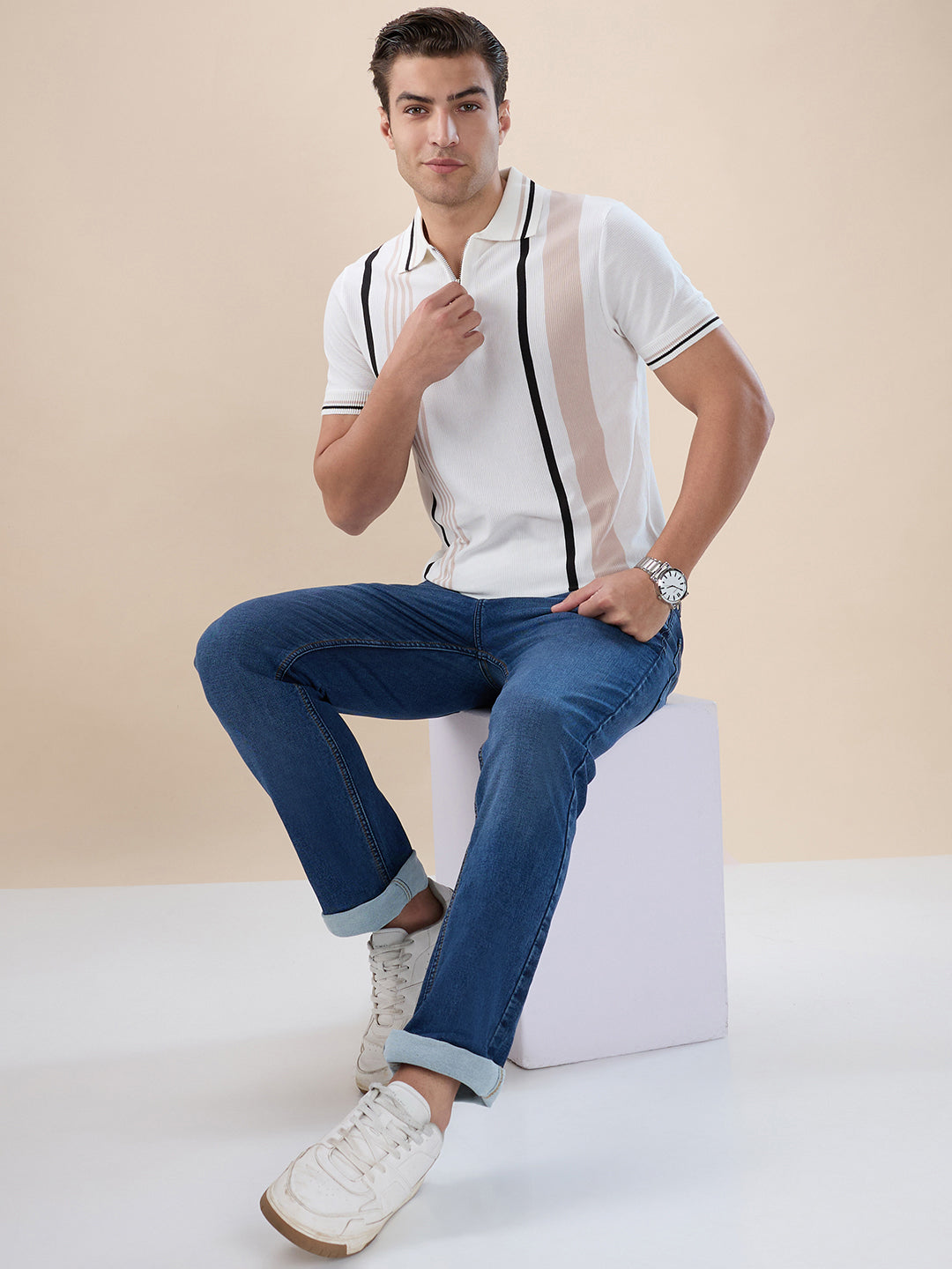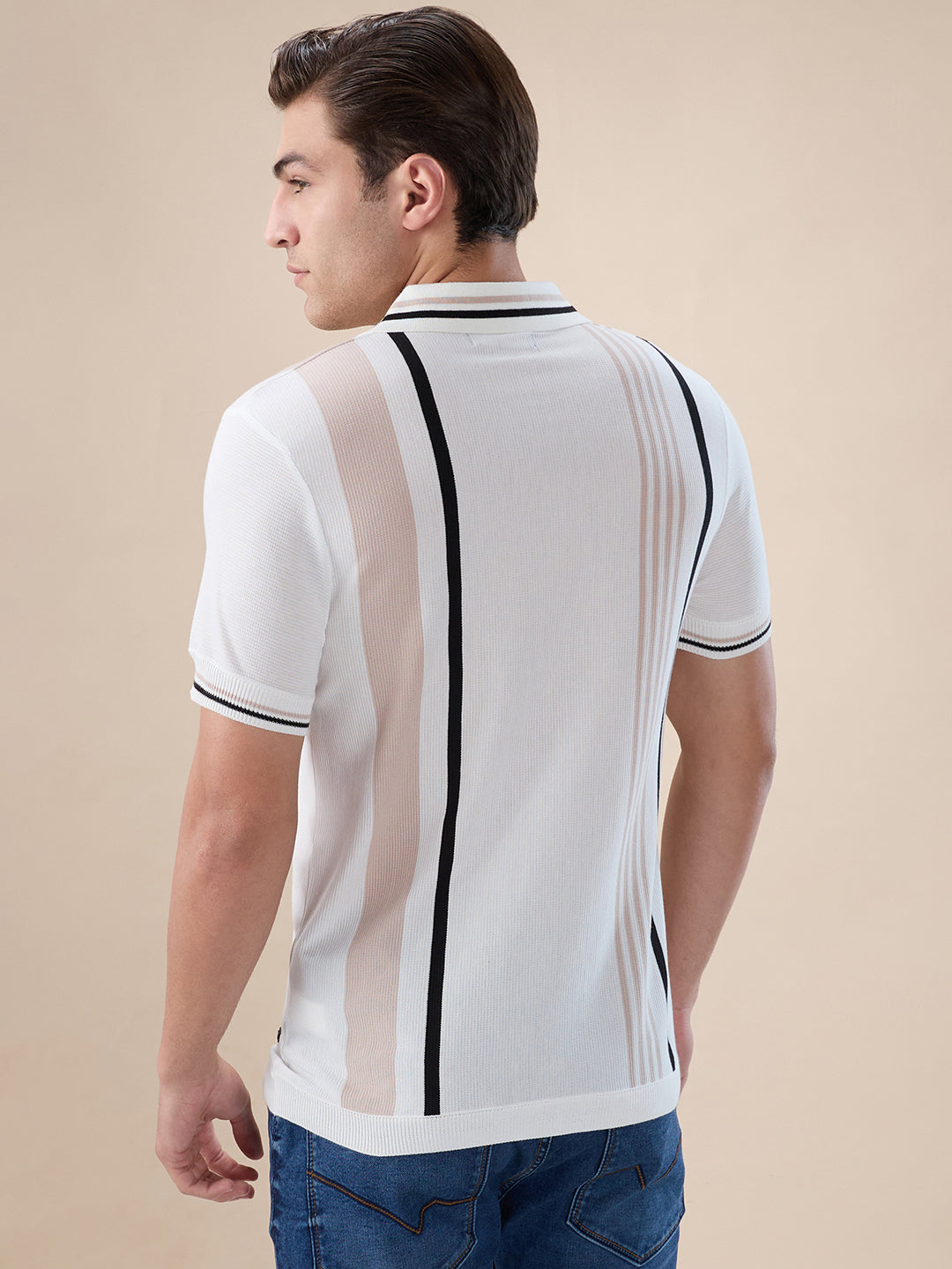 OFF WHITE Men's Striped Regular Fit Half Sleeve Polo T-shirt with Half Zipper and Tipped Detailing