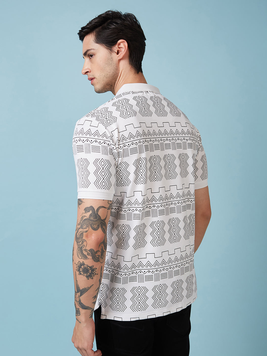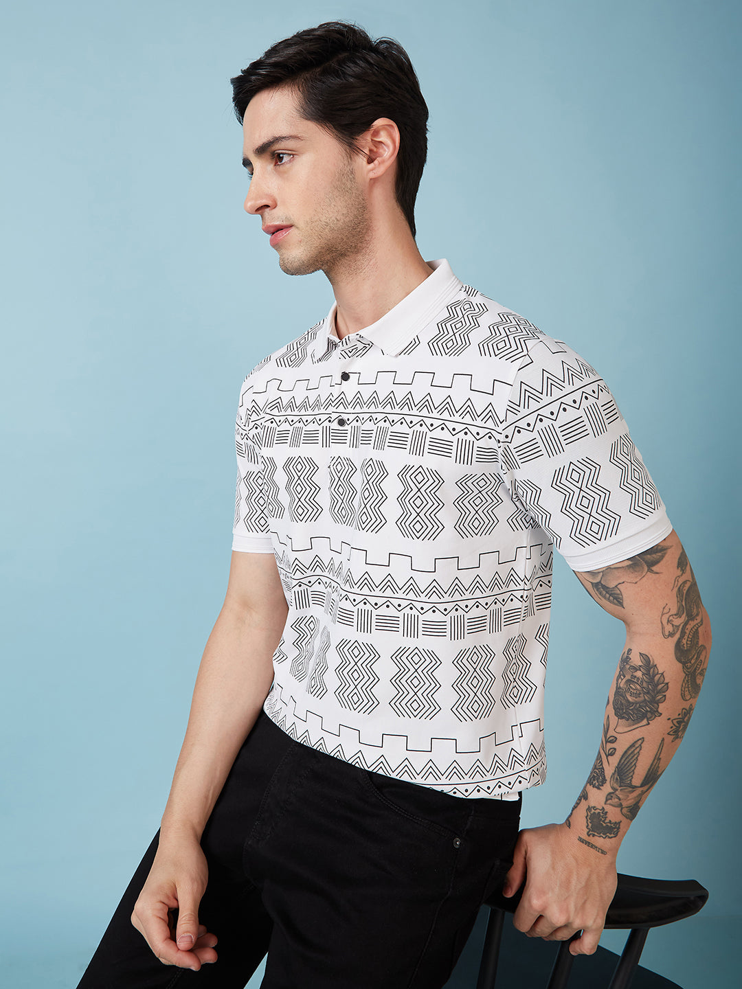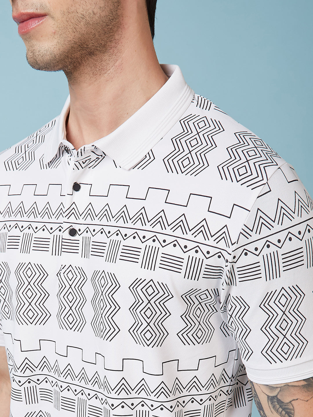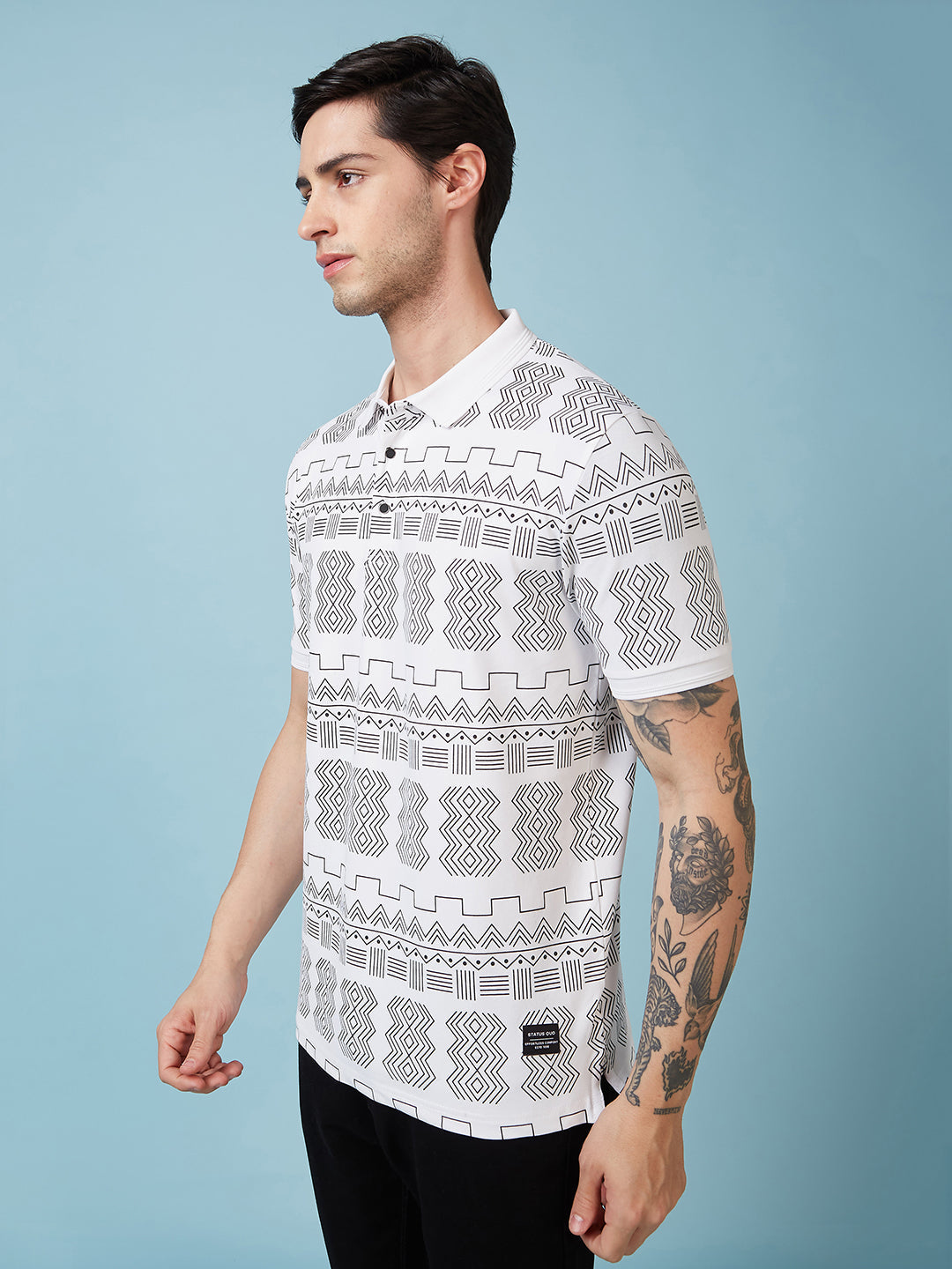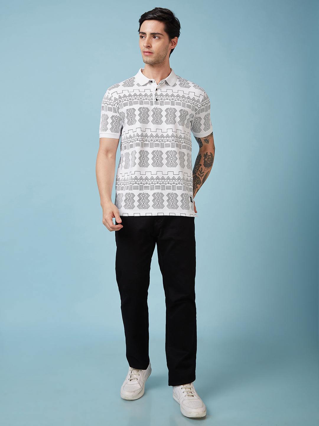 WHITE Mens Printed Polo Neck Half Sleeves T-shirt