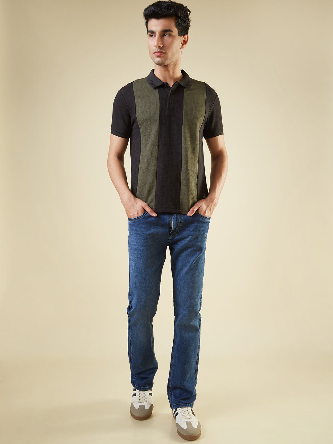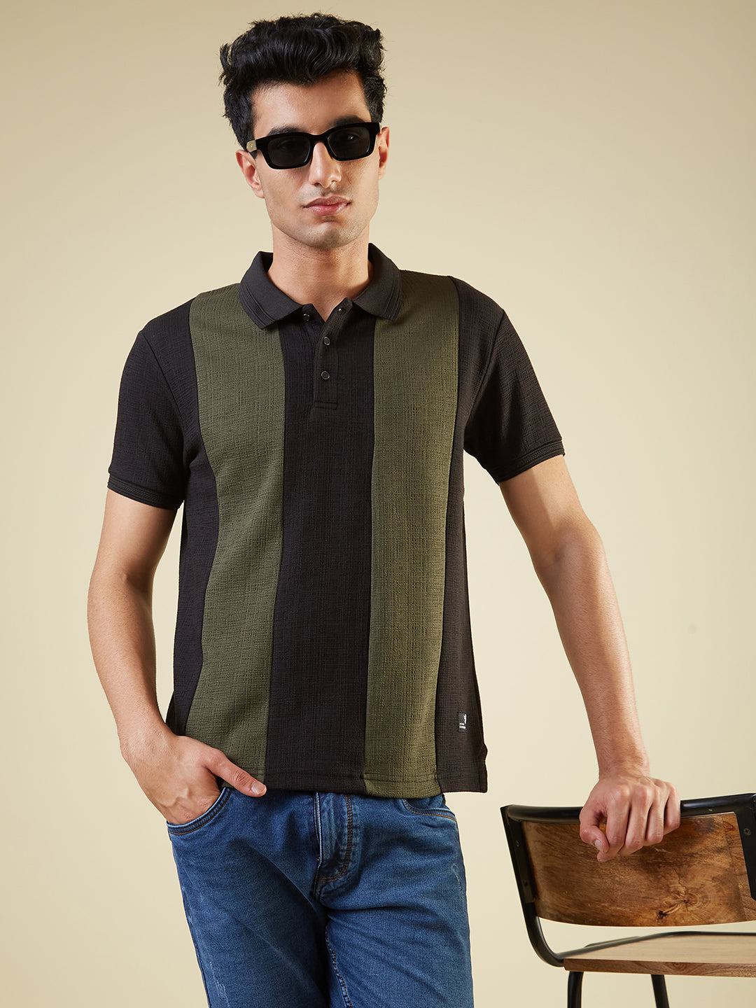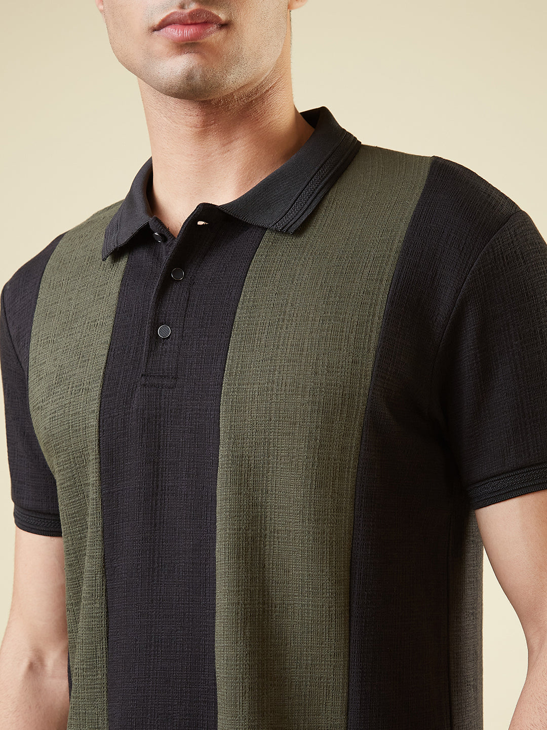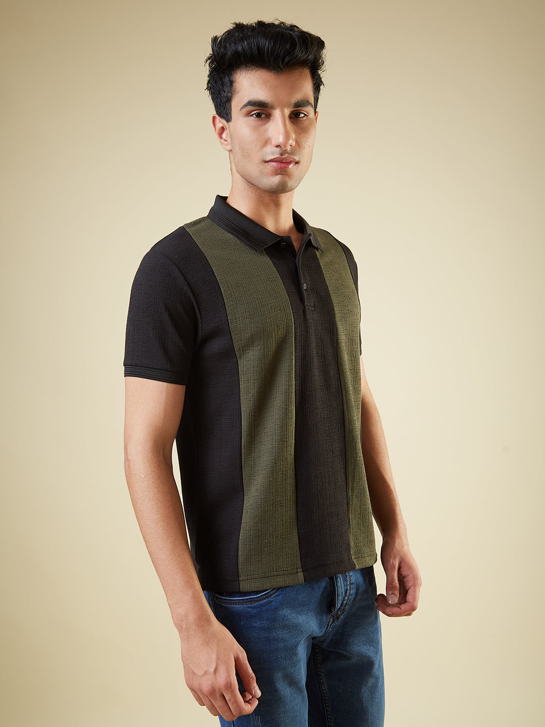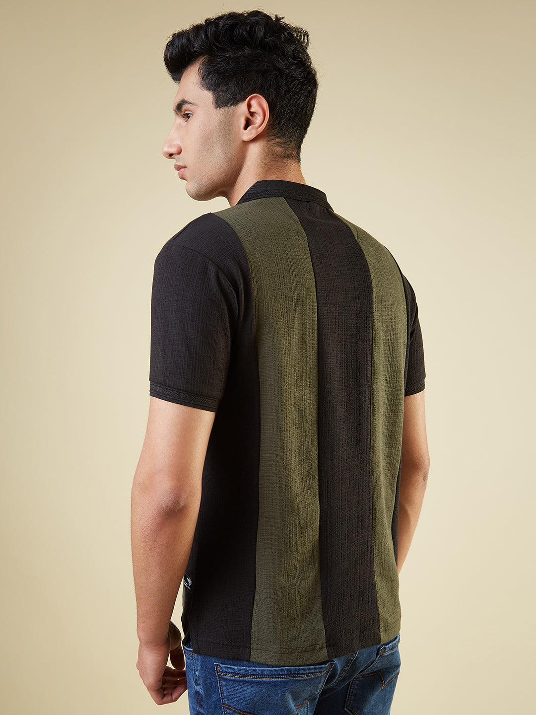 BLACK/OLIVE Mens Cut & Sew Cuban Collar with Half Sleeves T-shirt