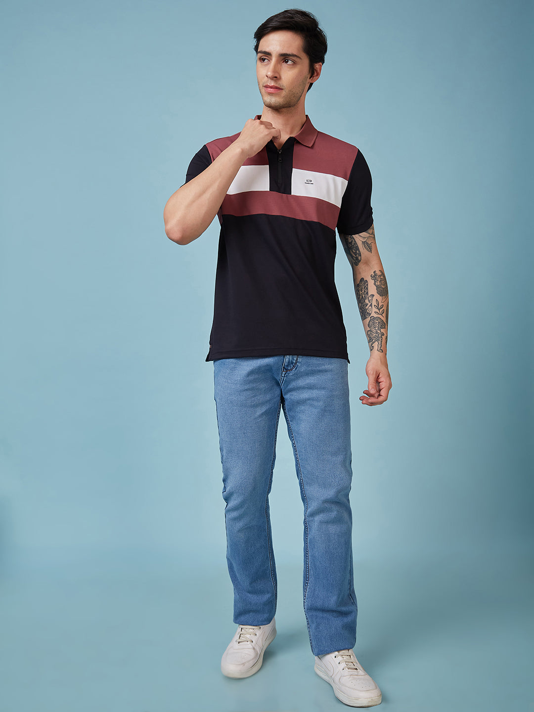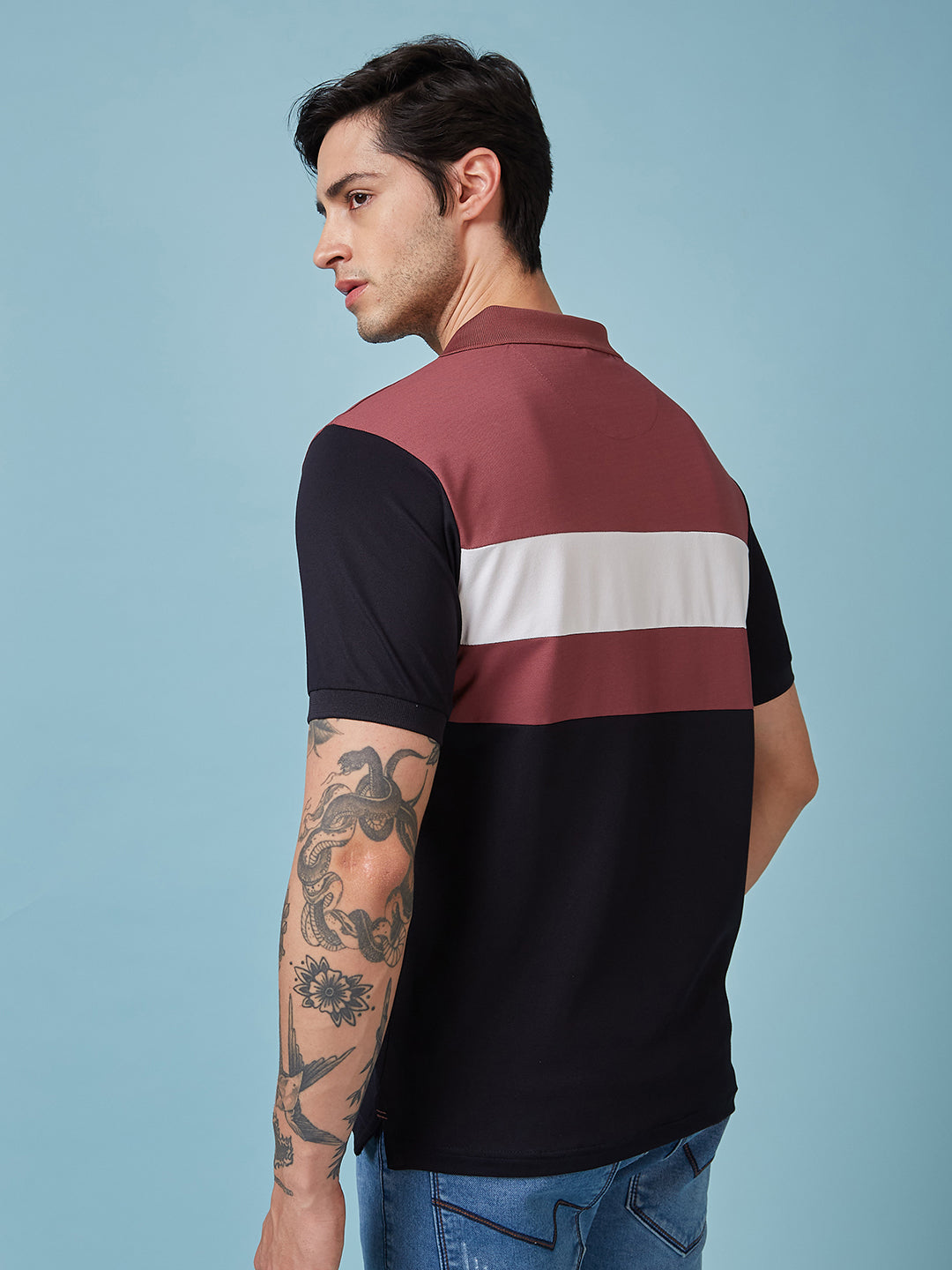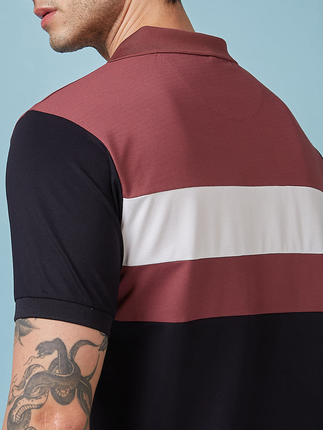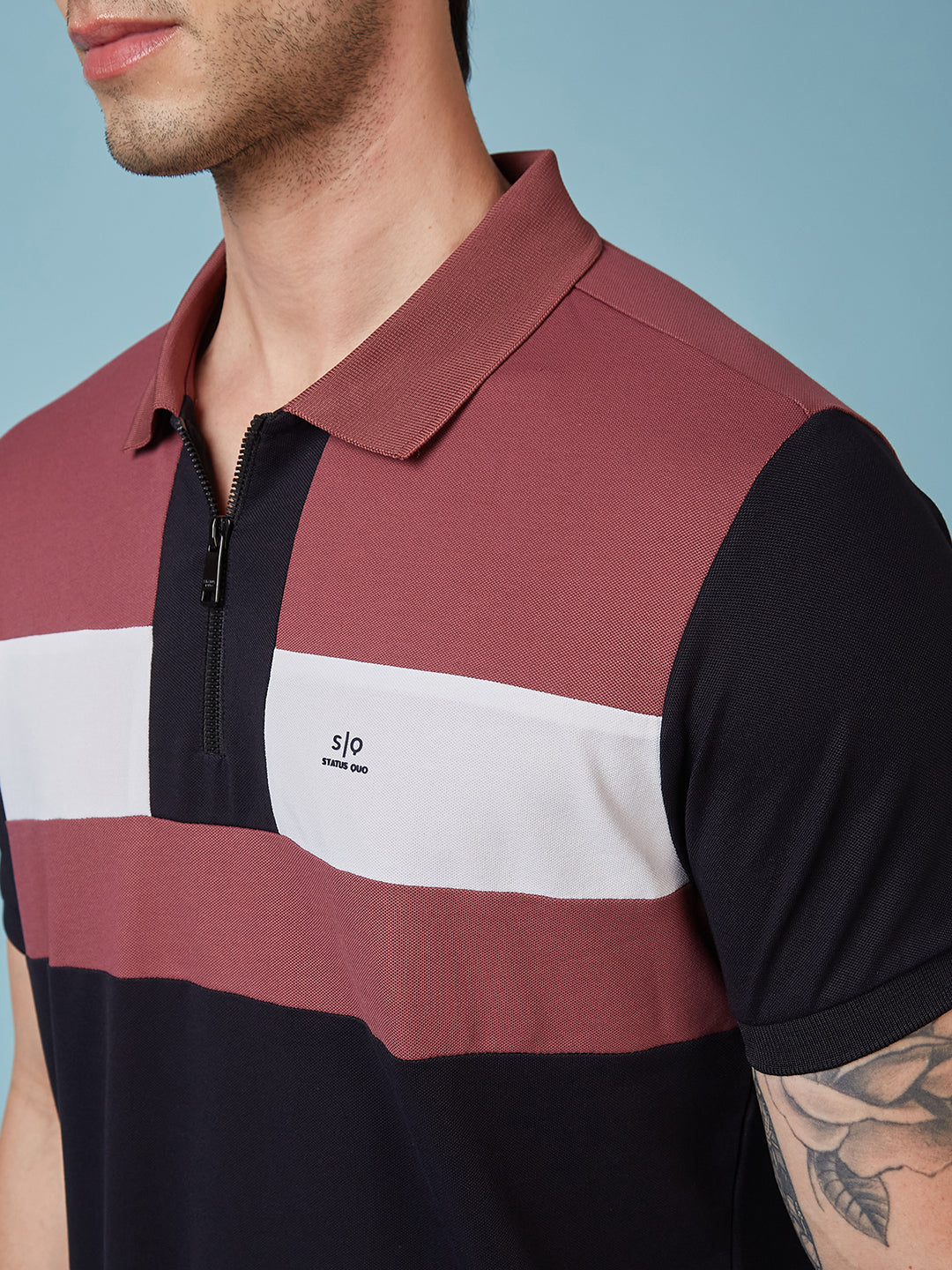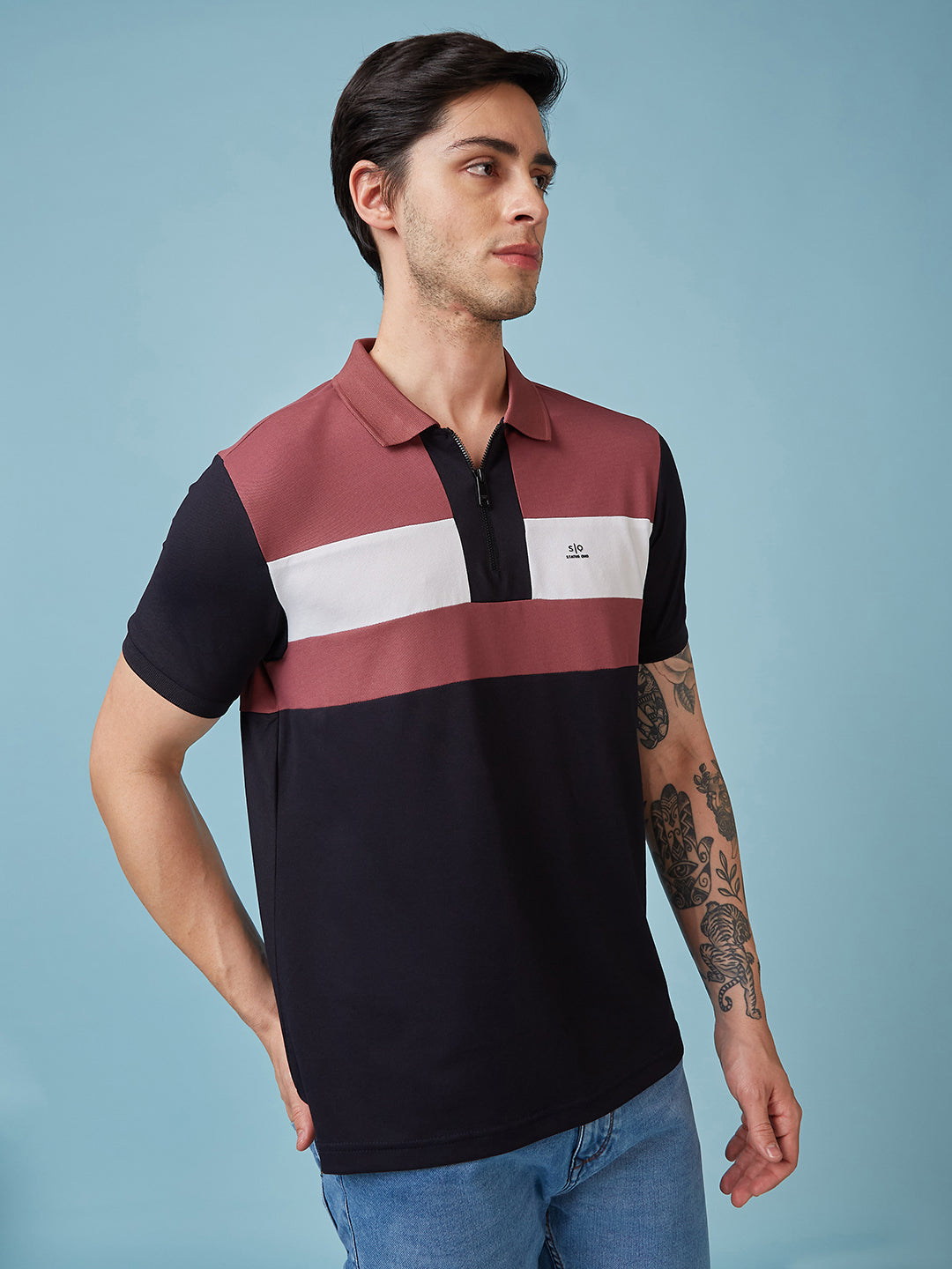 MAUVE/NAVY Mens Cut & Sew Polo Neck Half Sleeves T-shirt