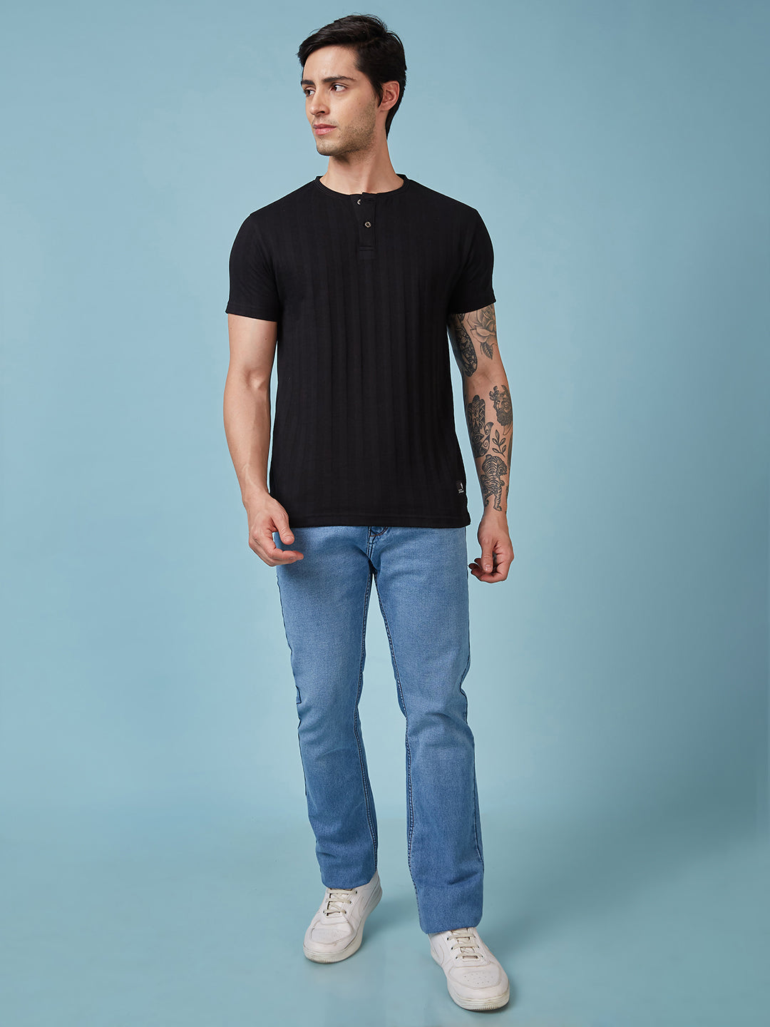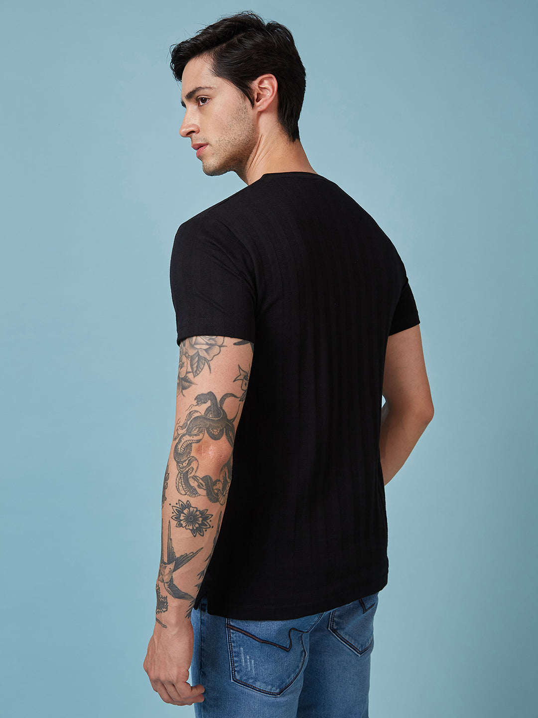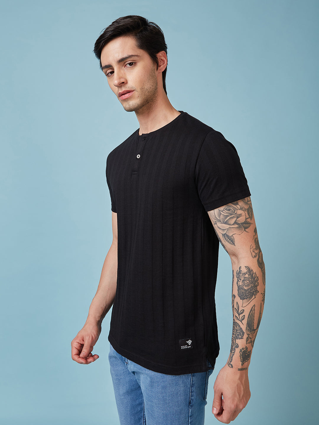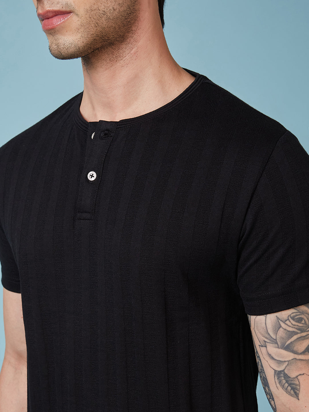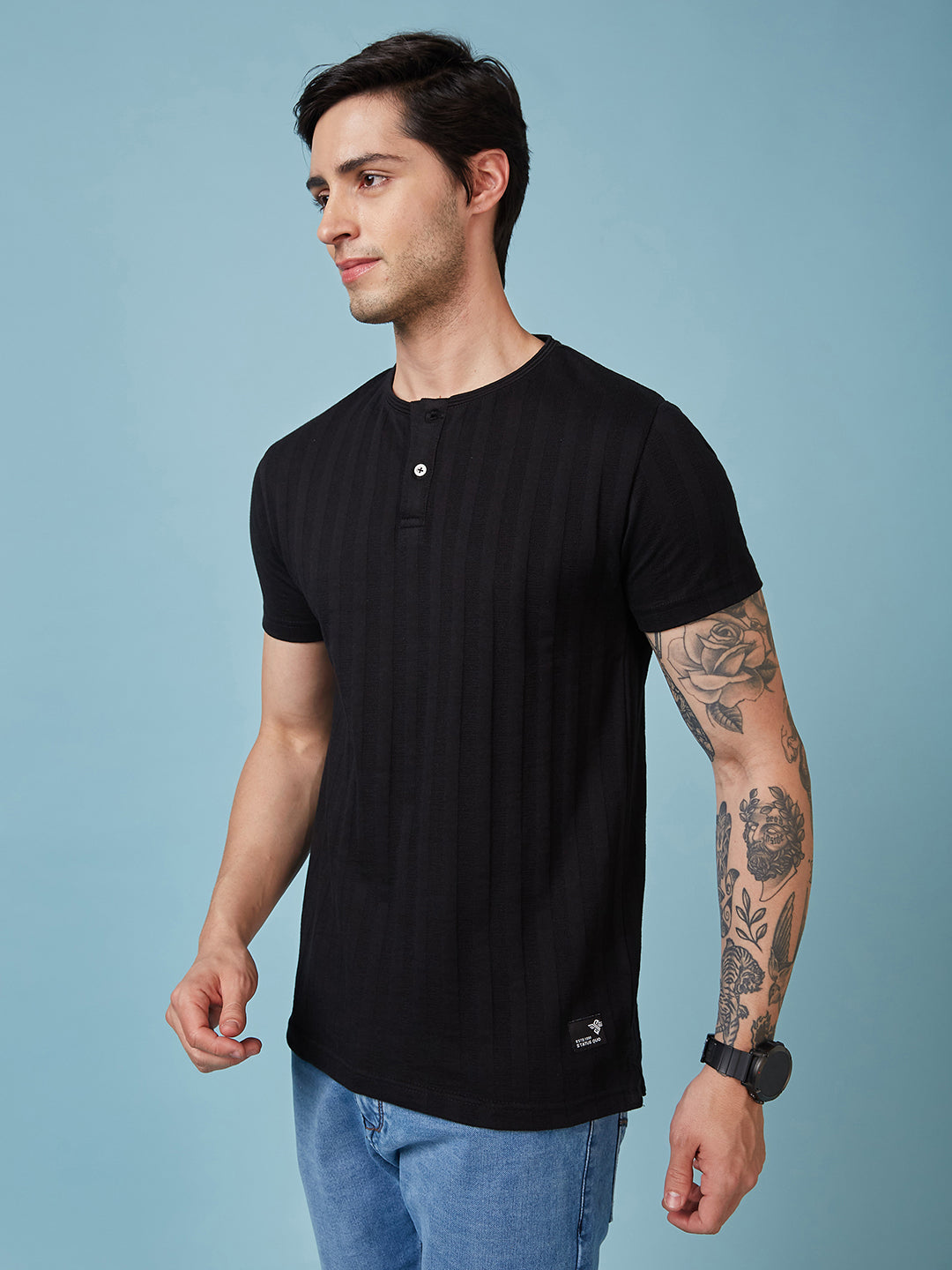 BLACK Mens Solid Henley Neck Half Sleeves T-shirt