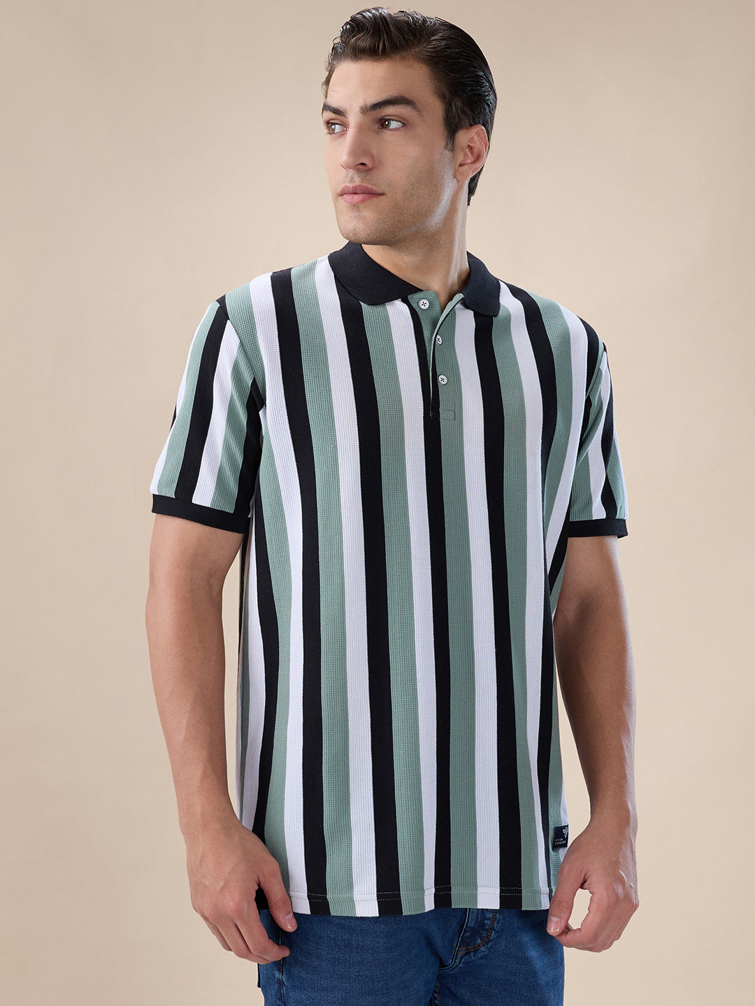 SAGE/NAVY Men's Striped Polo Collar Half Sleeves Regular Fit T-shirt