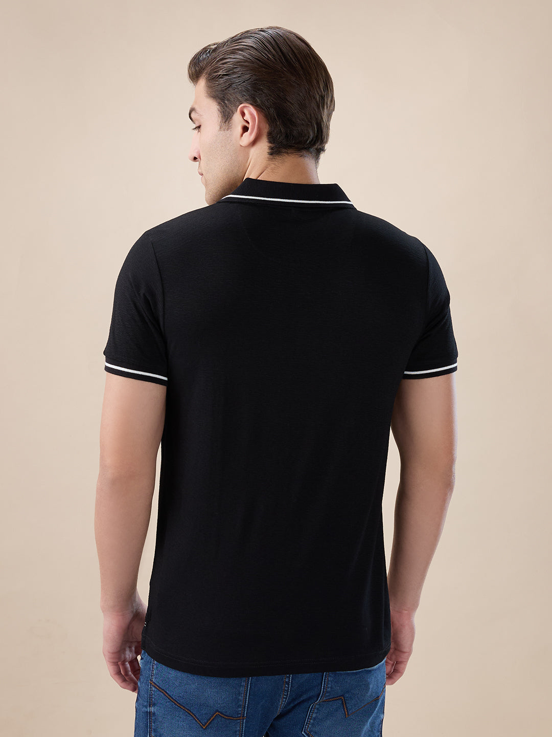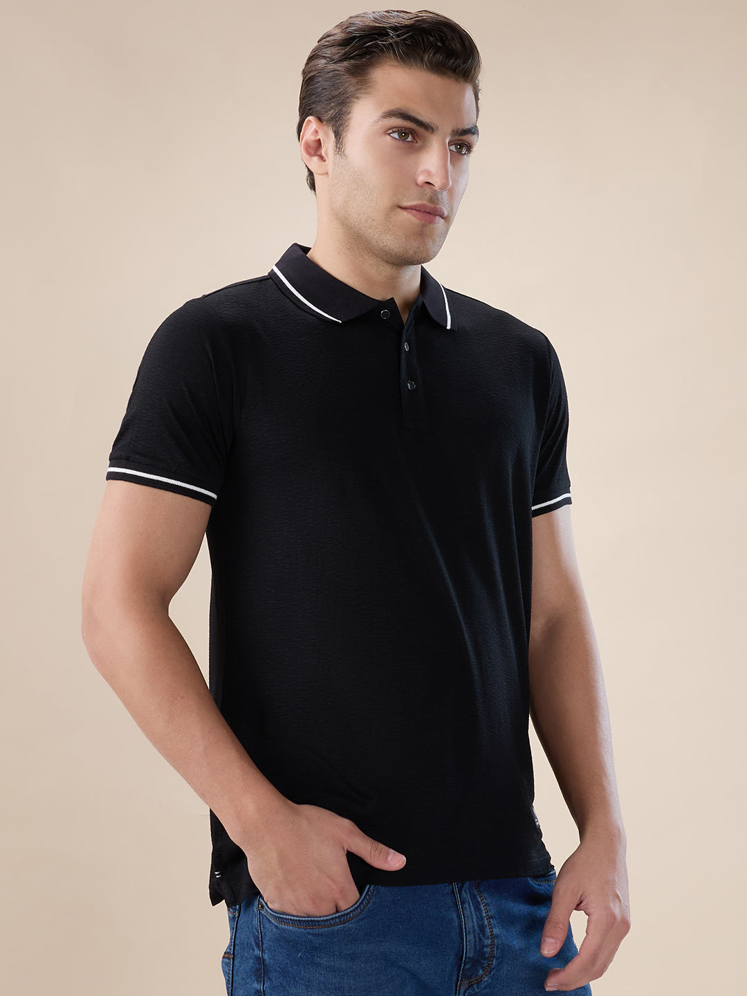 BLACK Men's Solid Textured Regular Fit Polo T-shirt with Button Closure and Tipped Details