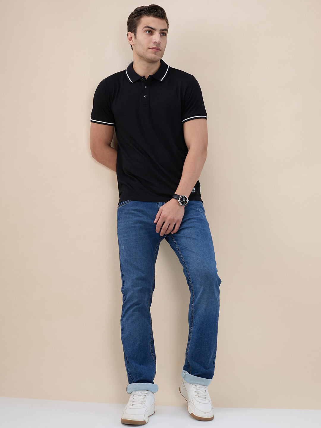 BLACK Men's Solid Textured Regular Fit Polo T-shirt with Button Closure and Tipped Details