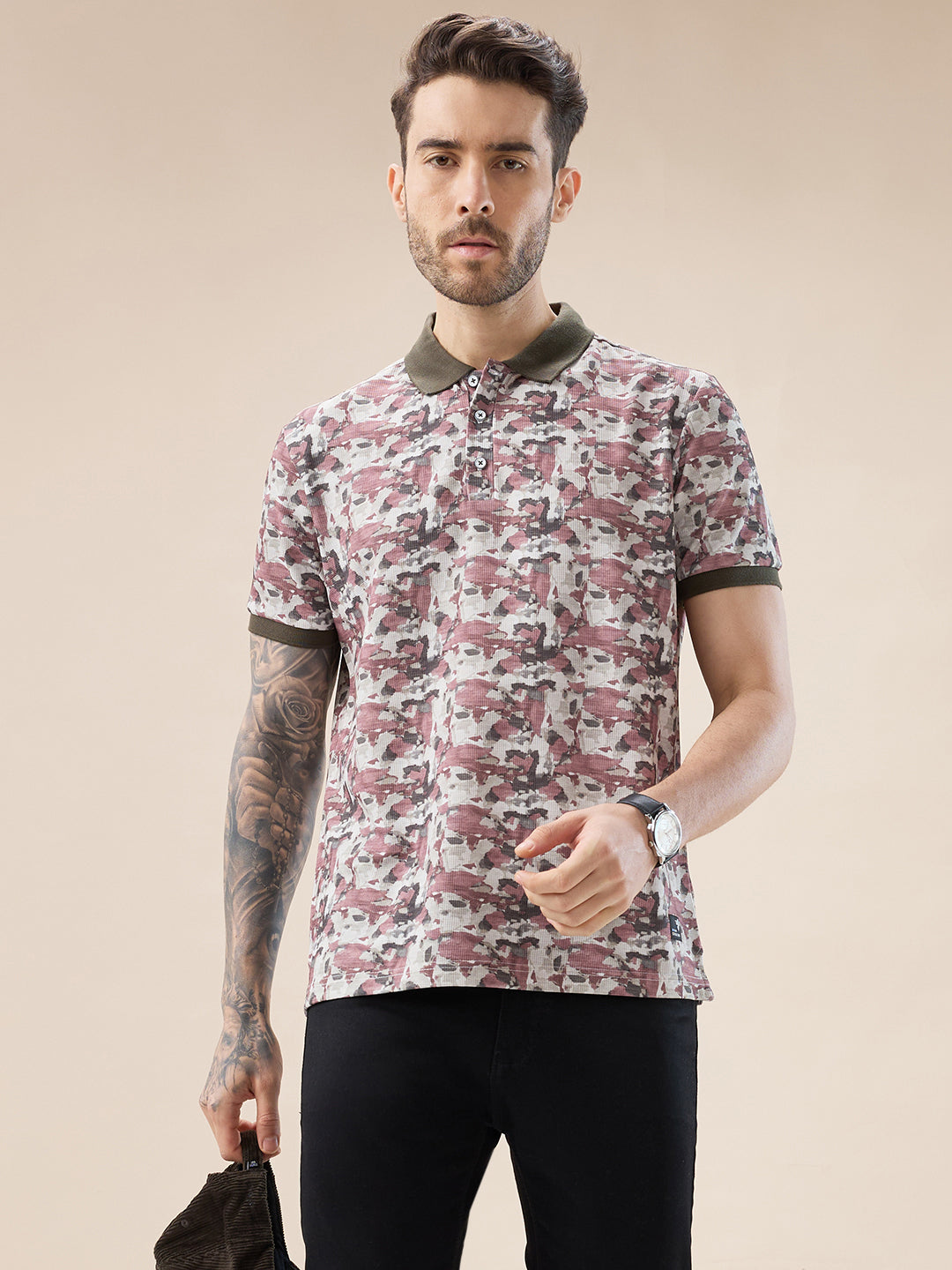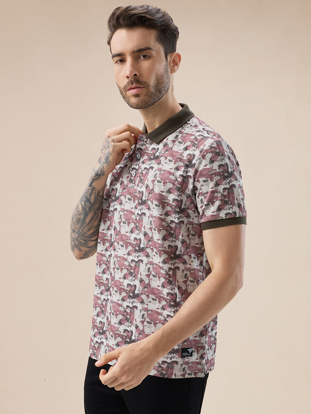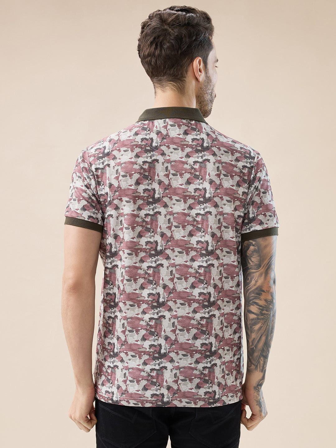MILITARY Men's Abstract Half Sleeves Regular Fit T-shirt with contrast Polo Collar