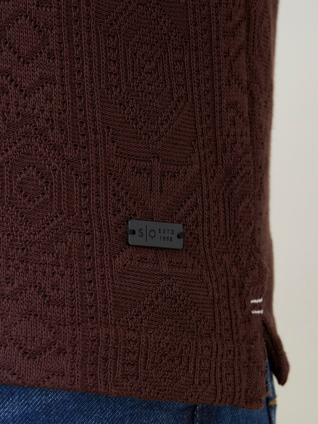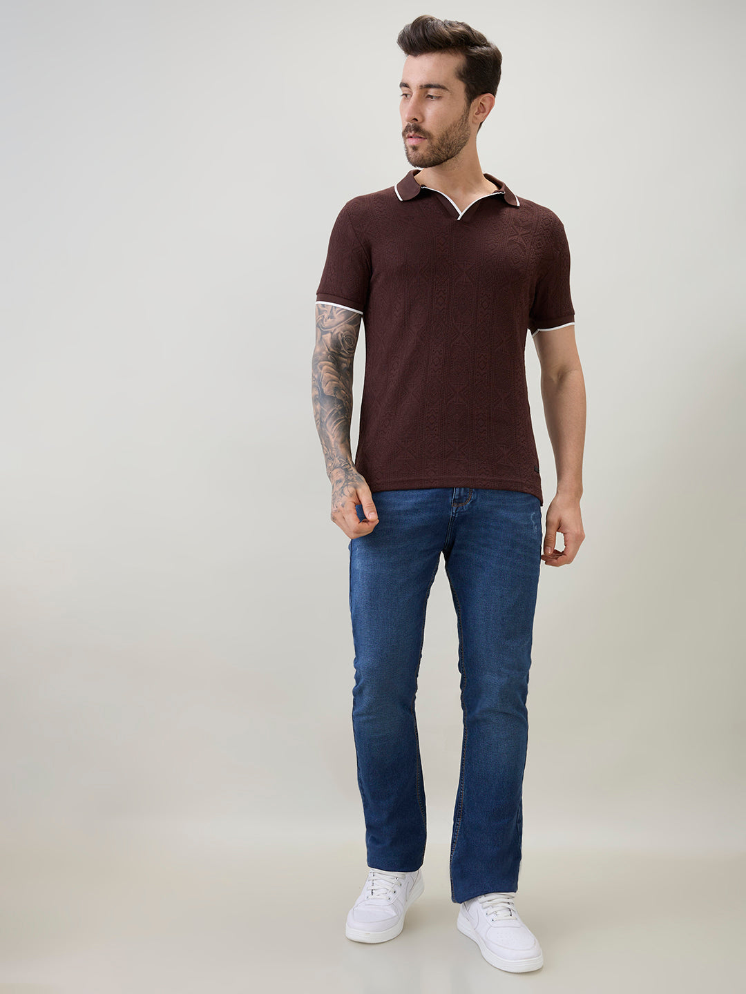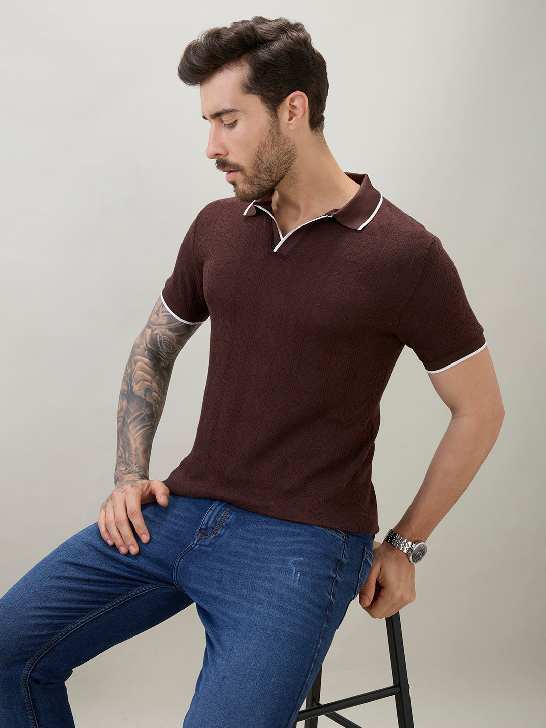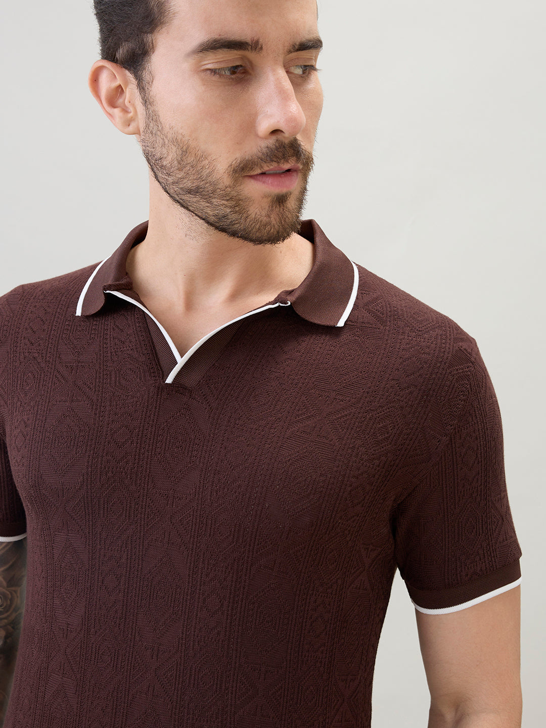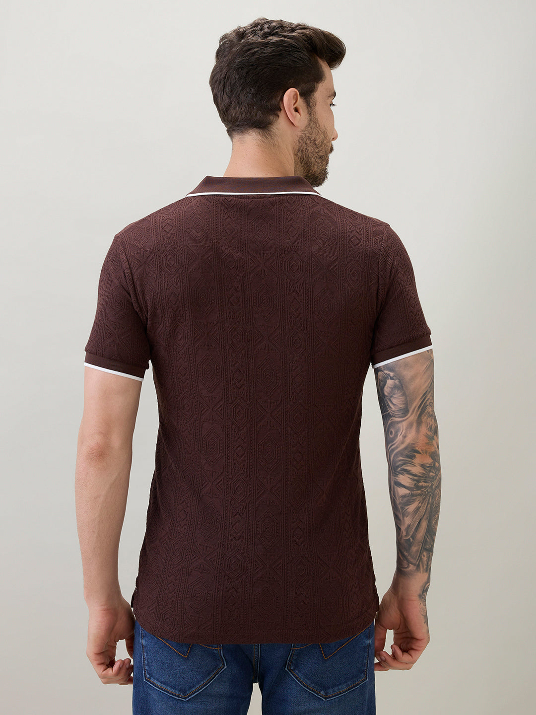 DK.BROWN Men's Solid Textured Half Sleeves Polo T-Shirt with Tipping Detail