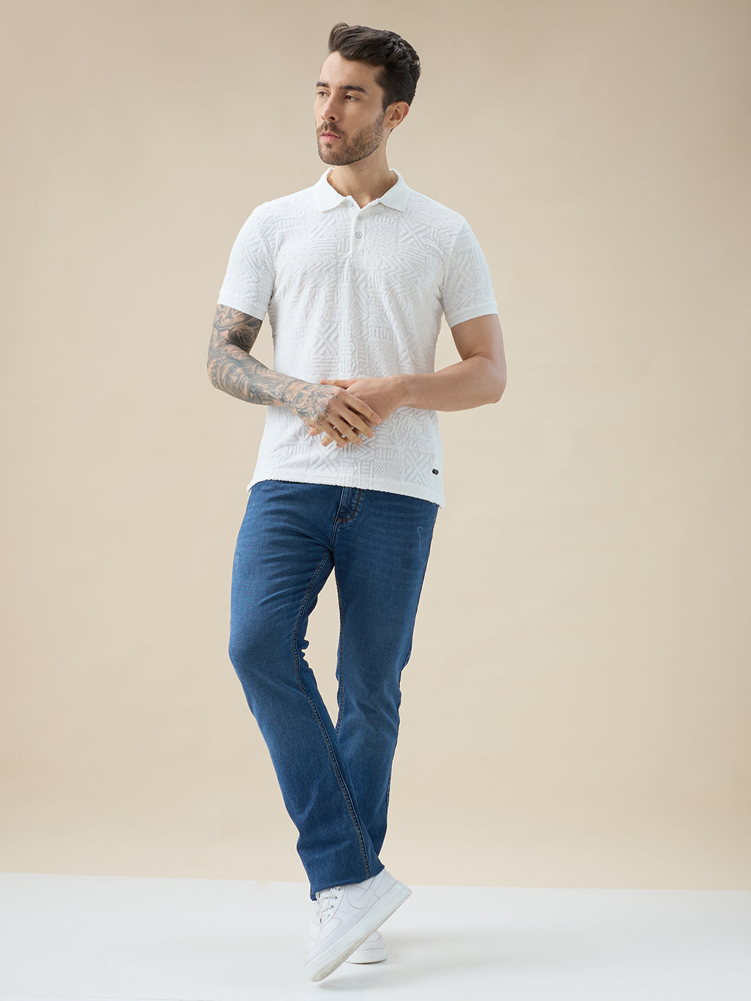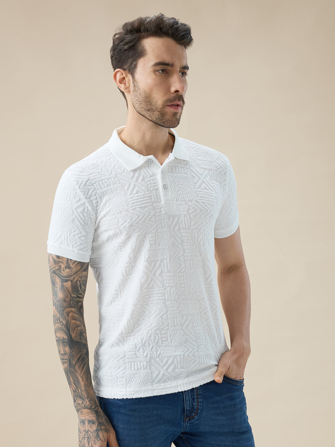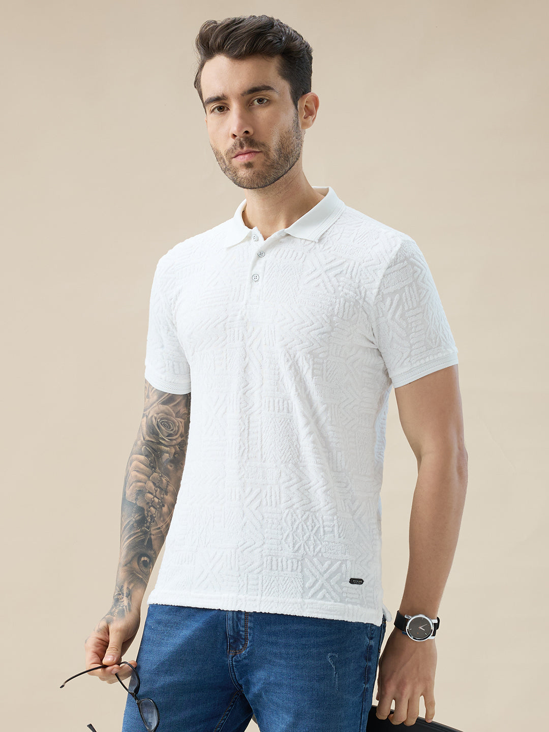 OFF WHITE Mens Geometric Textured Polo Neck Half Sleeve Regular Fit T-Shirt